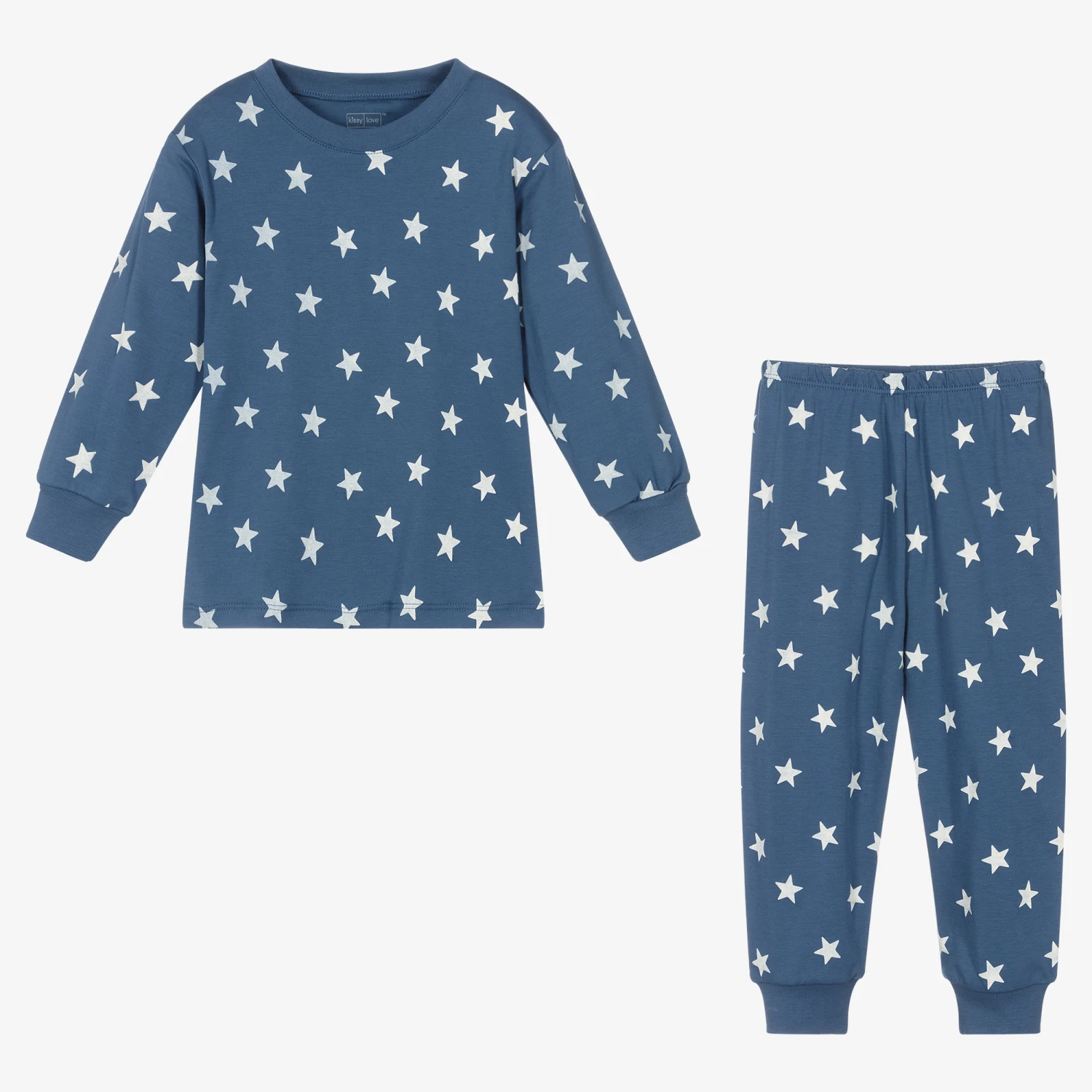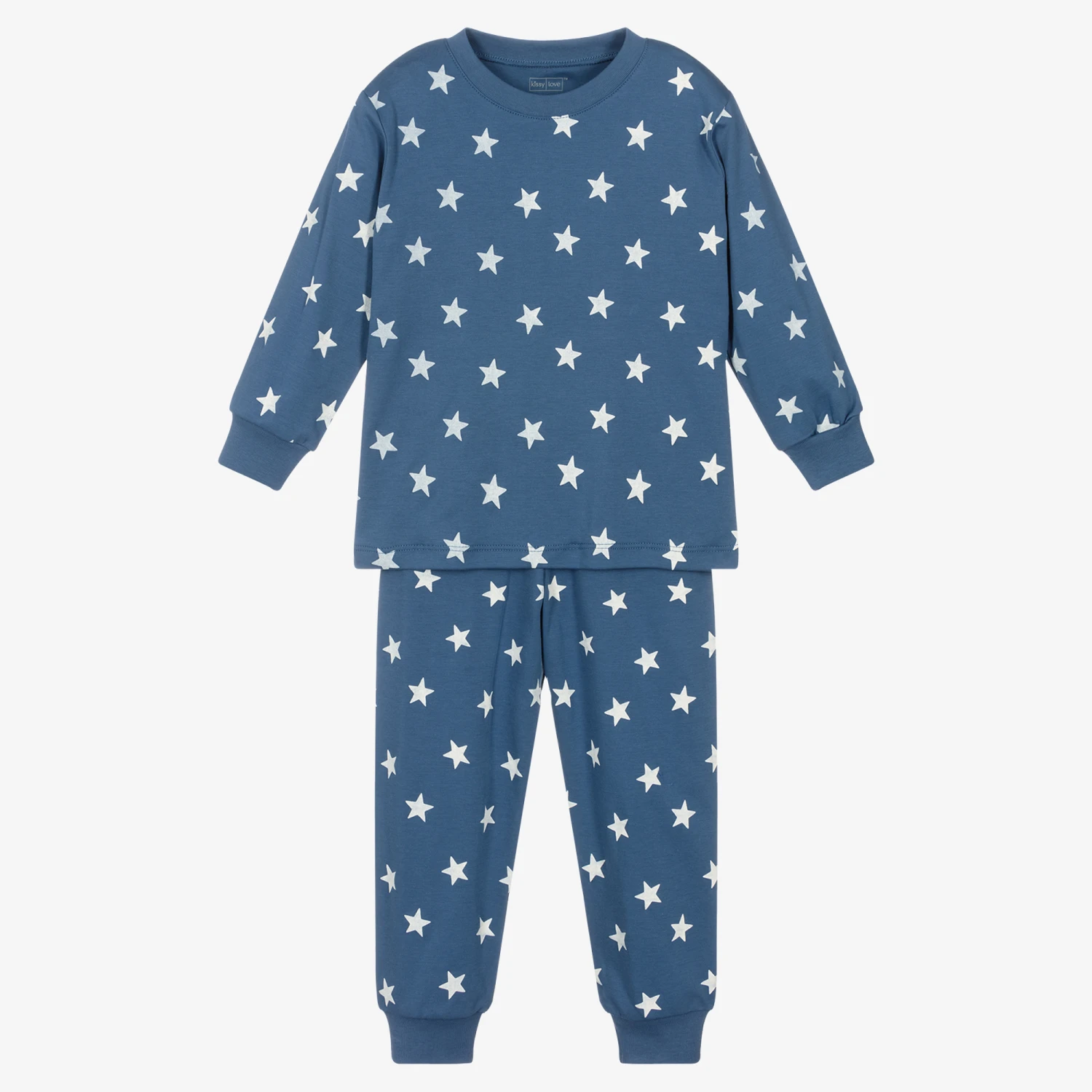 Mid-blue pyjamas for boys by Kissy Kissy, patterned with white stars. Made in super soft Pima cotton jersey, they are beautifully comfortable and have ribbed trims for extra cosiness. They have an elasticated waist to ensure a comfortable fit for little tummies.