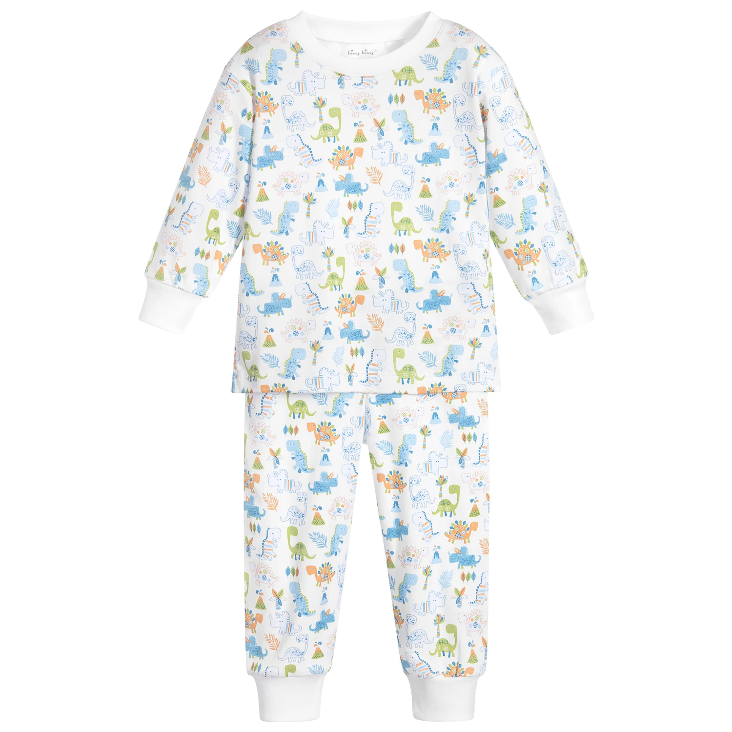 Boys white pyjamas by Kissy Kissy, with a blue and orange dinosaur pattern. They are made in the softest Pima cotton jersey.