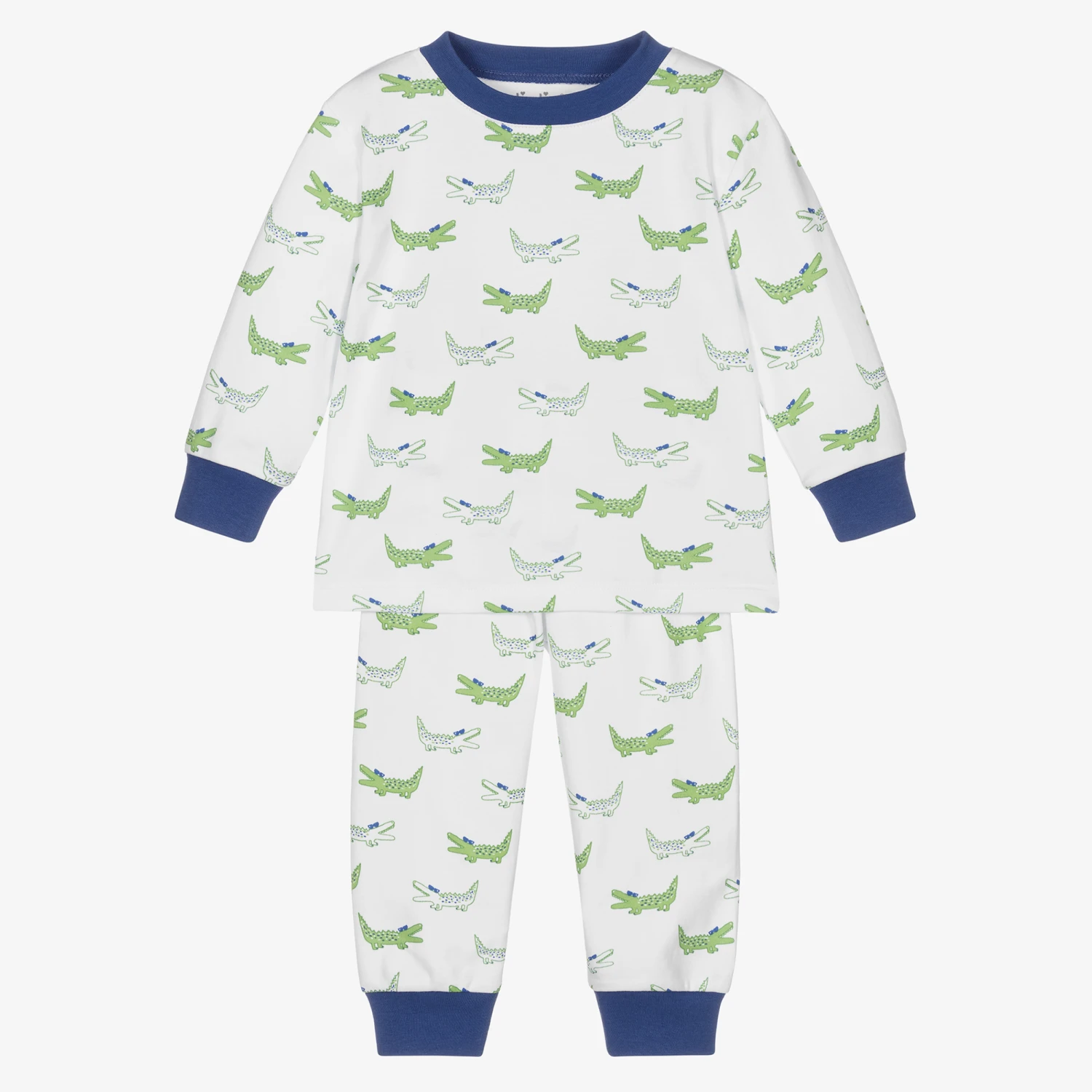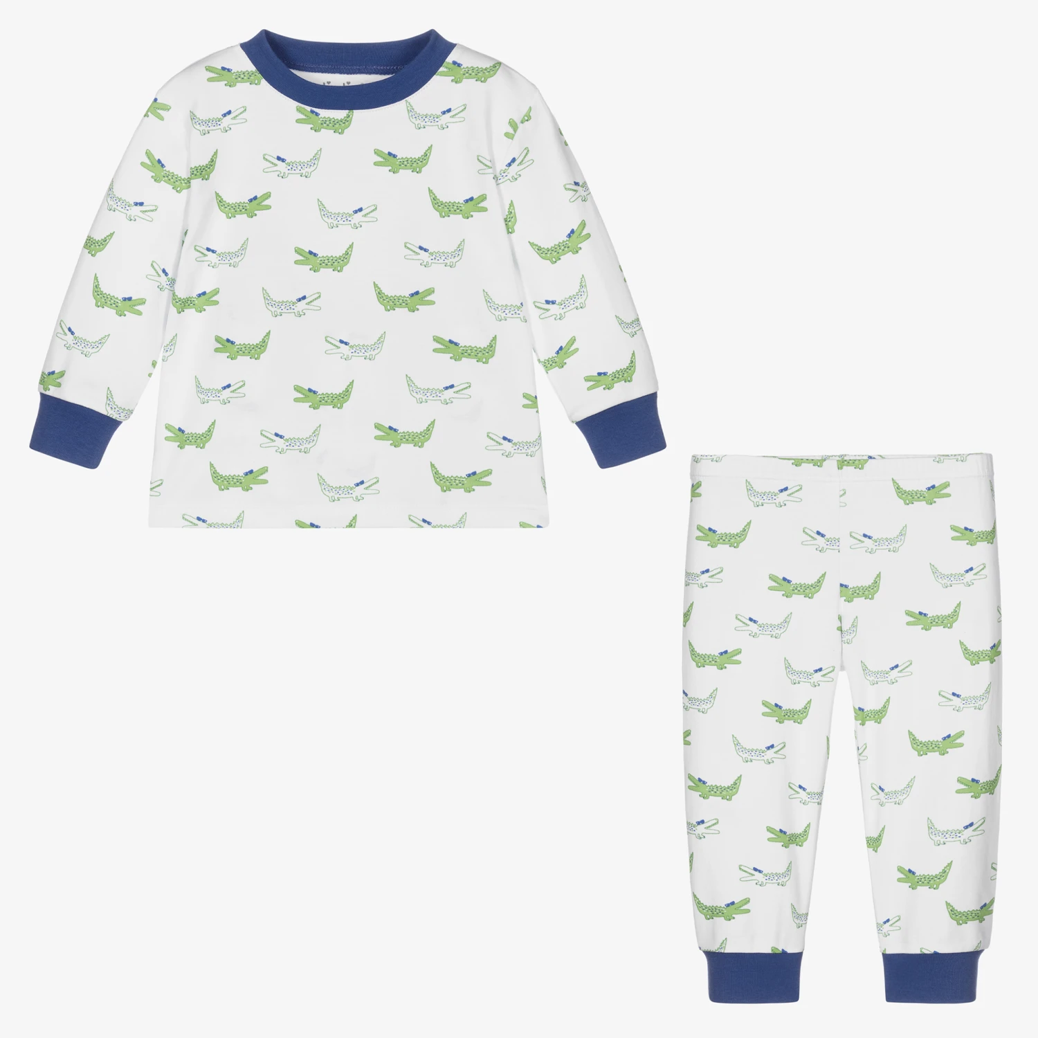 Cute white pyjamas for boys by Kissy Kissy, made in super soft Pima cotton jersey. Both items have a fun green and blue alligator pattern, with contrasting blue trims.