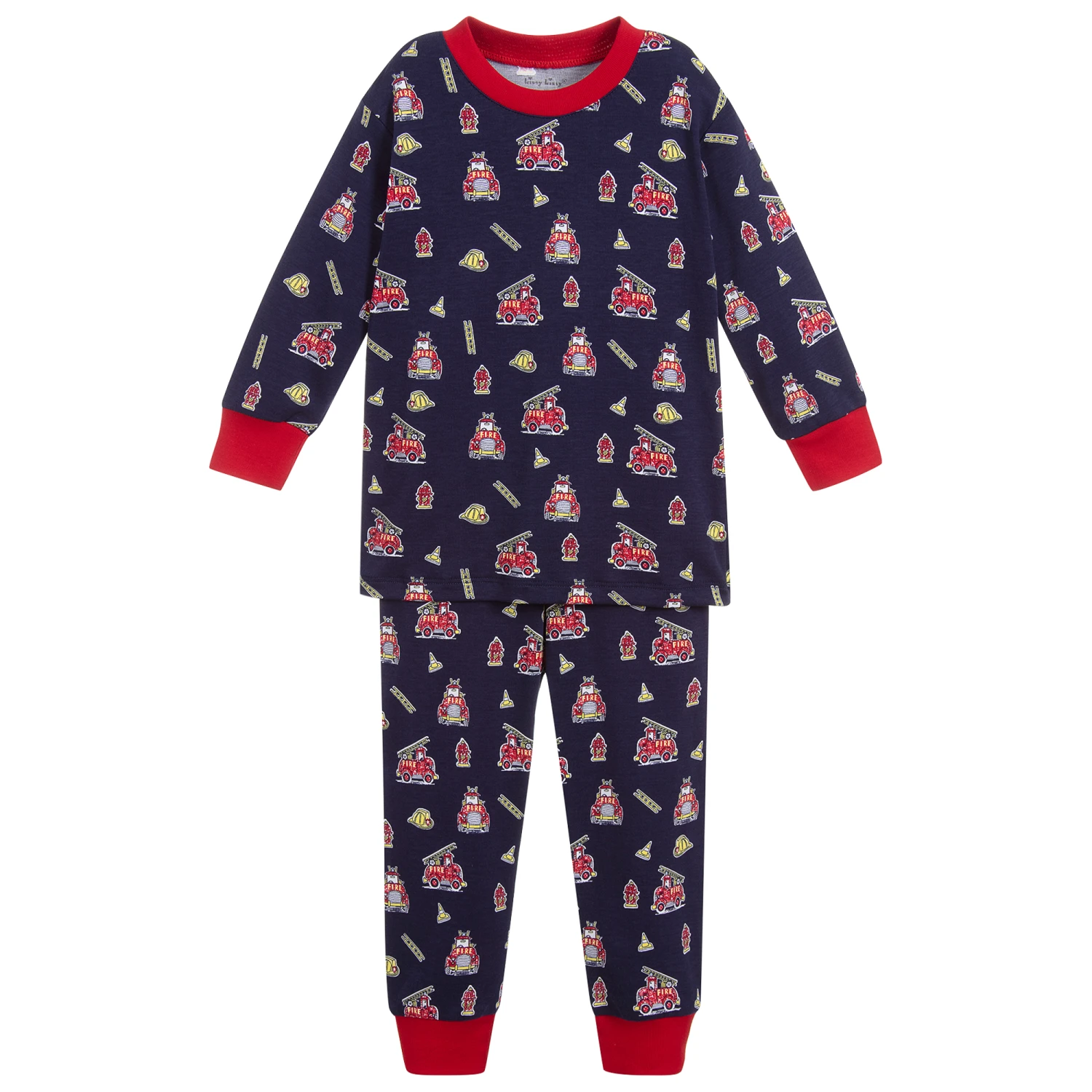 Navy blue pyjamas for boys by Kissy Kissy, with a red collar and cuffs. Made in super soft Pima cotton jersey, they have a fire truck print in red and yellow.