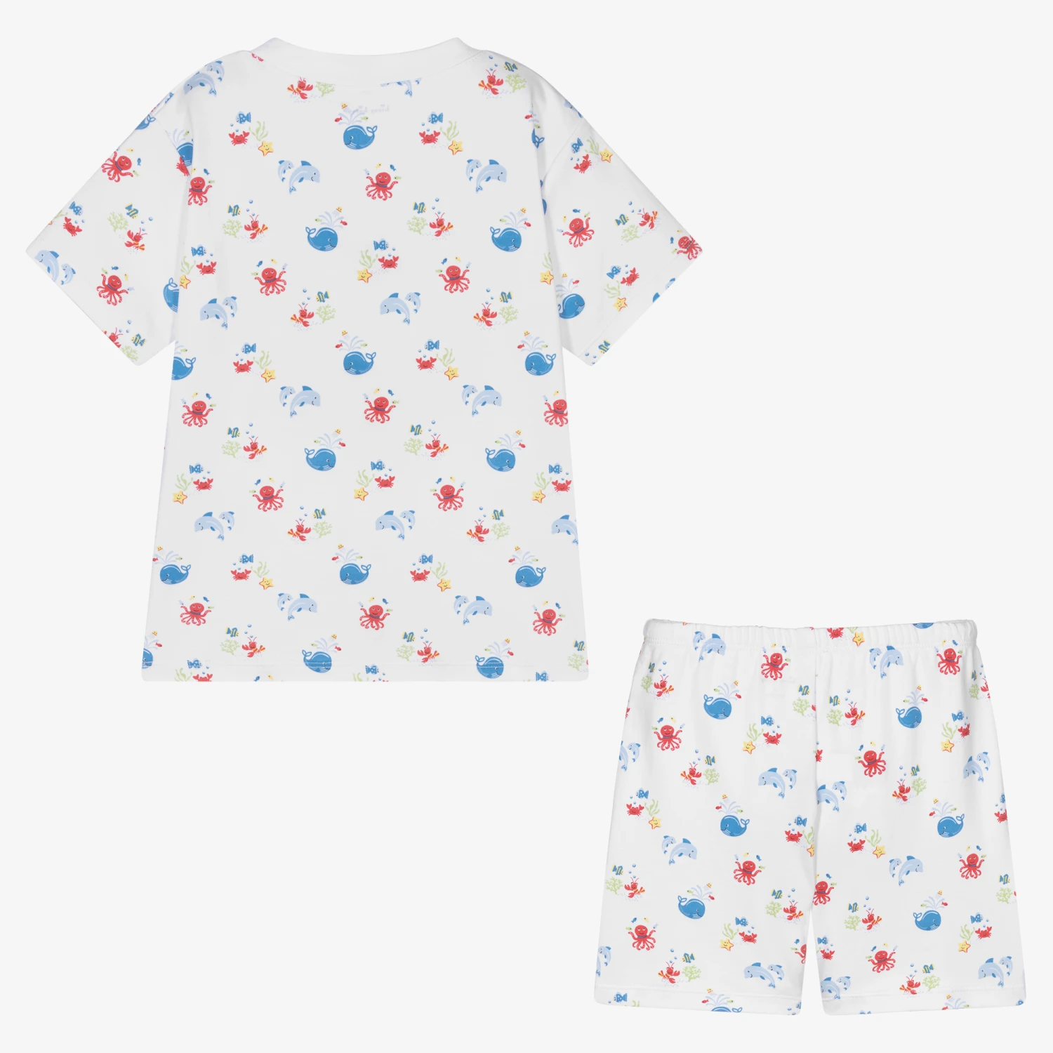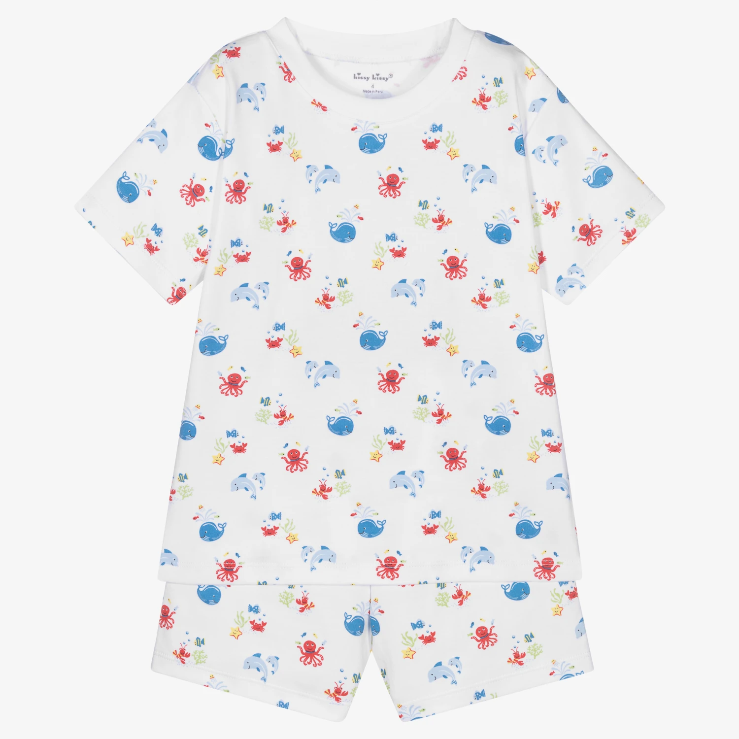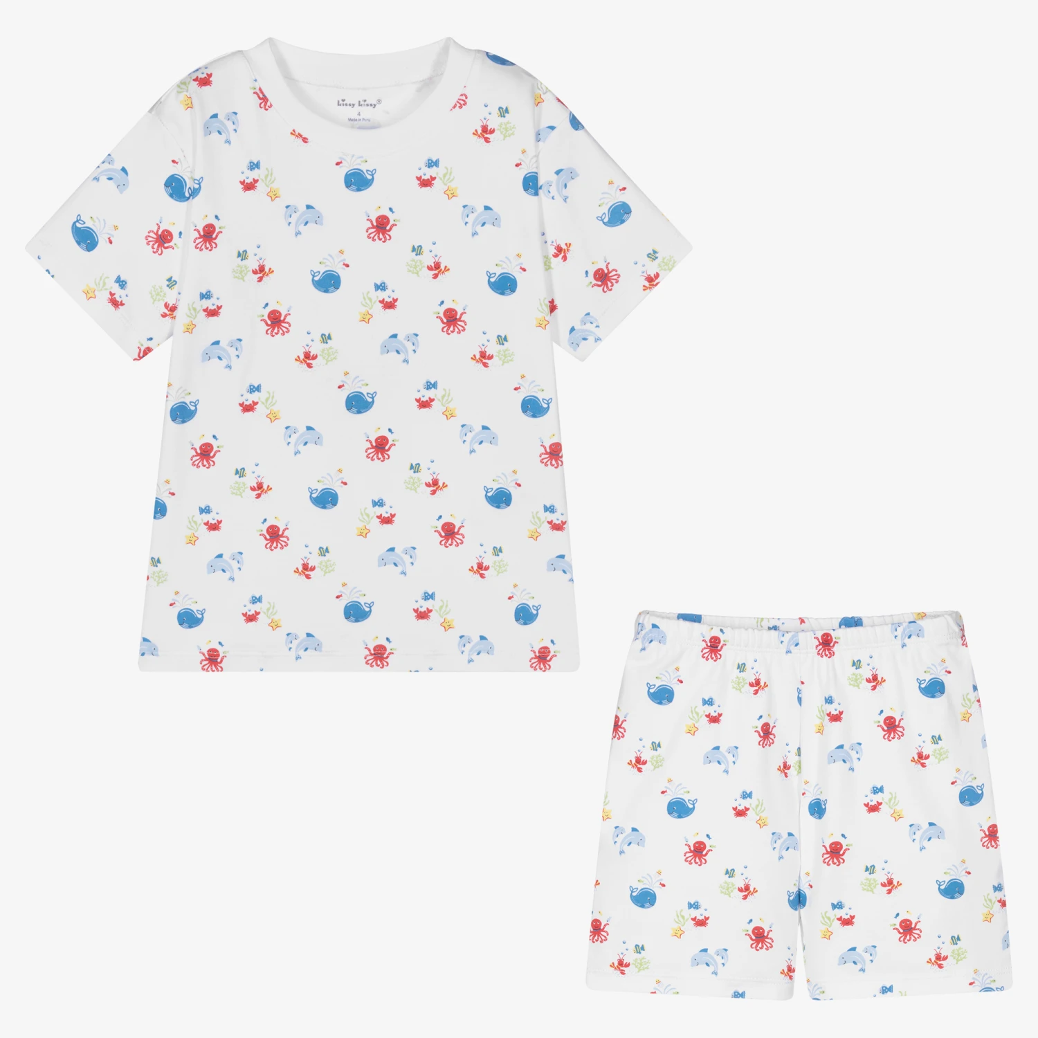 White with a red and blue sea creature print, these short pyjamas for boys are by Kissy Kissy. Super soft and comfortable, they are made in Pima cotton jersey. The top has a ribbed neckline and the shorts have an elasticated waist.
