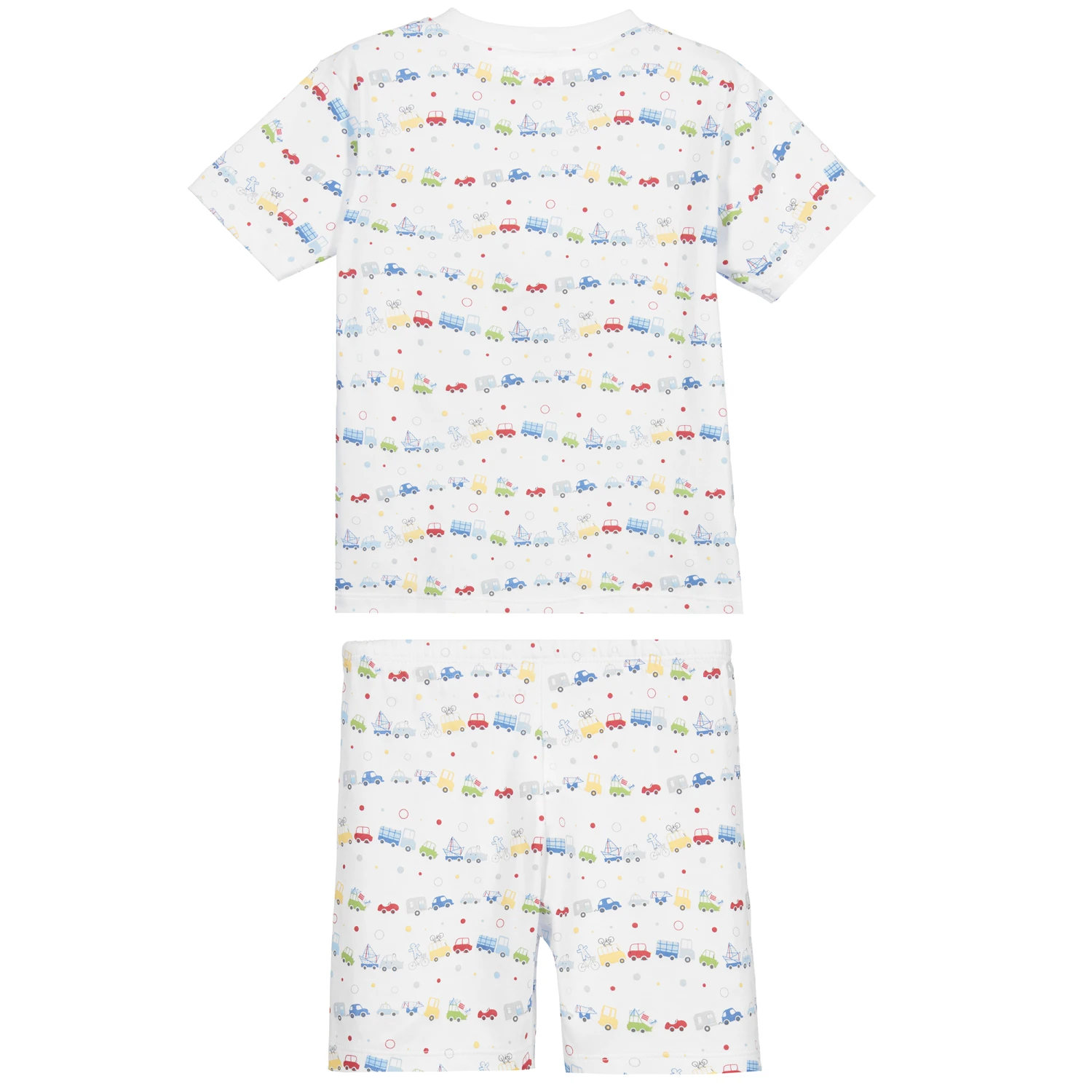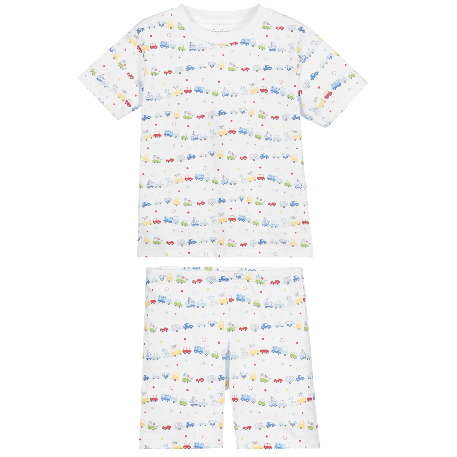 White short pyjamas for boys by Kissy Kissy, made in super soft and stretchy Pima cotton jersey, with a colourful vehicle print.