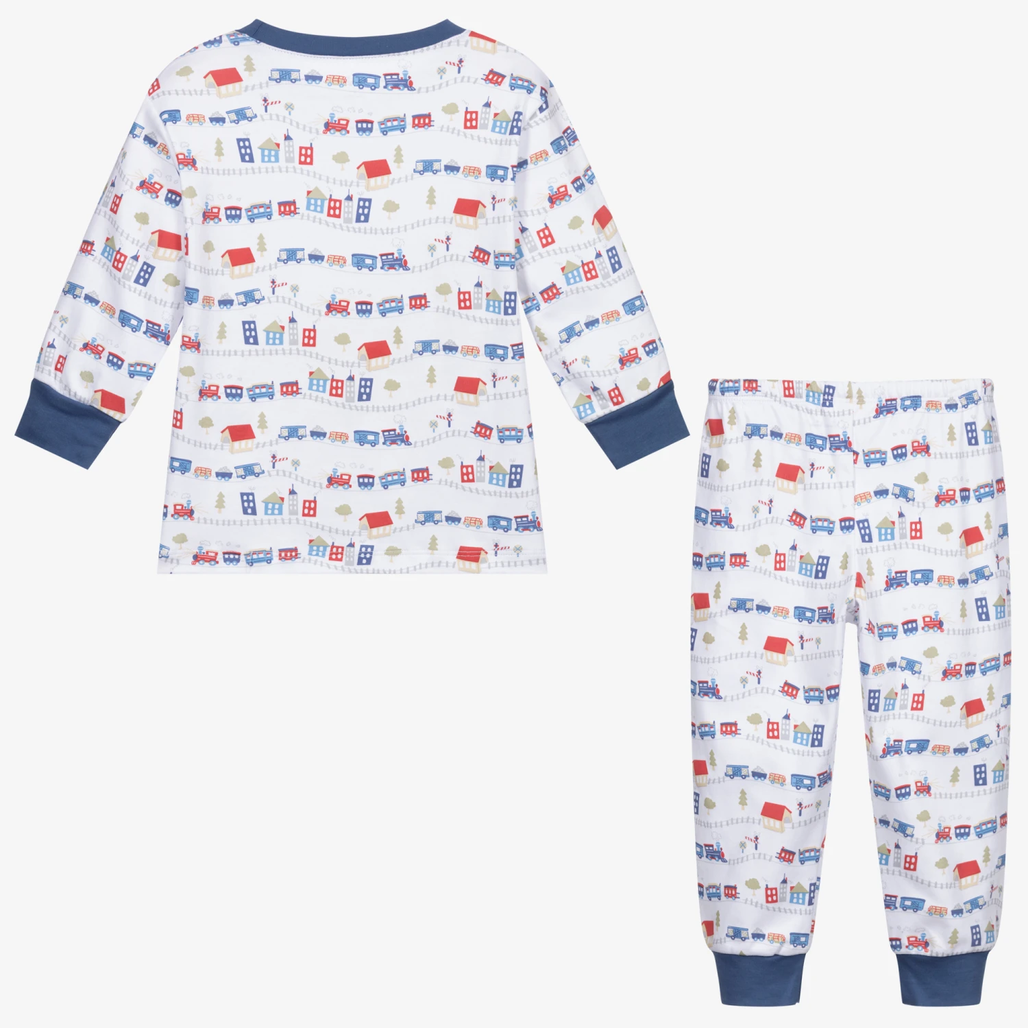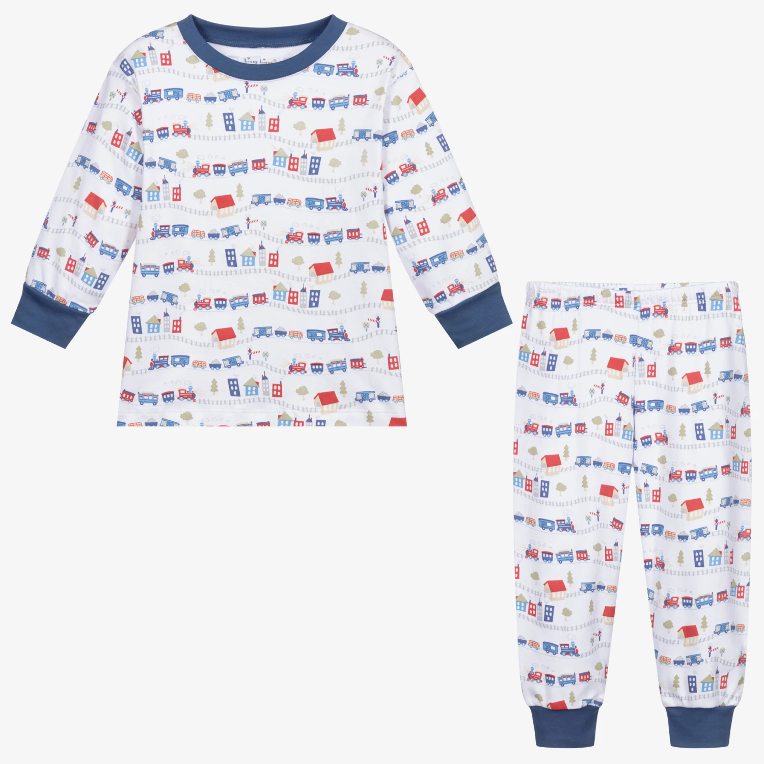 Younger boys pyjama set by Kissy Kissy. Made with super soft and stretchy Pima cotton jersey, these sweet train and village house printed pyjamas have steel blue trims and elasticated cuffs. The bottoms have an elasticated waist for comfort.