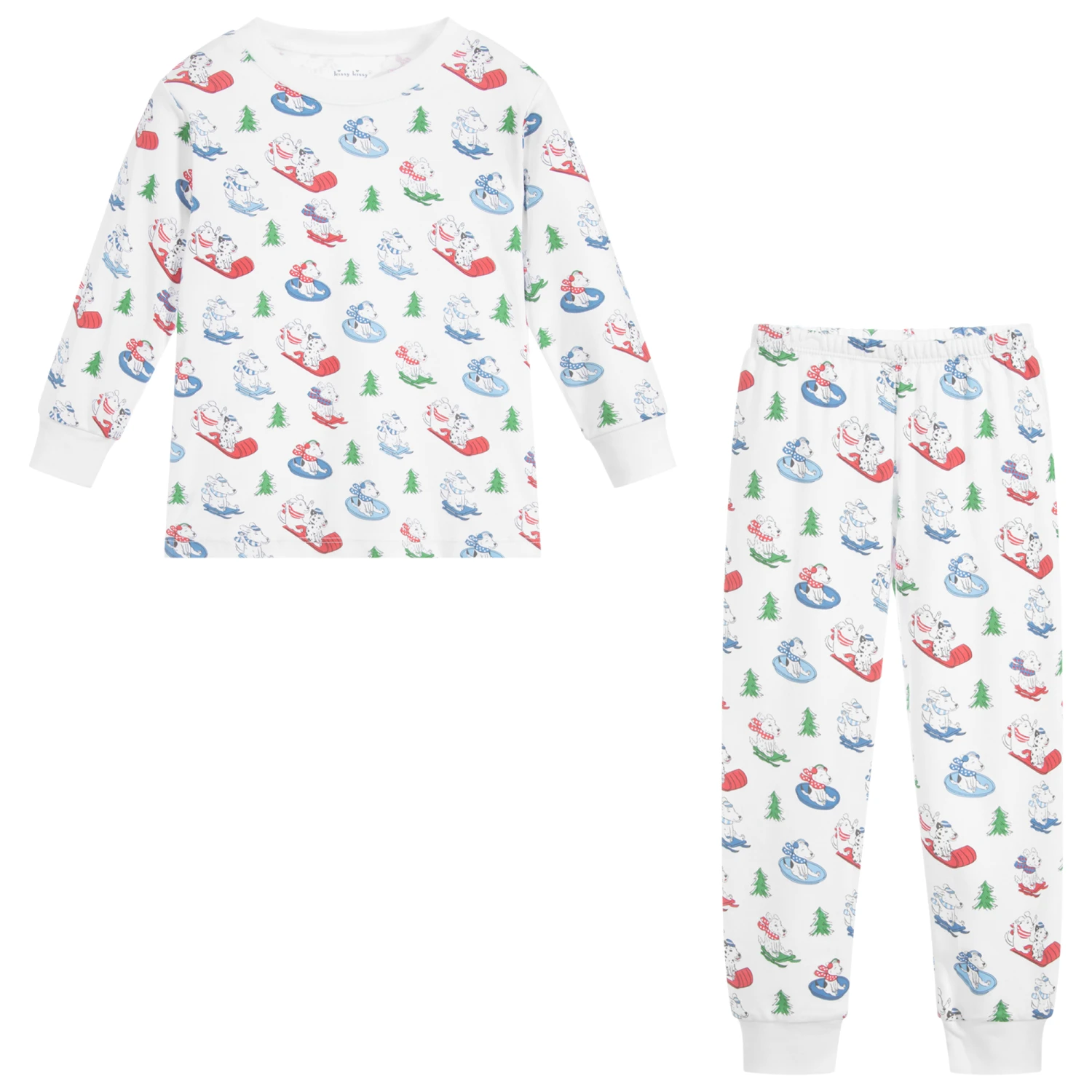 Boys white pyjamas by Kissy Kissy, with a charming red, blue and green dogs on sleds pattern print. They are made in the softest Pima cotton jersey.