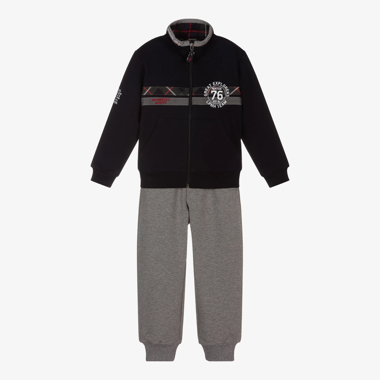 Boys navy blue and grey tracksuit by Lapin House, made in soft cotton jersey with a warm fleecy inside. The zip-fastening top has two stripes across the chest, one tartan and one grey, with a white logo print. The joggers have back and front pockets, with a comfortable elasticated waist.