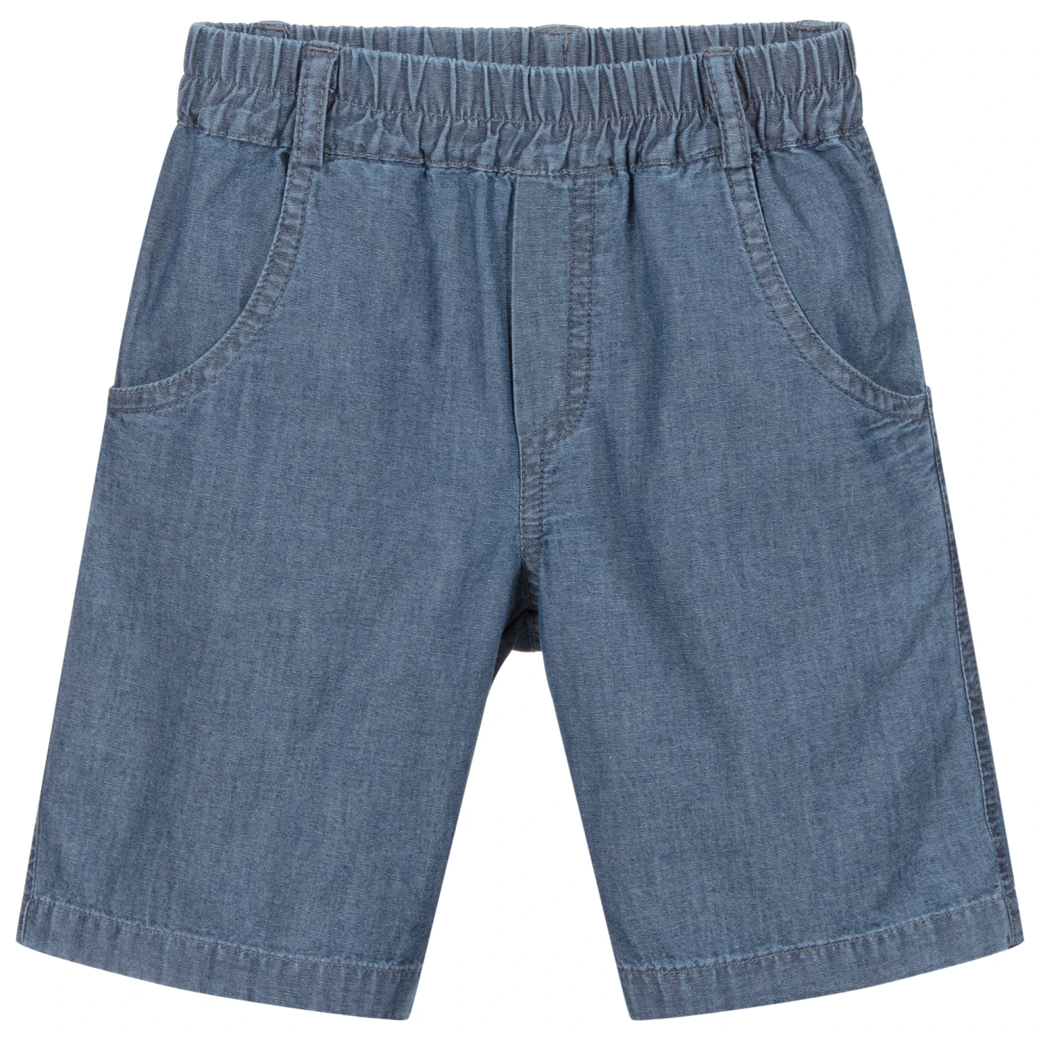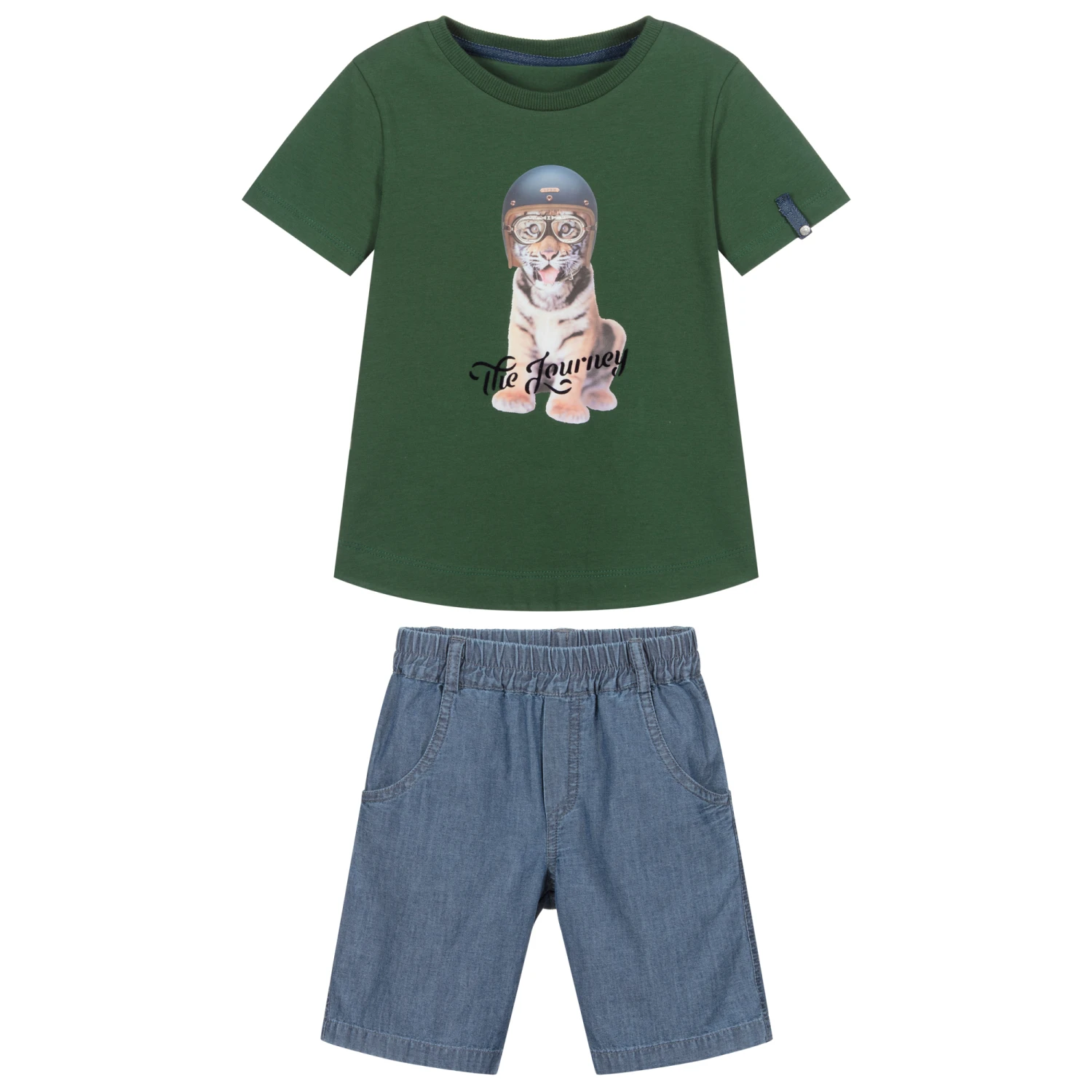 Boys T-shirt and shorts set by Lapin House. The green T-shirt has a cute tiger print and navy blue trims. The smaller sizes have poppers on the shoulder. The lightweight cotton shorts have the look of faded denim, and an elasticated waistband.