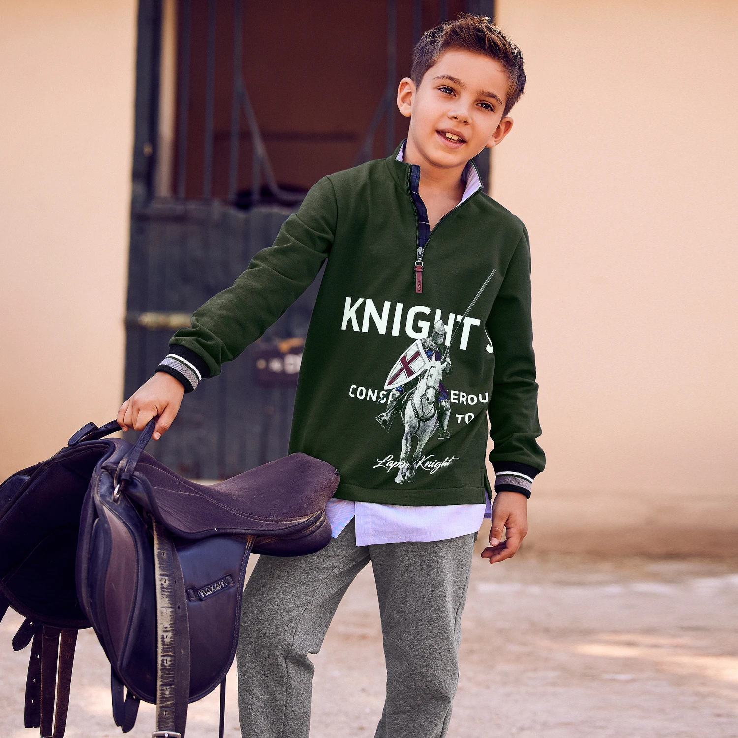 Casual green and grey tracksuit for boys by Lapin House, made in soft cotton jersey. The green half-zip top has a white knight print on the front, along with a blue Oxford shirt hem trim and knitted cuffs. The grey joggers have an elasticated waist and four pockets.