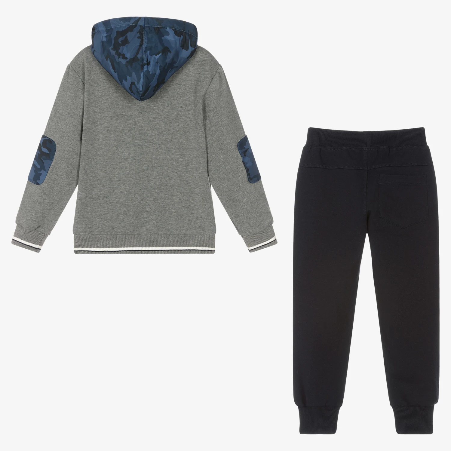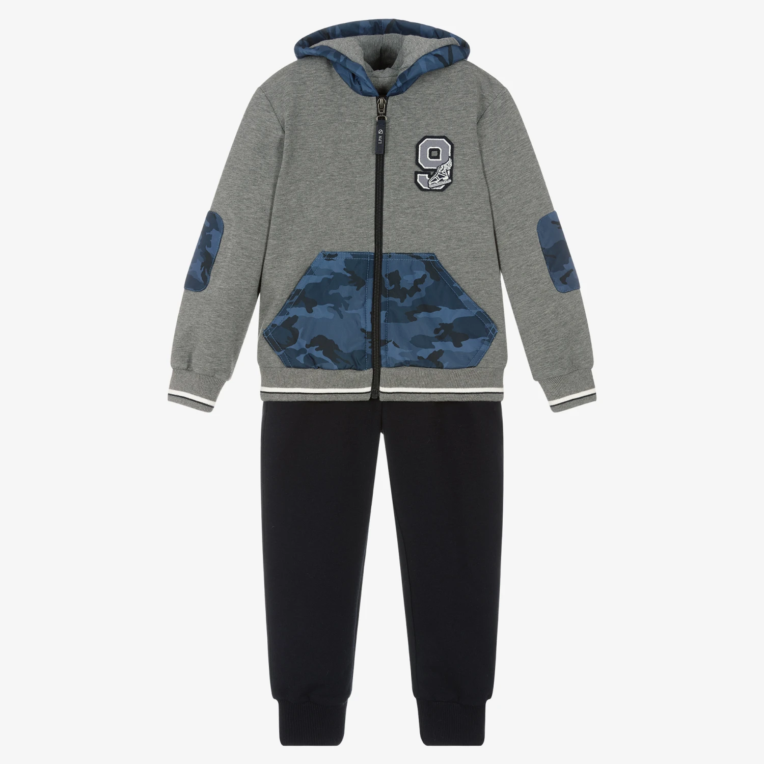 Grey and navy blue tracksuit for boys by Lapin House, made in comfortable cotton jersey with a fleecy inside. The grey marl zip-up hoodie has silky blue camouflage detailing, front pockets and ribbed trims. It has an ice skating badge on one side. The navy blue joggers have jetted front pockets, one back pocket and a fleecy inside.