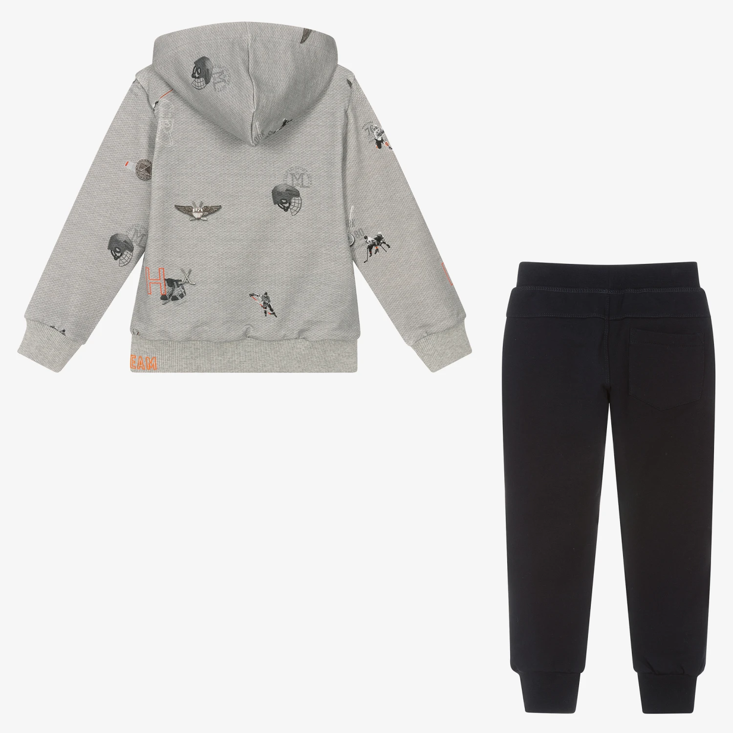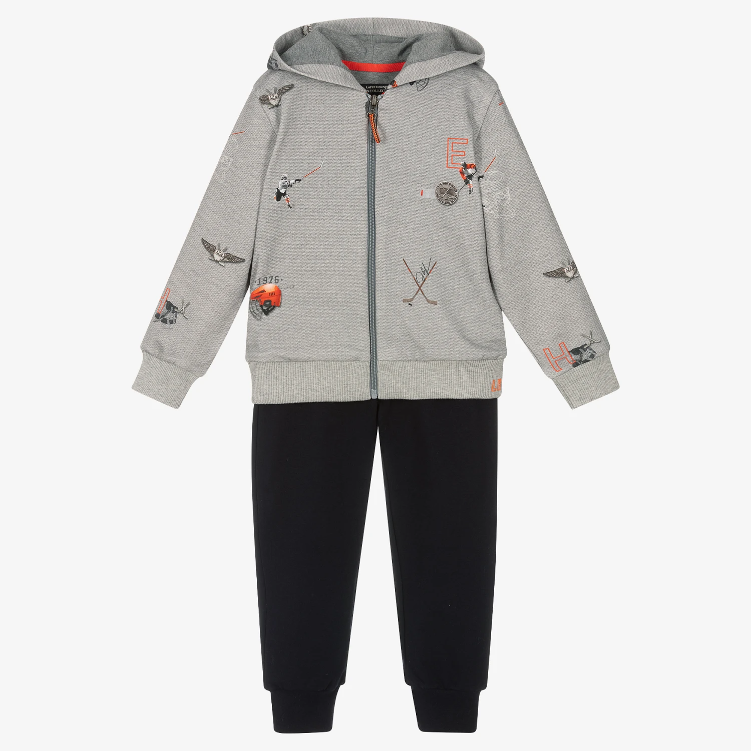 Grey and navy blue tracksuit for boys by Lapin House, made in comfortable cotton jersey. The zip-up hoodie has a knit-effect print with orange ice hockey graphics and ribbed trims. It is lined in grey jersey and fastens with a front zip. The navy blue joggers have jetted front pockets, one back pocket and a fleecy inside.