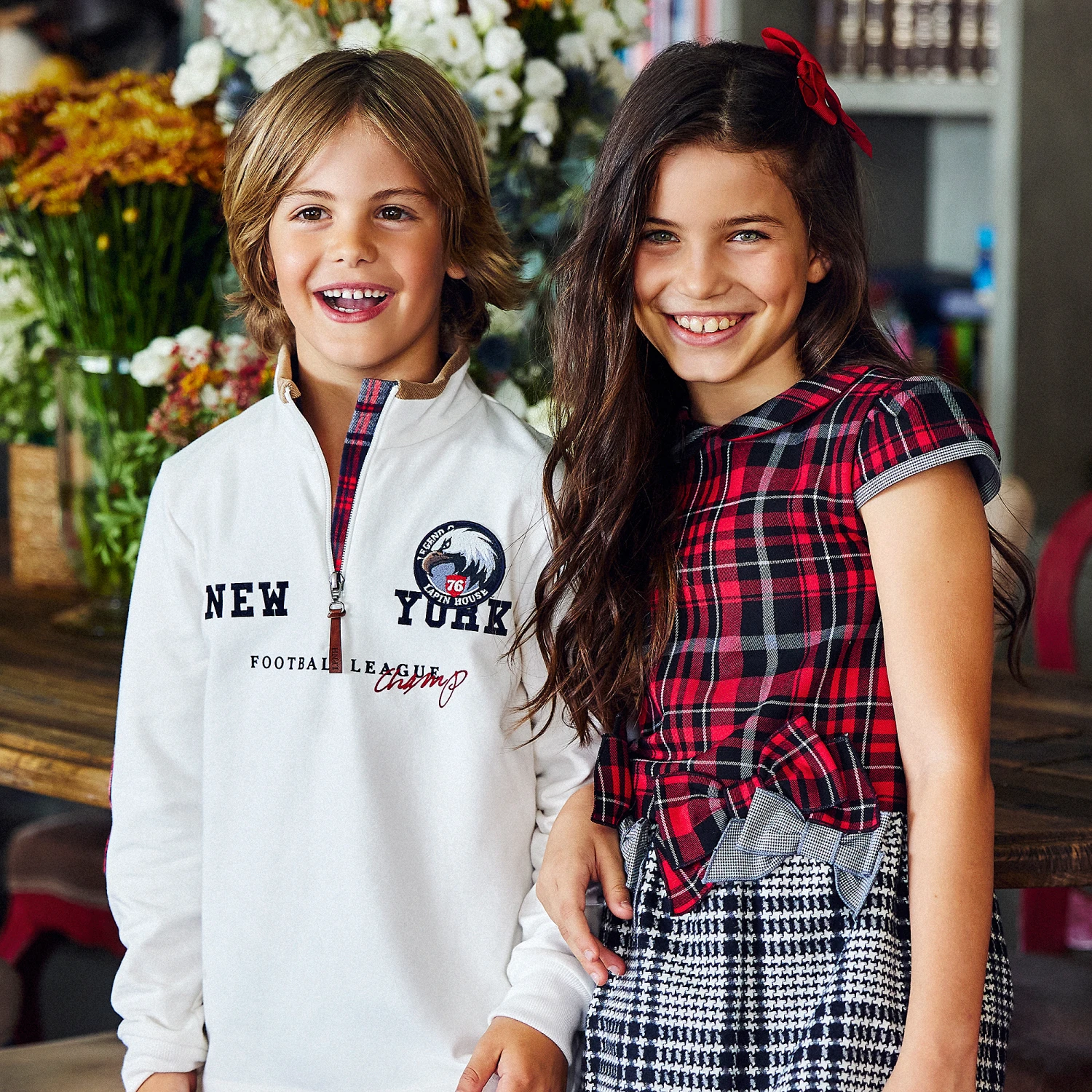 Casual ivory and grey tracksuit for boys by Lapin House, made in soft cotton jersey. The ivory half-zip top has a New York eagle logo badge on the front, with blue and red check elbow patches and placket trim. The grey joggers have an elasticated waist and four pockets.