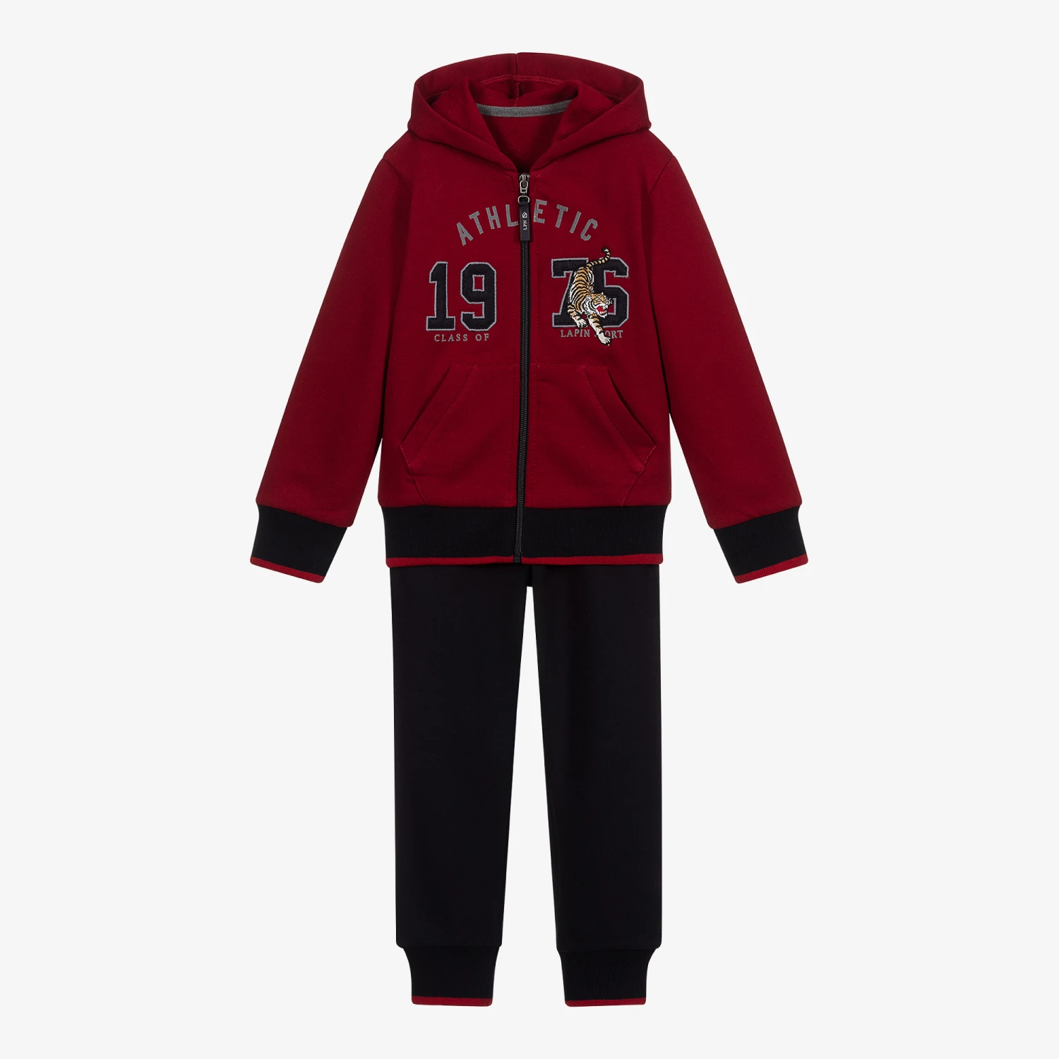 Boys red and navy blue tracksuit by Lapin House, made in soft cotton sweatshirt jersey with a fleecy inside. The hooded top has a navy blue and grey logo print and tiger embroidery on the front. The navy blue joggers have four pockets and an elasticated waistband.