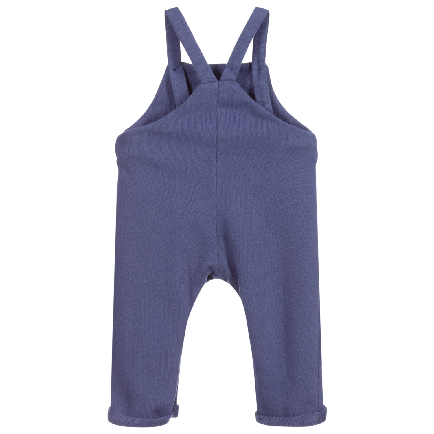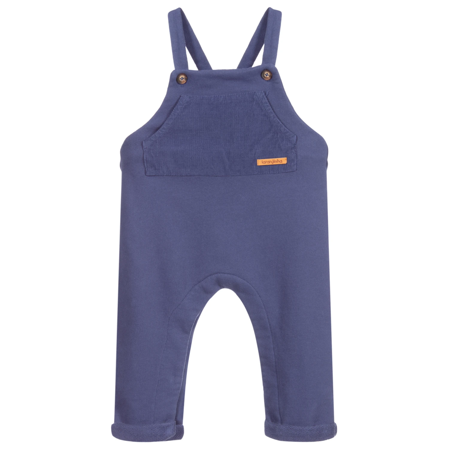 Lovely for younger boys, a pair of blue dungarees by Laranjinha, made from soft brushed cotton sweatshirt jersey. Mid-weight, they have a soft needle cord pocket on the front, with a faux leather branded patch. There are useful popper fastenings underneath and adjustable button fastening straps.