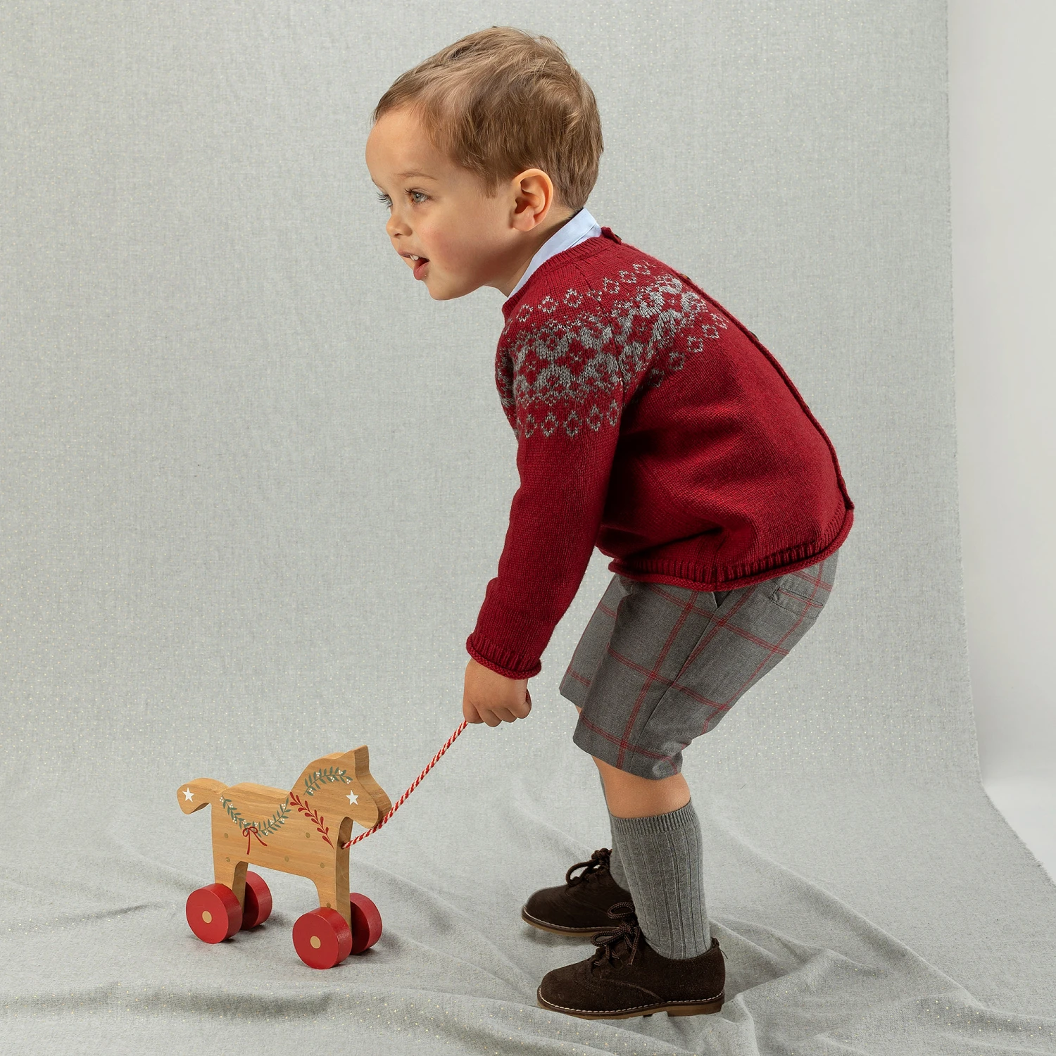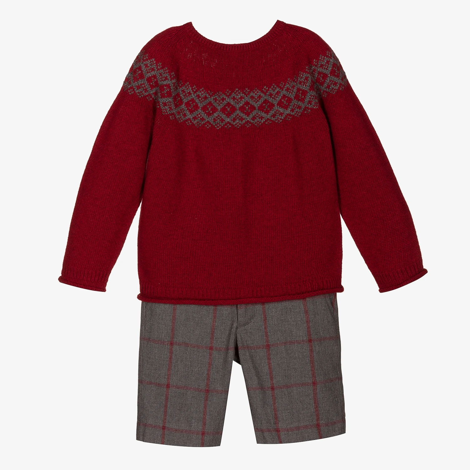 Smart casual shorts set for boys by Laranjinha. The burgundy red cardigan is knitted in a soft wool and cashmere blend, with a pretty grey Fair Isle pattern around the shoulders and a rolled hemline. It fastens with faux tortoiseshell buttons. The fully lined grey and red check cotton shorts have a useful adjustable waistband, with pockets on both the front and back.