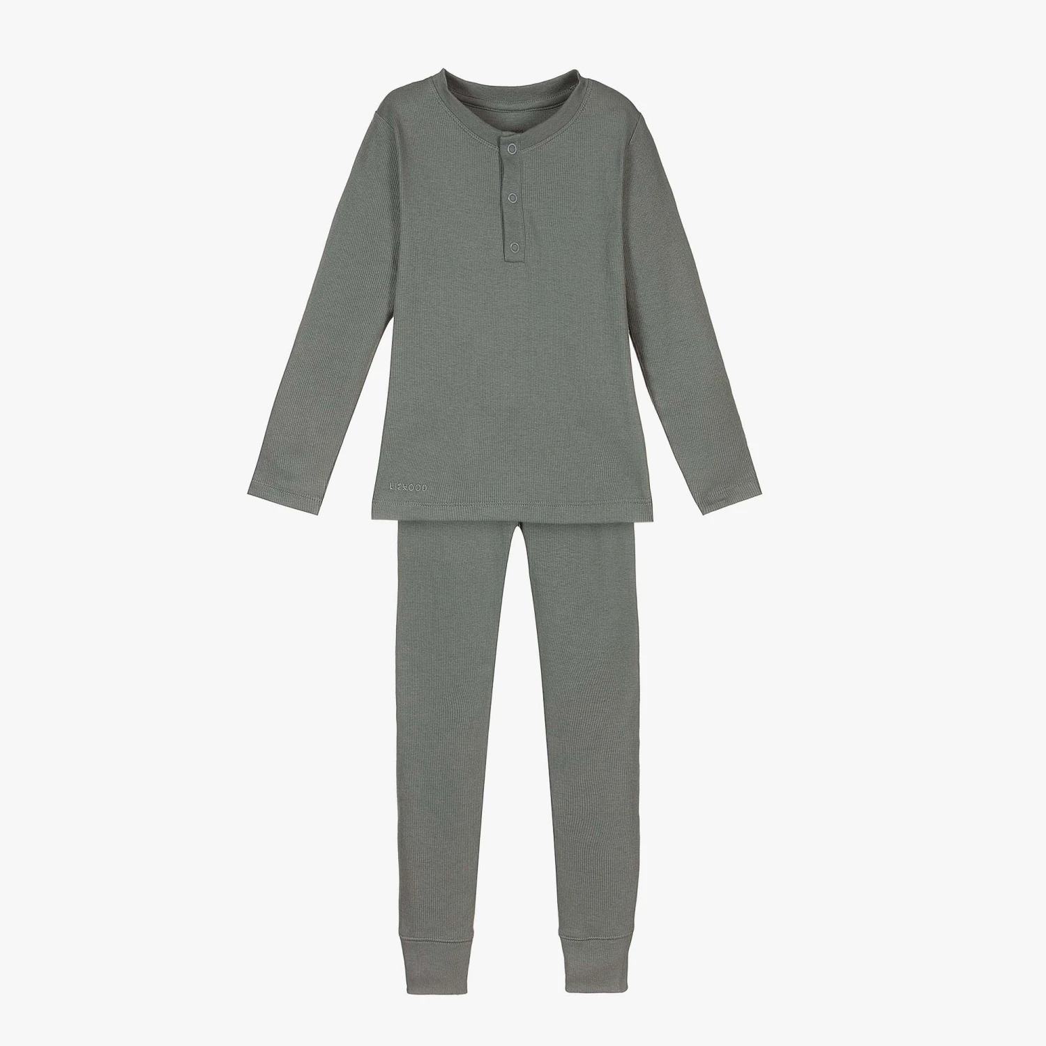 Boys blue pyjamas by Liewood, made in ribbed organic cotton jersey. The top has front popper fastenings and the designer’s name in tone-on-tone embroidery on the hem. The snug-fitting trousers have a comfortable elasticated waistband.