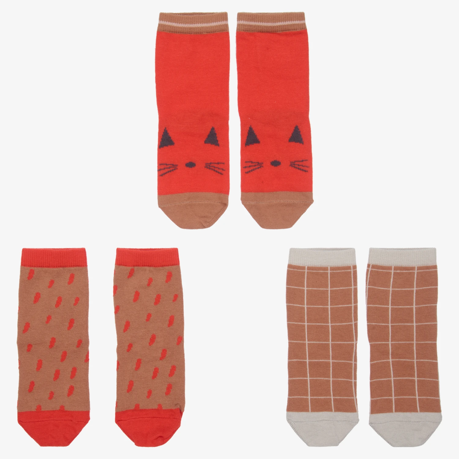 Three pairs of ankle socks for boys and girls by Danish brand Liewood. In red, beige and brown, each pair has its own fun design. Super comfortable, they are made in a soft and stretchy cotton blend, with gently ribbed cuffs for a snug fit.