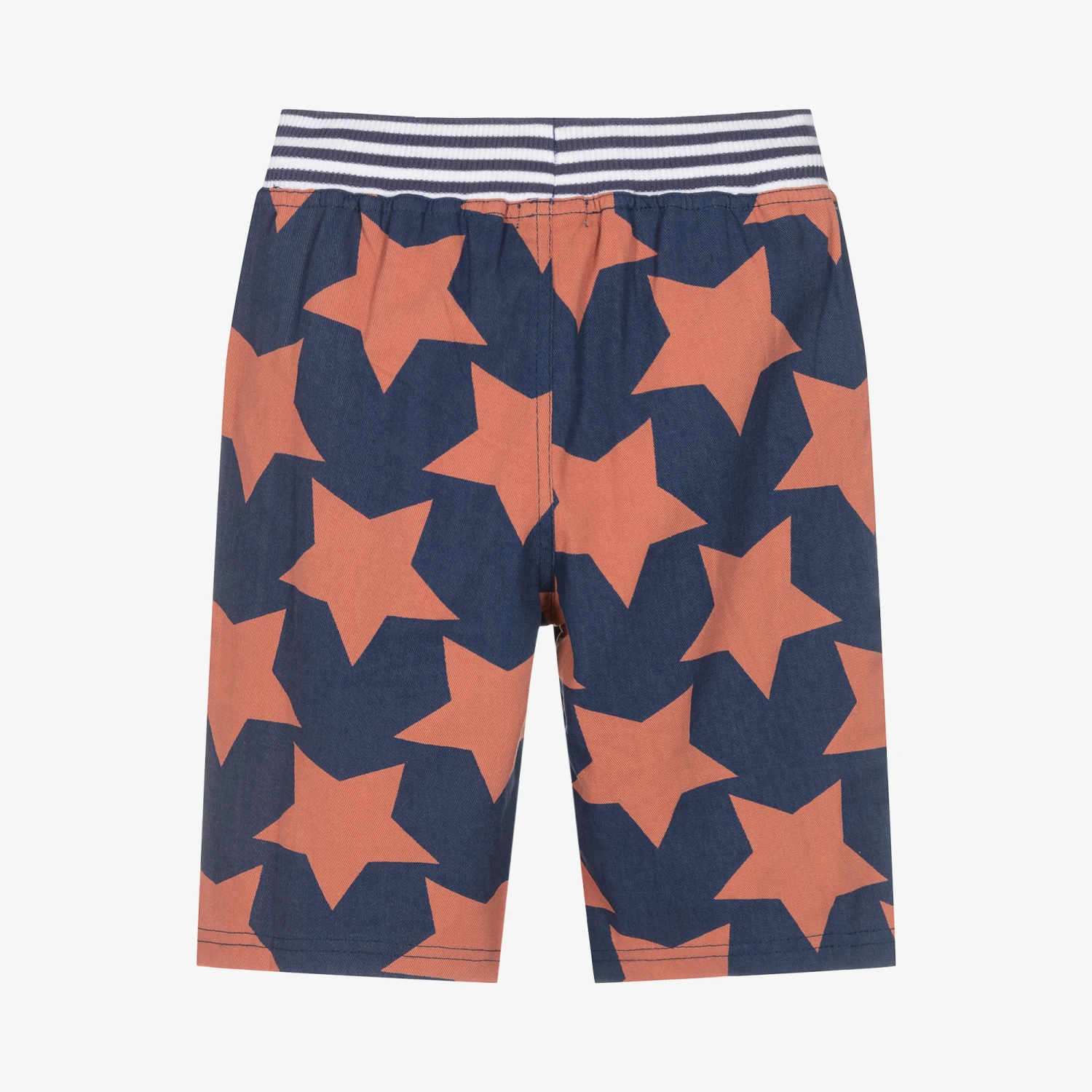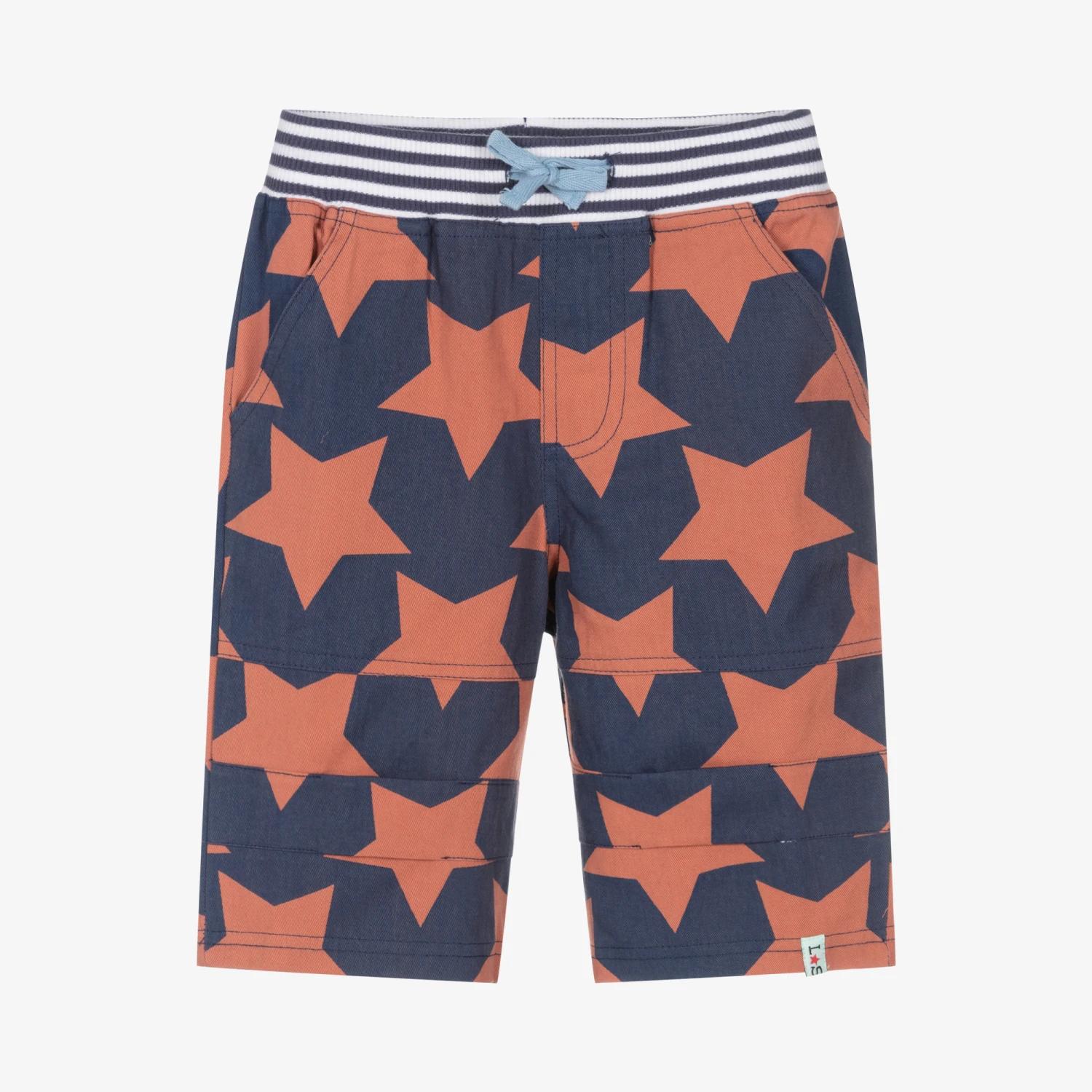 Dark blue shorts for boys by Lilly and Sid, woven in soft organic cotton twill. Casual and playful, they have a red star pattern with stitched knee panels and a logo tab on the front. There are side seam pockets and a stripy ribbed waistband with an adjustable drawstring.