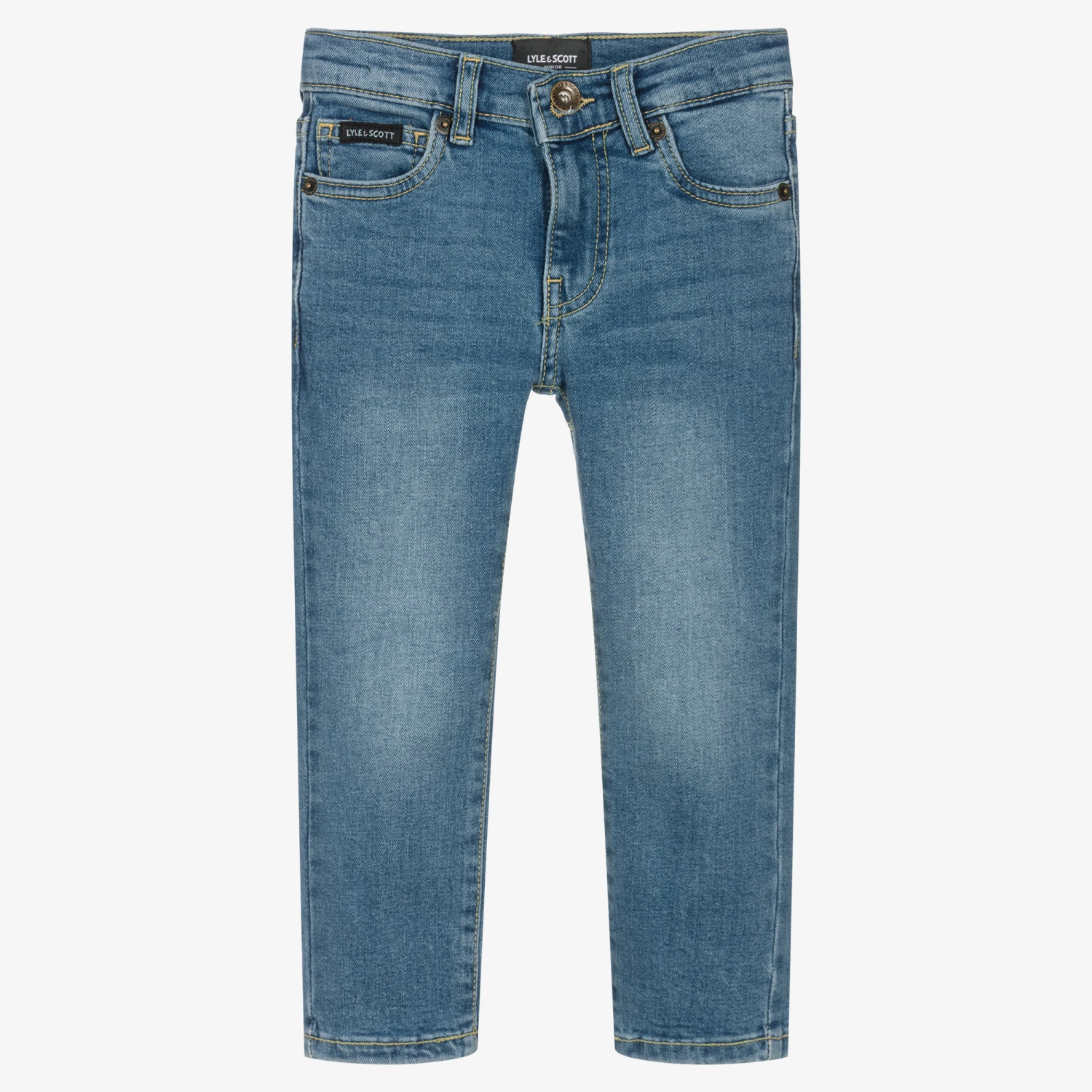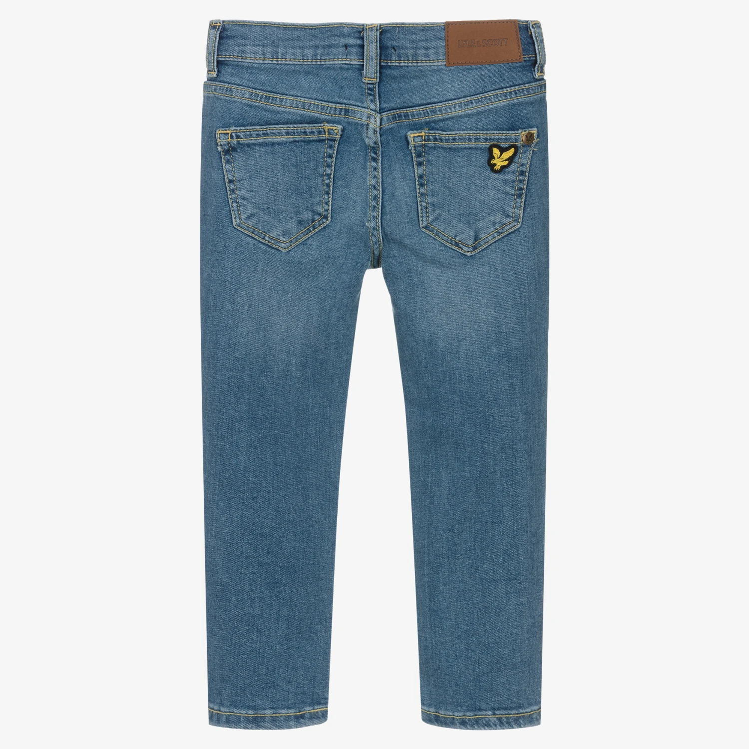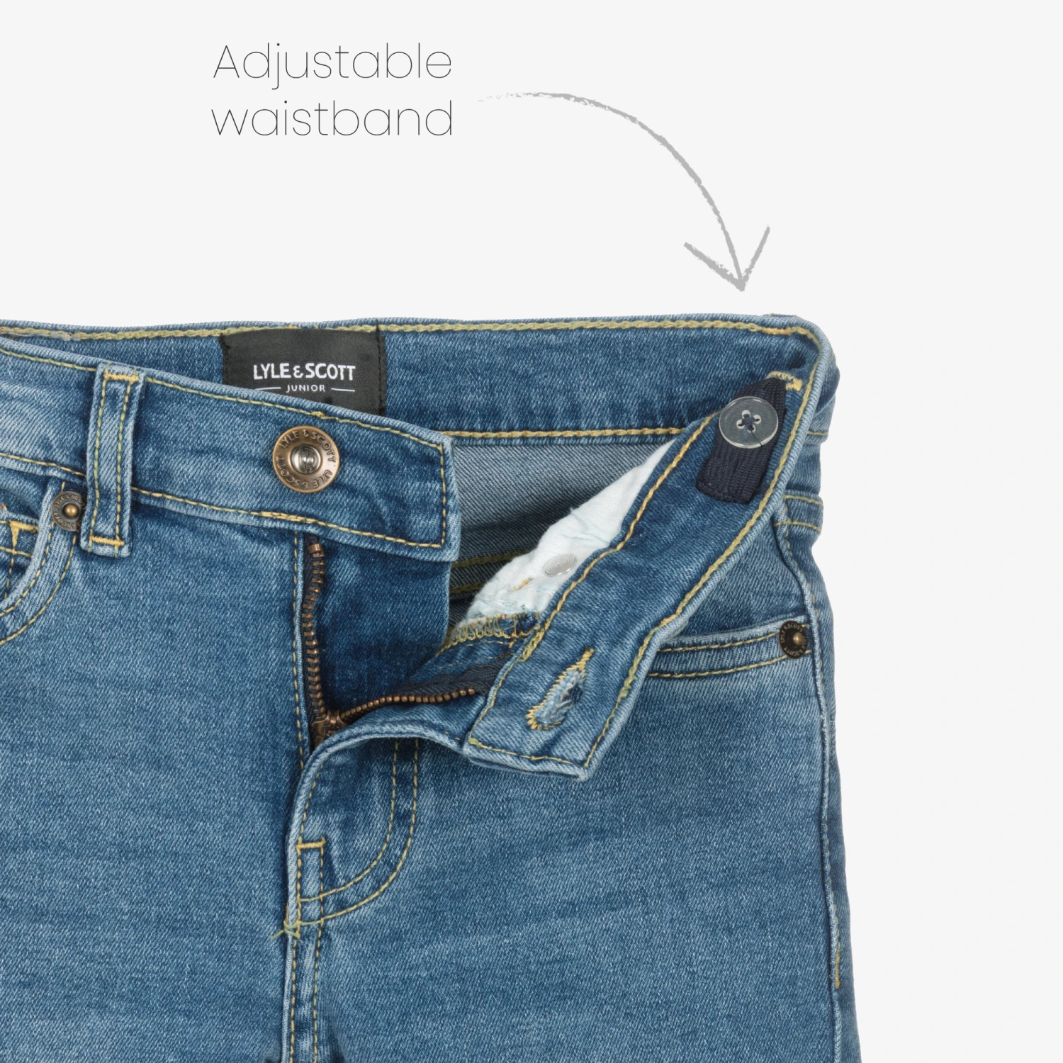 Mid-blue wash jeans for boys by Lyle & Scott, made in soft, stretch denim. With classic five pocket styling, they have faded patches on the front and back. The brand’s signature embroidered golden Eagle logo patch is on the back pocket and there is a brown embossed logo patch on the back of the waistband and a logo patch on the front coin pocket. They have a useful adjustable waist for a comfortable fit and fasten with a button and zip.