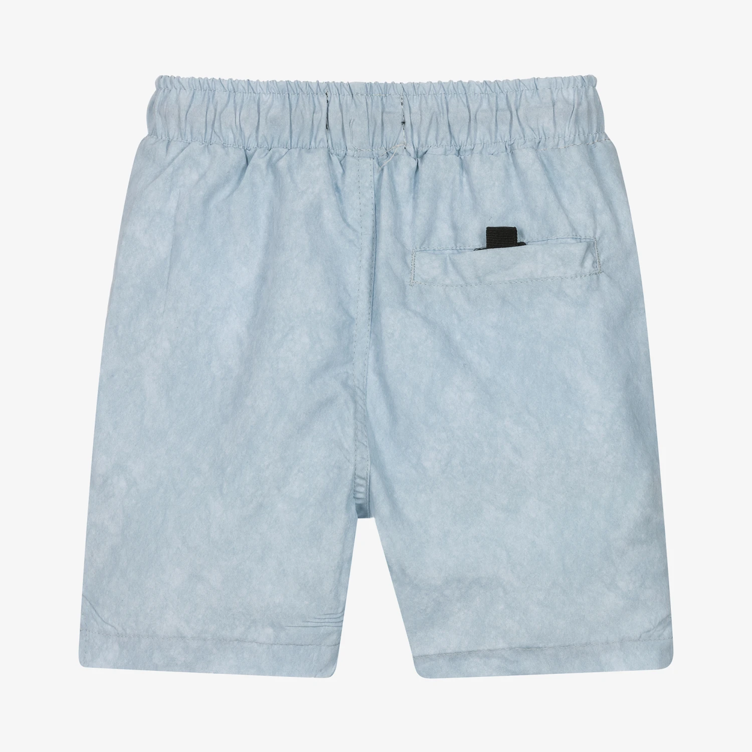 Light blue swim shorts for boys by Lyle & Scott, with a marbled effect pattern. Soft and smooth, they have a lightweight mesh lining for comfort. There are zip-fastening pockets on the front and a vecro-fastening pocket on the back. The brand’s signature golden Eagle logo patch is on the front and they have a useful drawstring waistband.