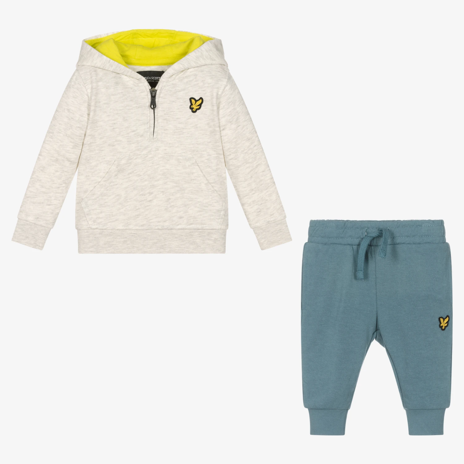 Casual blue and grey tracksuit for little boy by Lyle & Scott. Soft and comfortable, it is made in a mid-weight cotton blend jersey. The hooded top has an upper zip fastening, a useful pouch pocket on the front, with a signature embroidered Eagle logo on the chest. The joggers have gently elasticated waist, three pockets, and a matching Eagle logo on one leg.