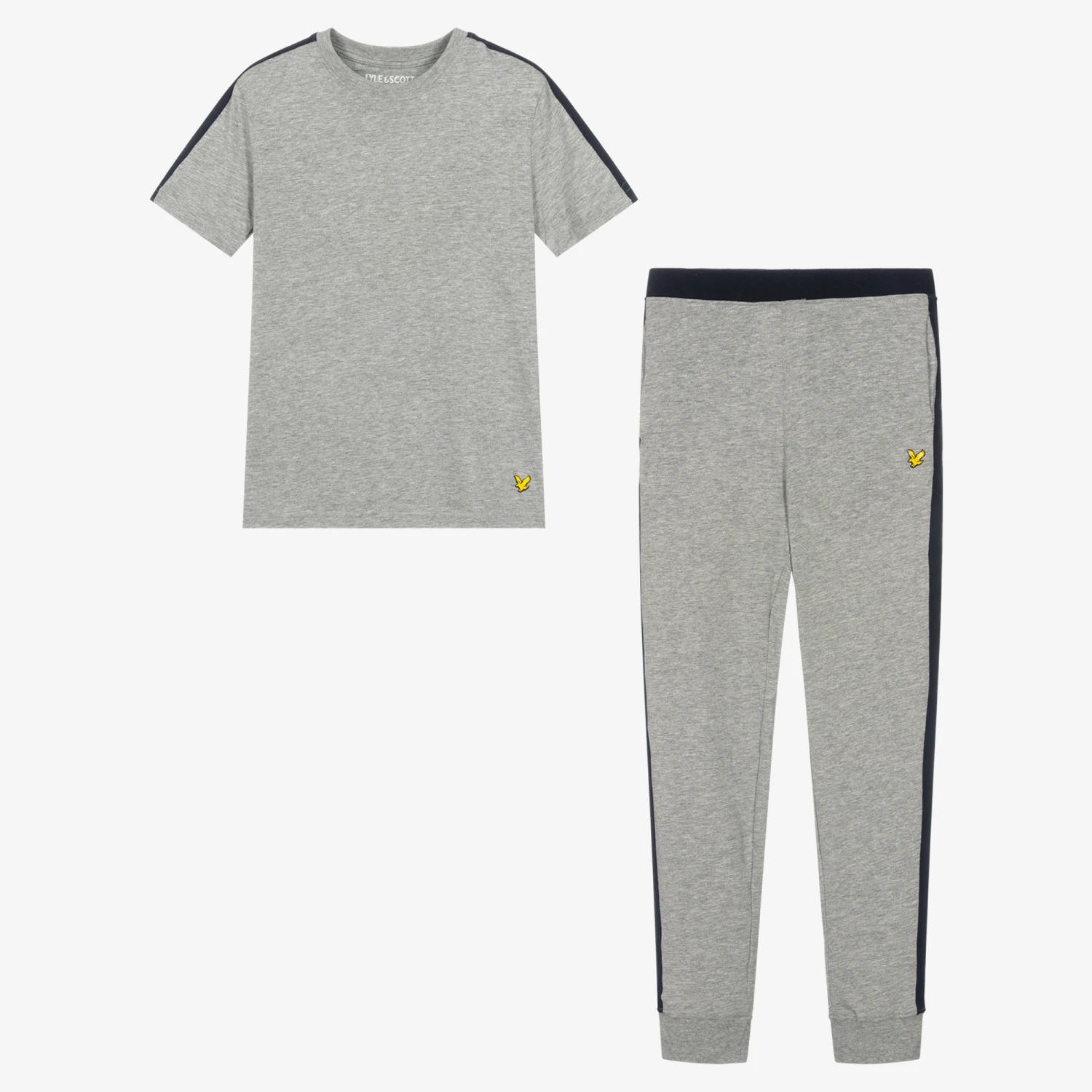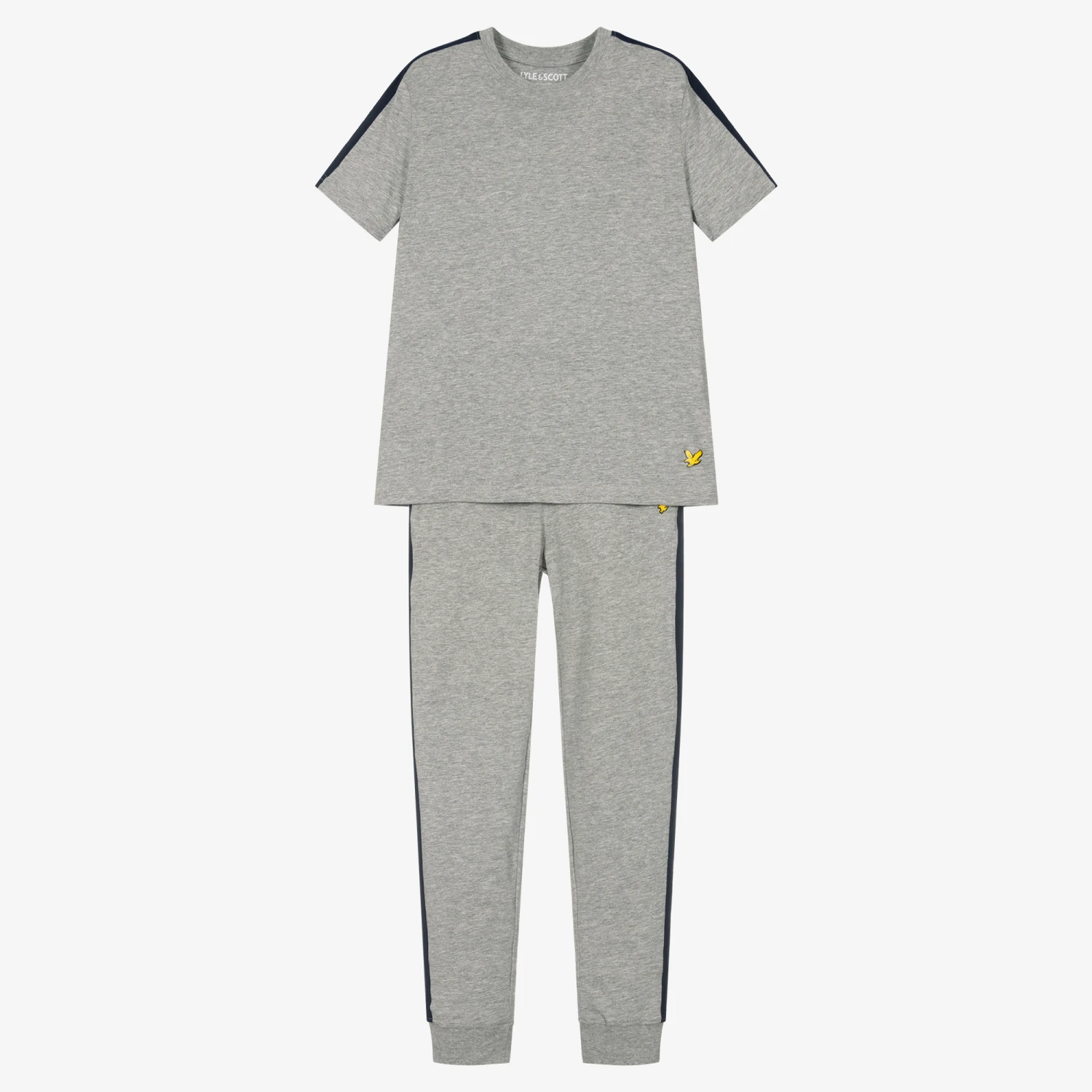 Suitable as loungewear, these grey marl jersey pyjamas for boys are by Lyle & Scott. Made in a soft cotton and viscose blend, both pieces have navy blue stripe trims and the brand’s iconic Eagle logo appliquéd on the front. The full length bottoms have front pockets and an elasticated waist.