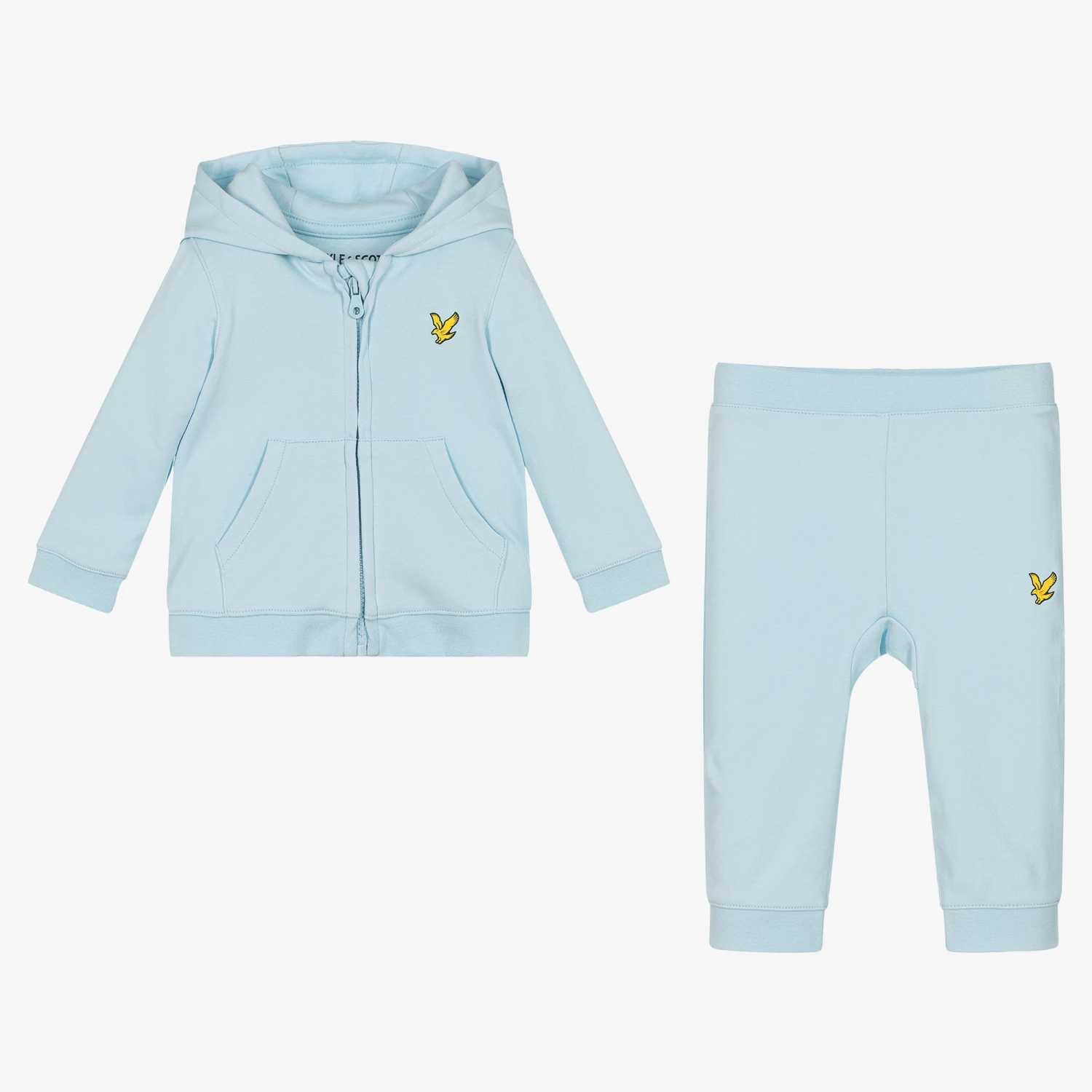 Pale blue tracksuit for little boys by Lyle & Scott. Casual and comfy, it is made in soft organic cotton jersey. The top has a useful pouch pocket on the front, with a signature Eagle logo print on the chest. The joggers have gently elasticated waist and a matching Eagle logo on one leg.