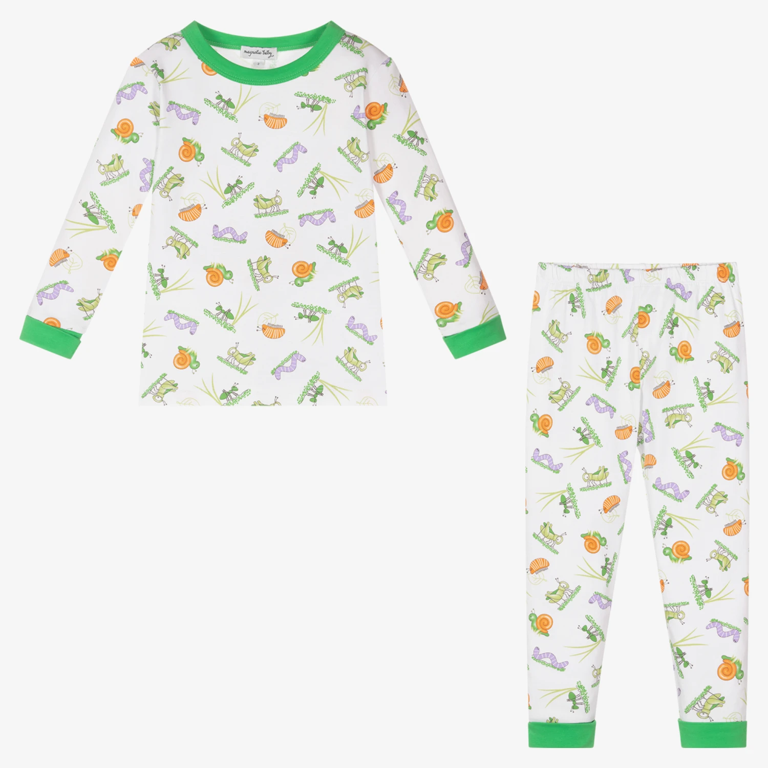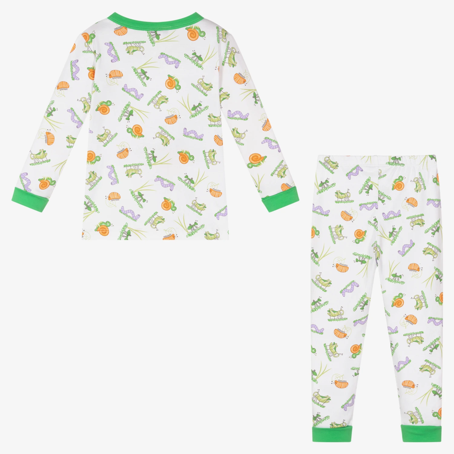 Boys white pyjamas by Magnolia Baby, made in super-soft Pima cotton jersey. They have a colourful bug pattern and green trims. Comfortable and stretchy, these long pyjamas are designed to fit snugly.