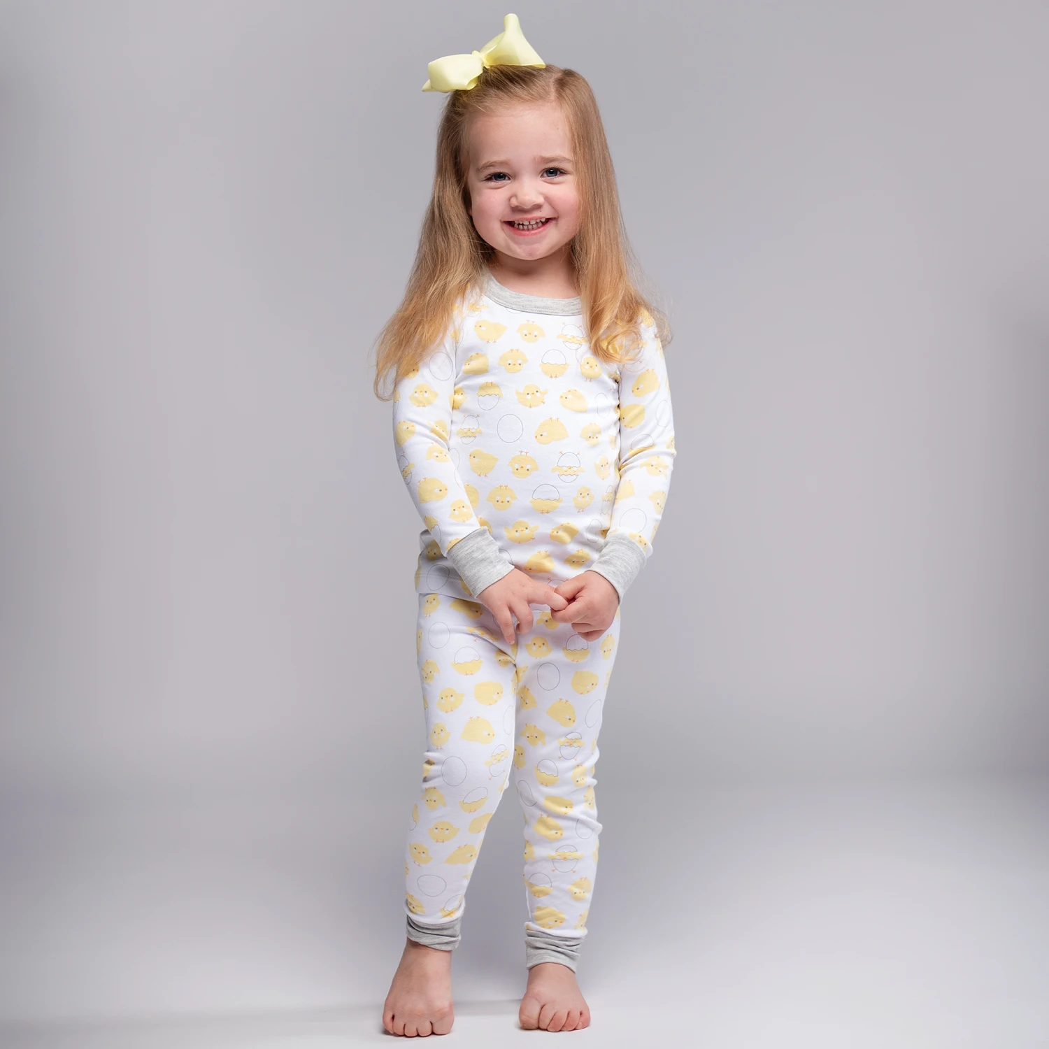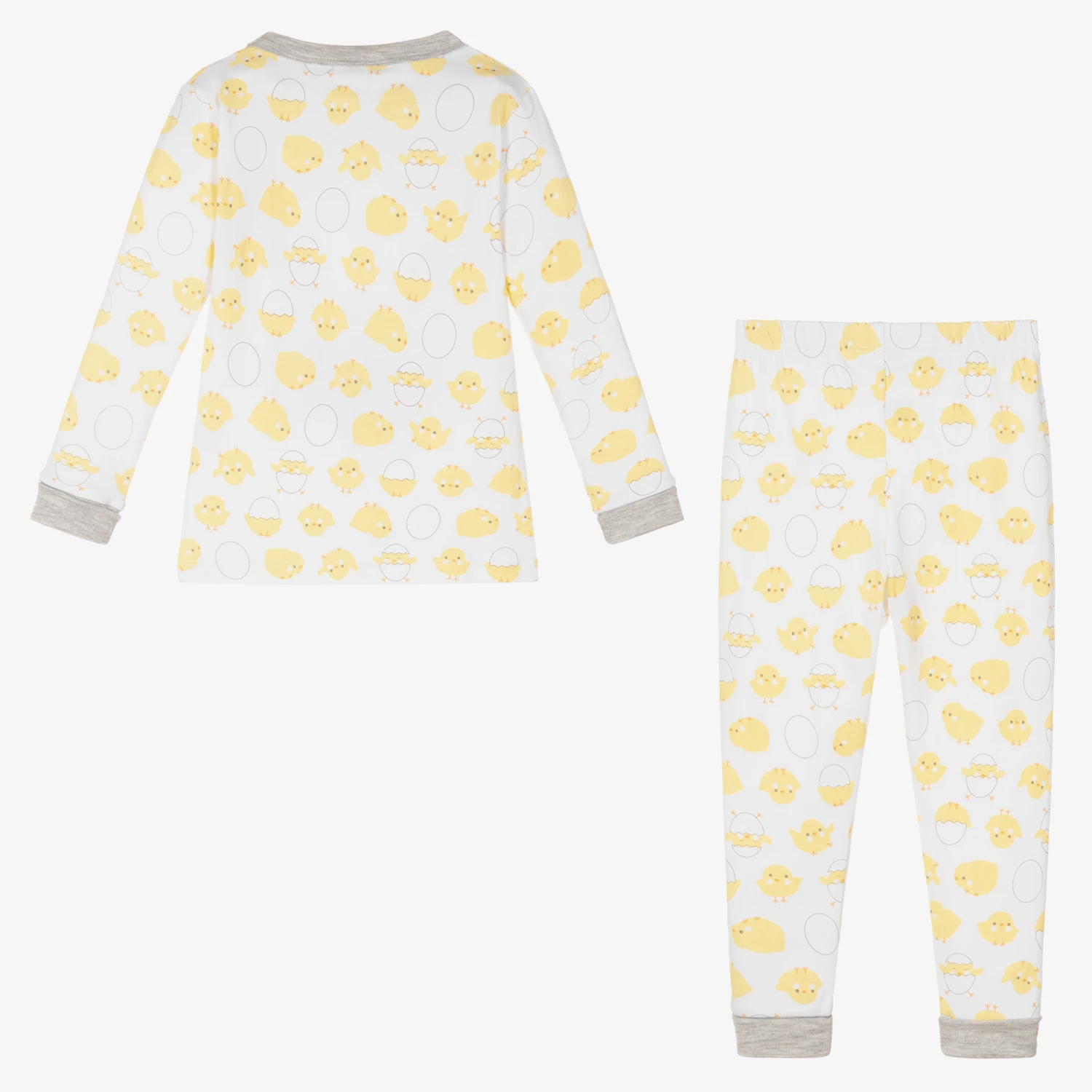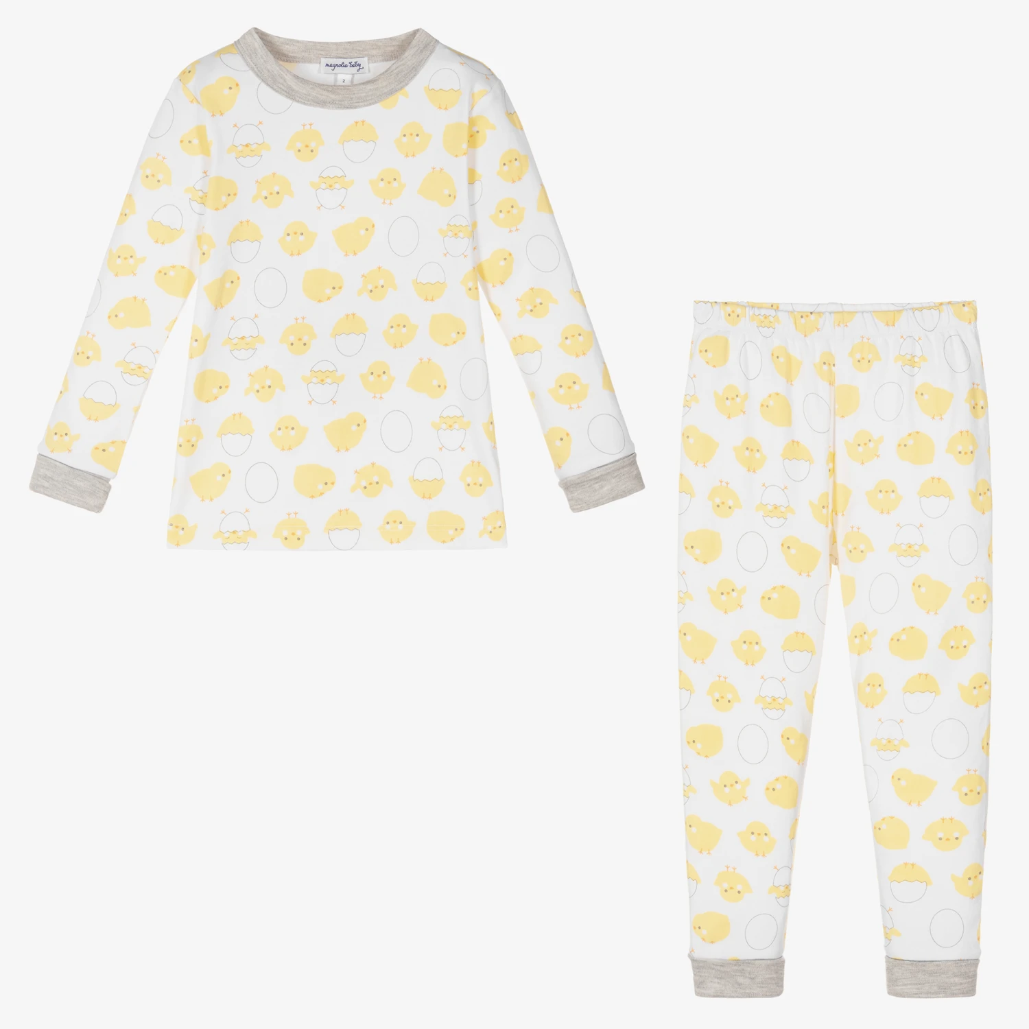 Girls and boys white pyjamas by Magnolia Baby, made in super-soft Pima cotton jersey. They have a sweet yellow chicks pattern and grey marl trims. Comfortable and stretchy, these long pyjamas are designed to fit snugly.