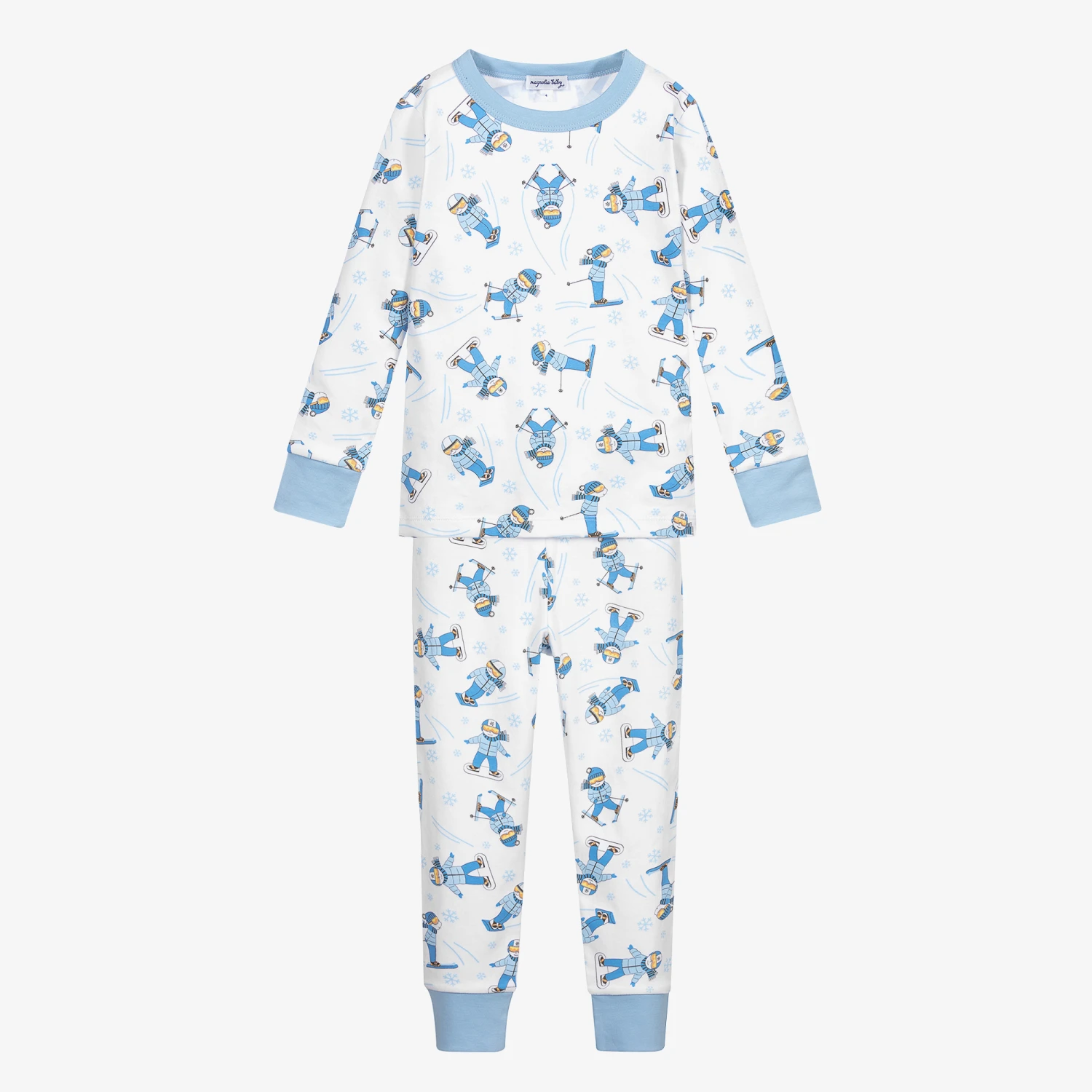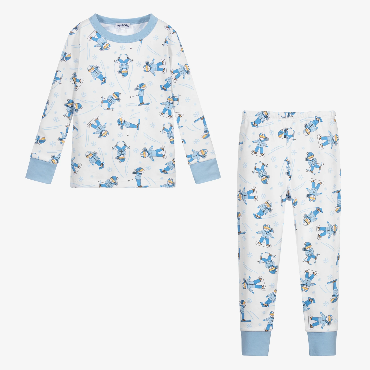 White long pyjamas for boys by Magnolia Baby, made in super soft and stretchy Pima cotton jersey. They have a blue skier print and pale blue trims.