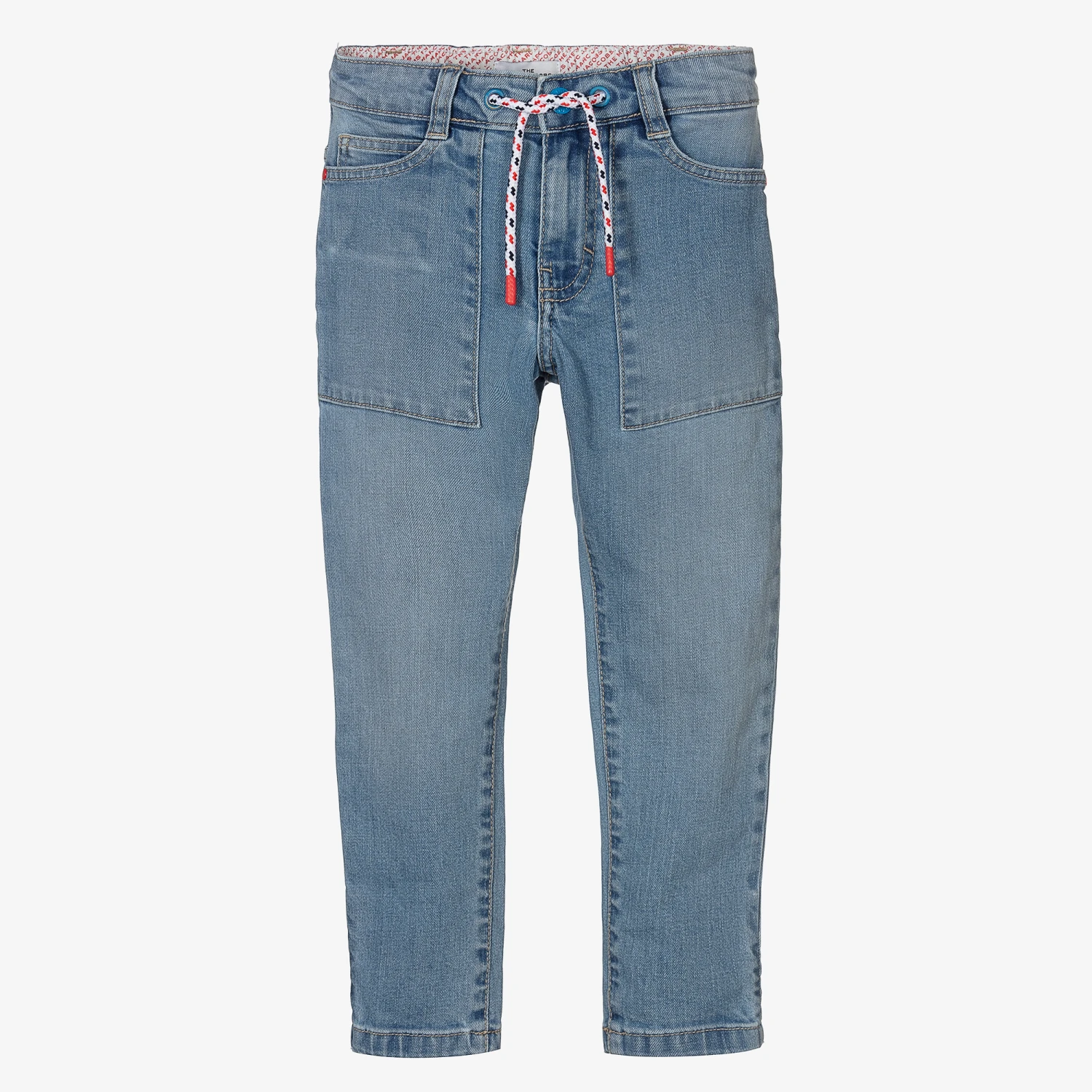 Light blue wash denim jeans for boys by THE MARC JACOBS, in a tapered slim fit. Soft, with slight stretch they have a drawstring waist, as well as a zip and popper fastening. There are five pockets and cool dog prints on the back pockets.