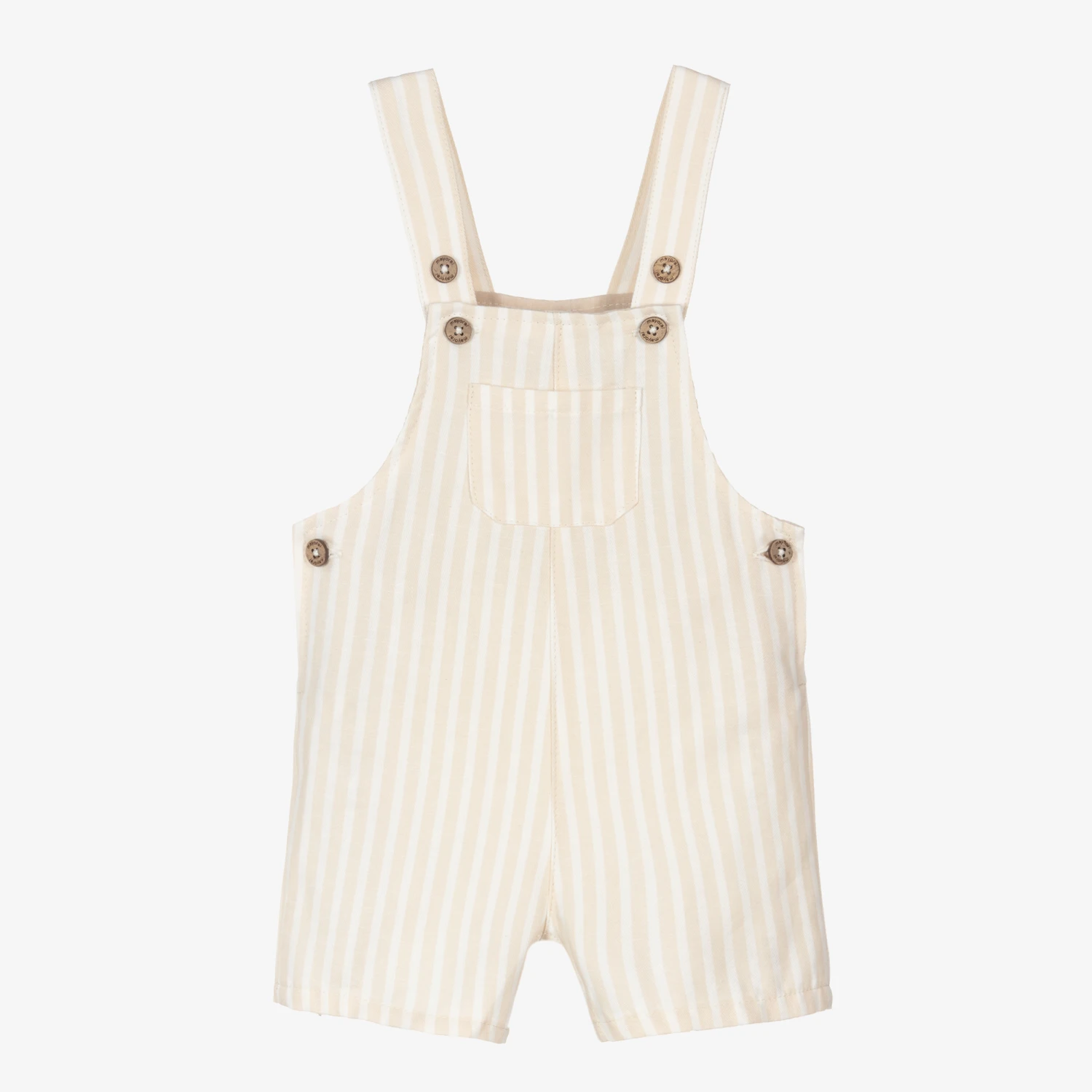 Beige and ivory striped dungaree shorts for little boys by Mayoral. They are made in a soft cotton and linen blend, with a little patch pocket on the front. There are logo-branded wooden buttons on the sides and straps, with popper fastenings between the legs.