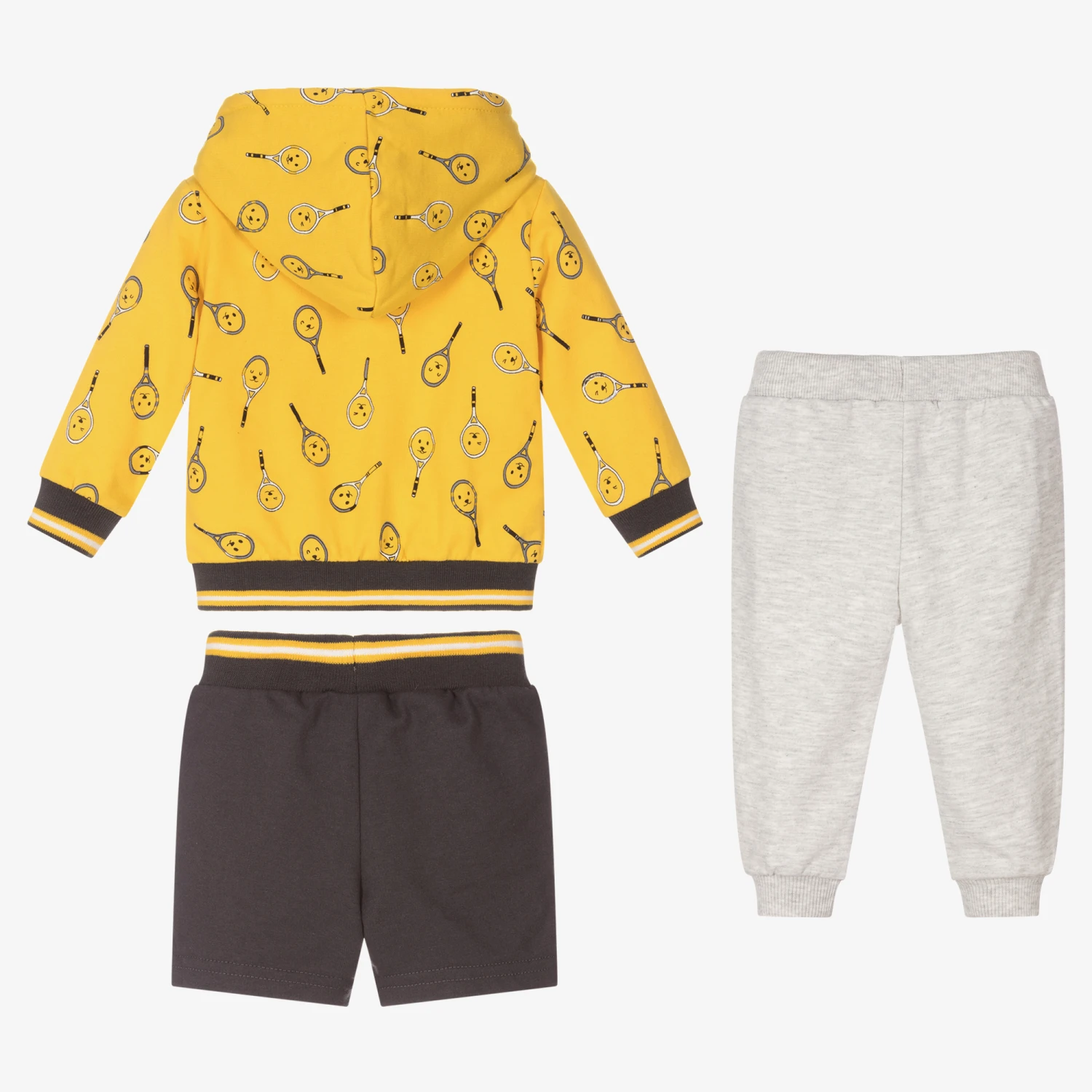 Little boys three-piece tracksuit by Mayoral, made in soft, cotton blend jersey. The yellow zip-up hooded top has a fun grey and white tennis racket print, front pockets and striped trims. The grey marl joggers have a drawstring waist, extra durable knees to prevent wear, and useful side pockets. The dark grey shorts have a striped waistband with a drawstring tie and a tennis racket print on one leg.
