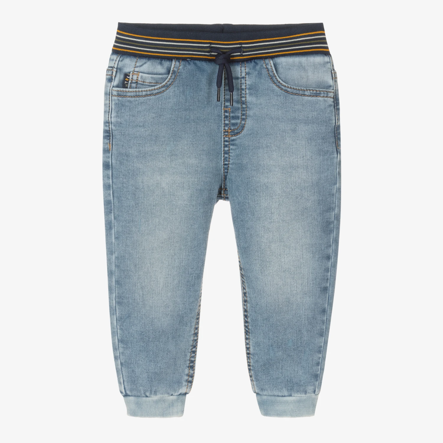 Blue jeans for little boys by Spanish brand Mayoral, with five-pocket styling and a washed and worn look. Ideal for all-day wear, they are made in stretchy sustainable cotton with the look of denim but the feel of jersey. They have a comfortable jogger fit, with an elasticated navy blue waistband, striped in yellow, white and green, a drawstring waist and elasticated cuffs.