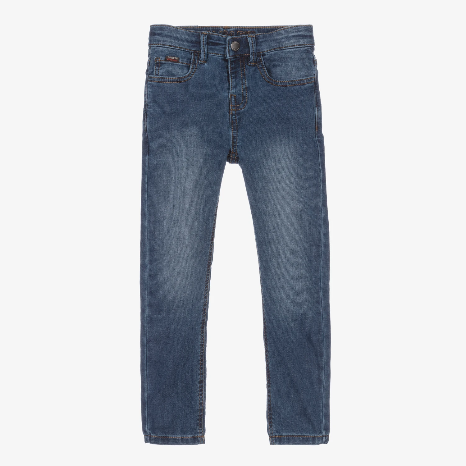 Blue slim fit denim jeans for boys by Mayoral, with a washed and worn look. Made in a soft cotton blend, they have classic five-pocket styling with a useful adjustable waistband. They fasten with a popper and have a fabric tab on the coin pocket with a faux leather logo tab sewn around the back. This garment is made with sustainable cotton, reducing its impact on the environment.