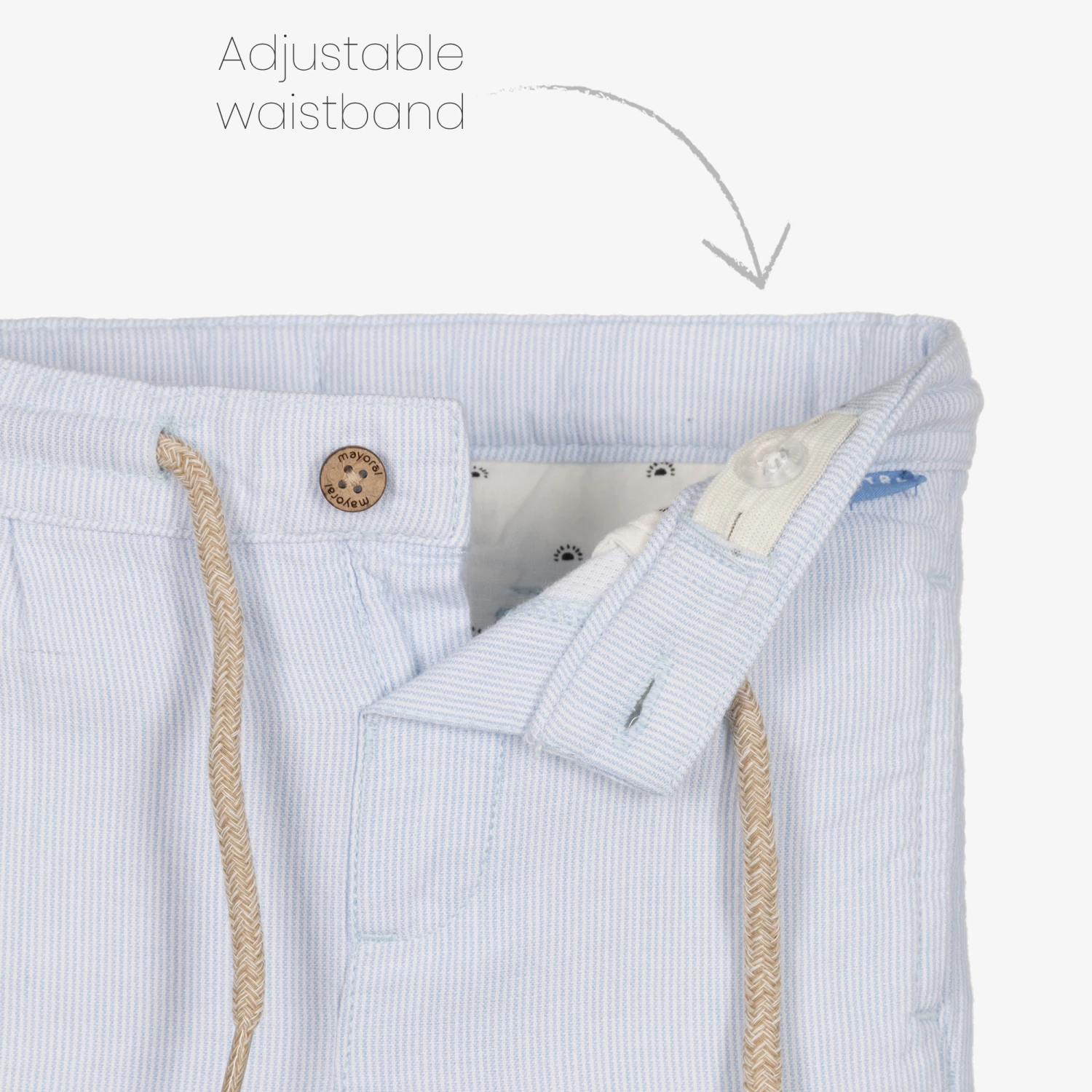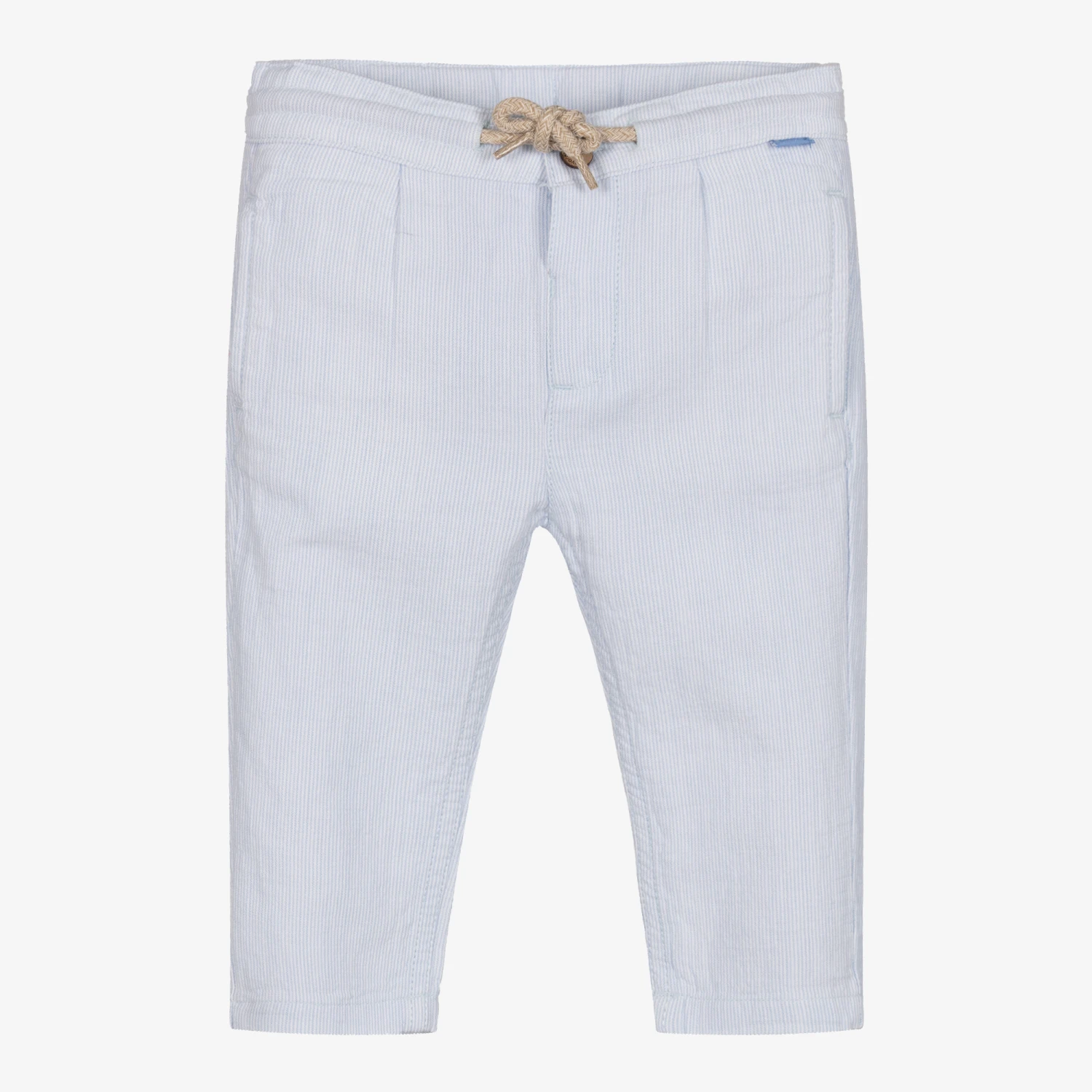 In a pale blue pinstripe, these soft cotton trousers for little boys are by Mayoral. In a comfortable relaxed fit, they have an adjustable waistband with drawstring ties. There are four pockets and a branded button fastening on the front.