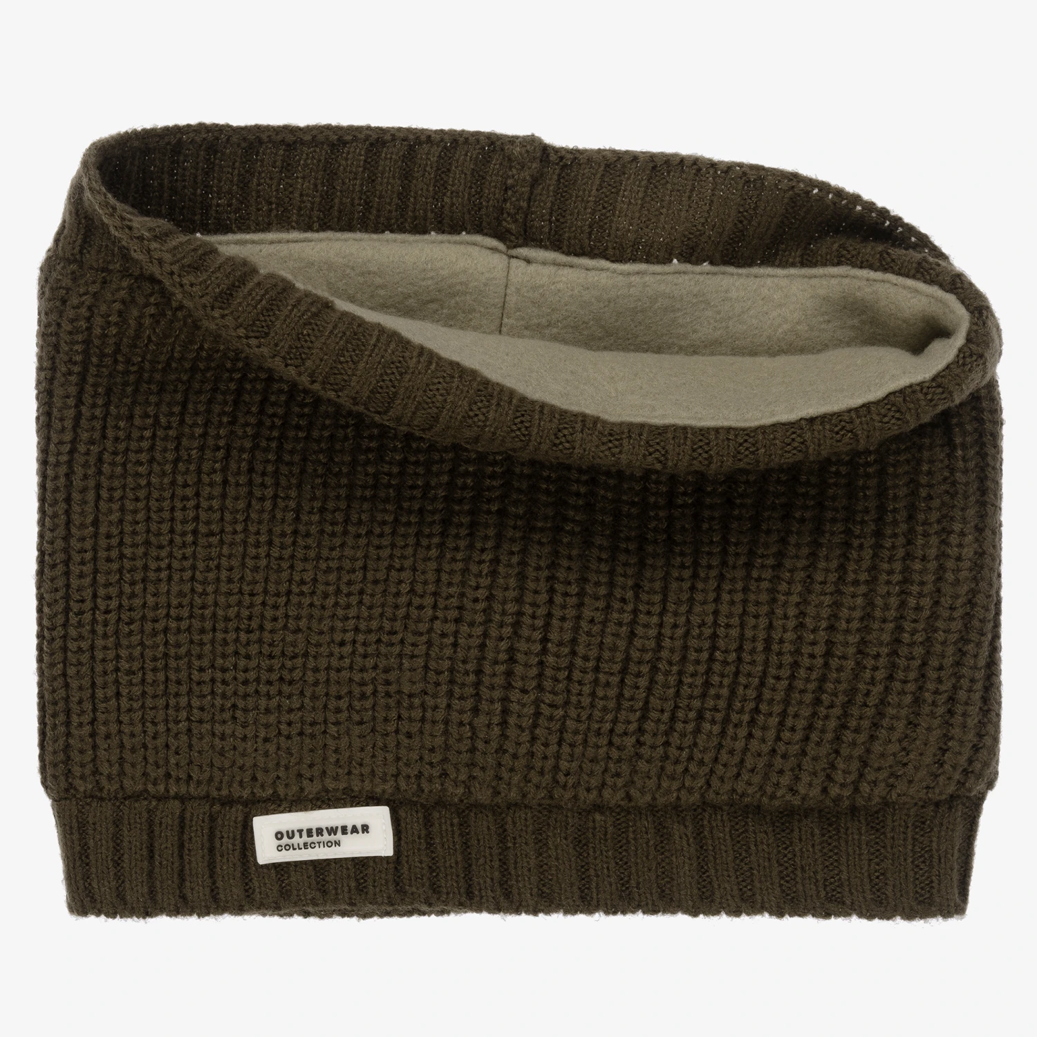 Cool khaki green snood for boys by Mayoral. Knitted in soft acrylic, it has a rubberised beige logo badge on the front, and a soft fleecy lining for a warm and cosy fit.