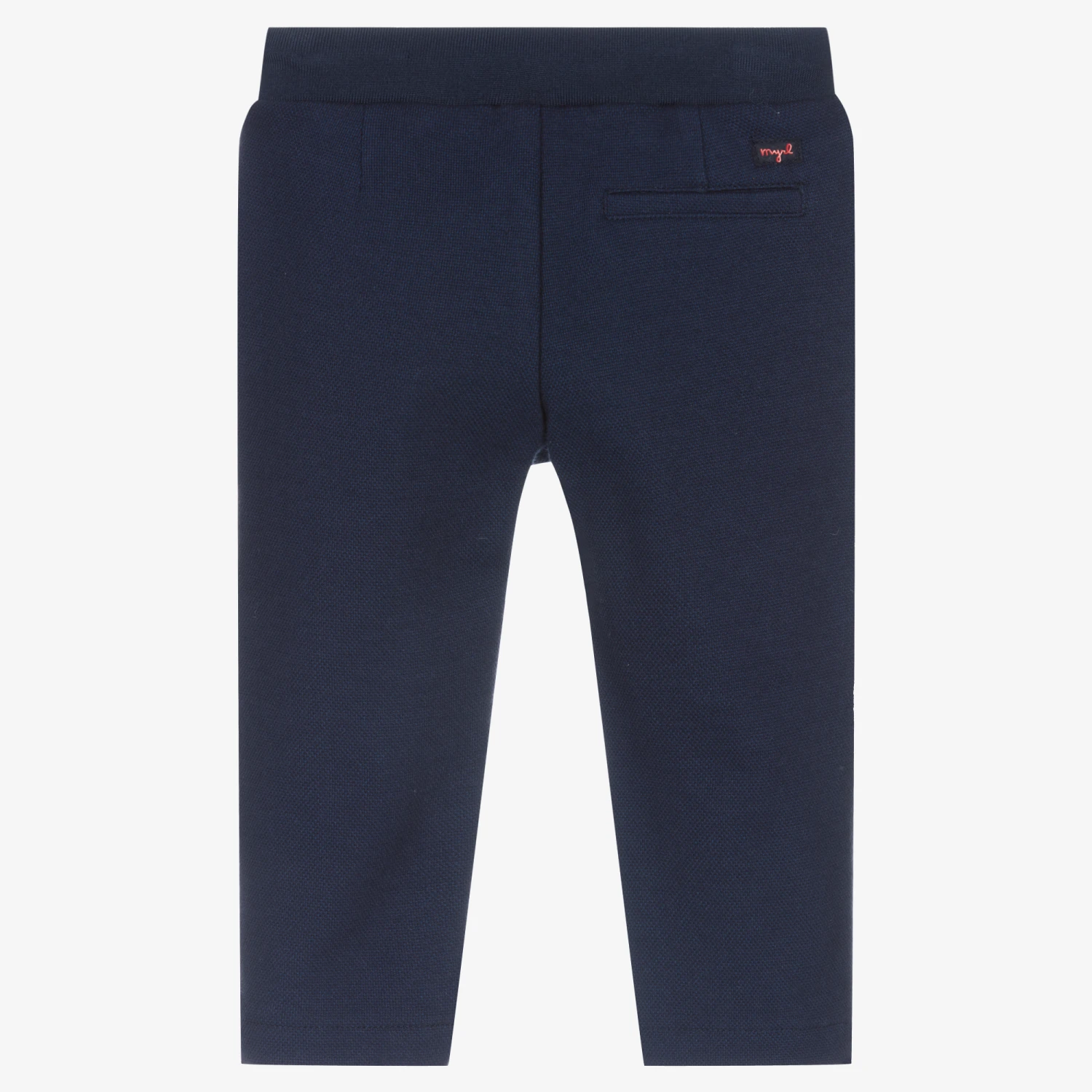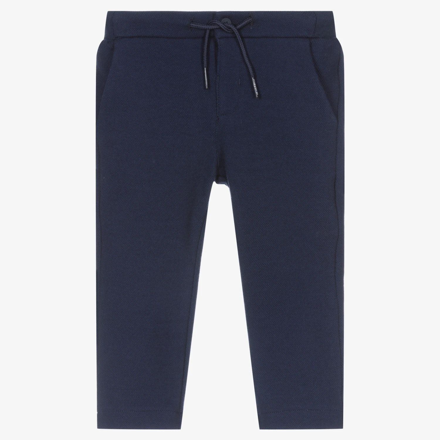 Smart blue trousers for little boys by Mayoral, made in soft and stretchy textured cotton. In a slim chino fit, they have three pockets and a subtle red logo detail on the back. They fasten with a single button and have a drawstring waist.