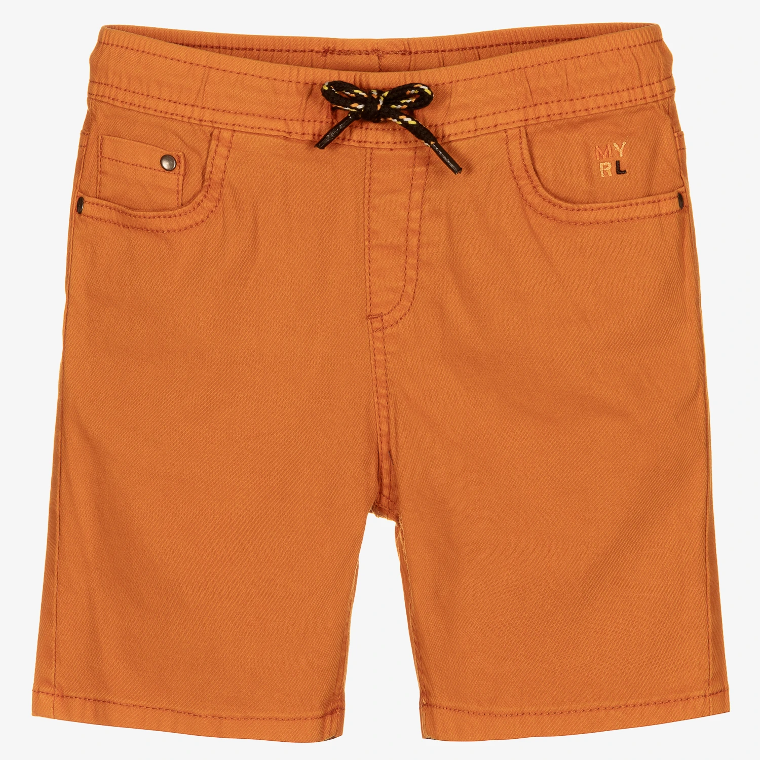Orange shorts for boys by Mayoral, made in soft cotton twill. They are in a classic five-pocket design and have a drawstring waistband. They have colourful logo embroidery on one hip, with a logo tag on the back.