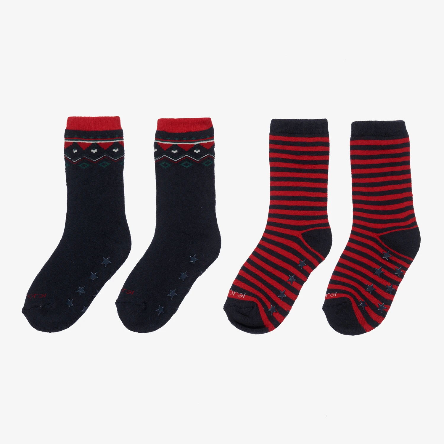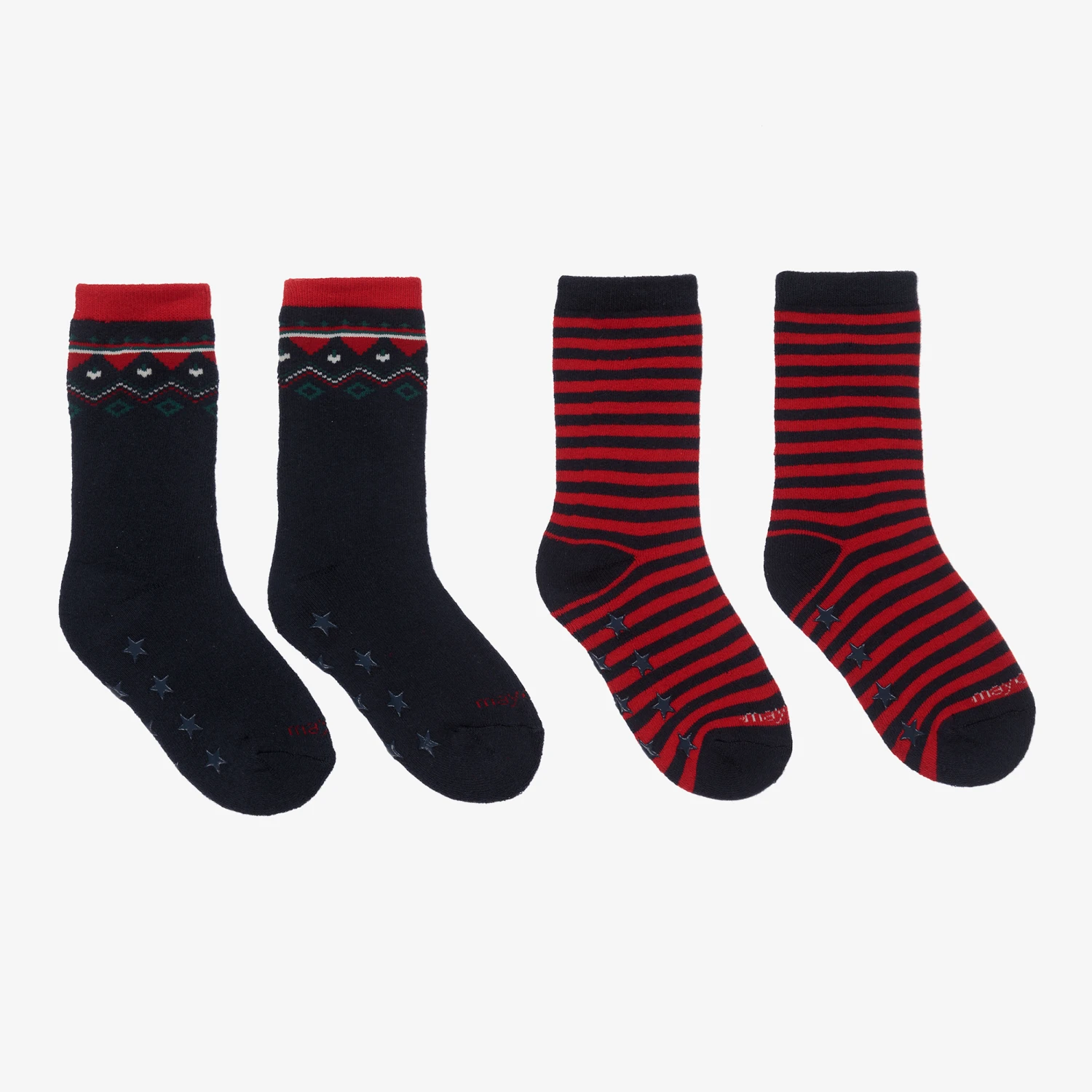 Pack of two pairs of red and navy blue cotton blend ankle socks for boys by Mayoral. One pair has a simple navy blue and red stripe, and the other pair has a festive Fair Isle trim around the ankle. Warm and cosy, these socks both have navy blue star-shaped anti-slip pads on the soles to prevent slipping. They are made with organic cotton in conversion.