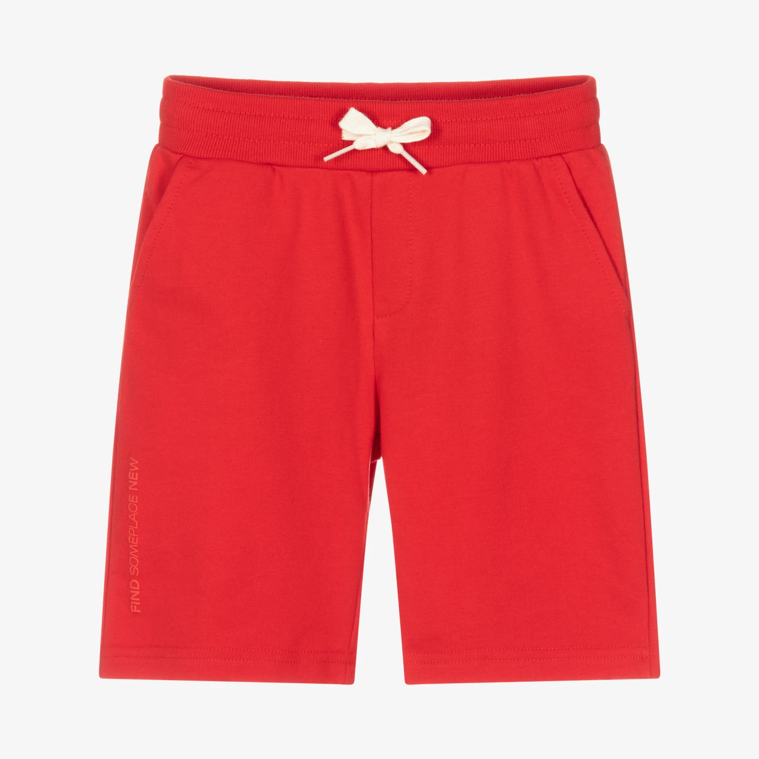 Casual and comfortable for boys, these red jersey shorts are by Mayoral Nukutavake. Made in a soft cotton blend, they have a drawstring waist for a great fit, useful pockets, and ‘Find someplace new’ in raised tonal print on one leg.