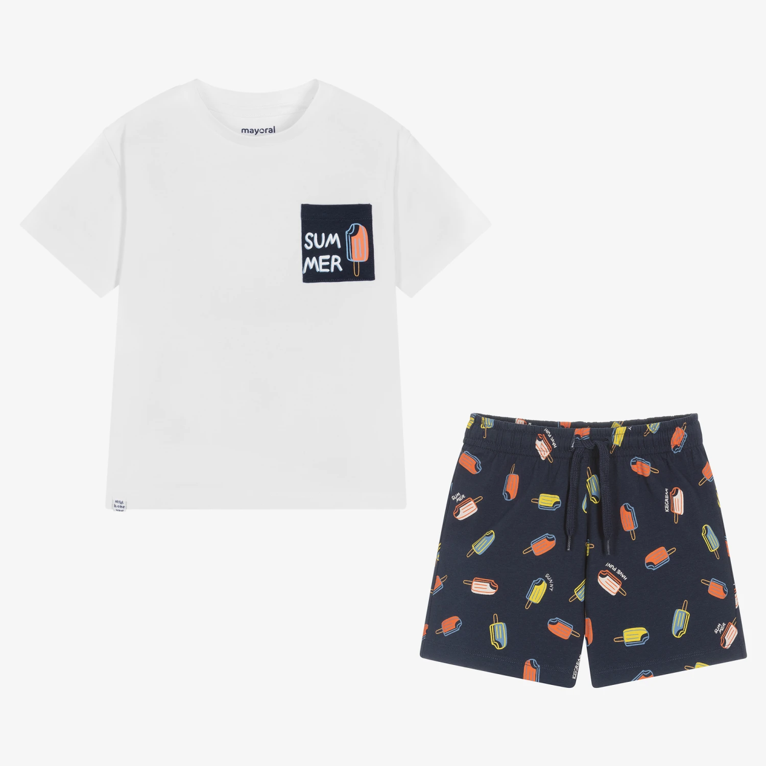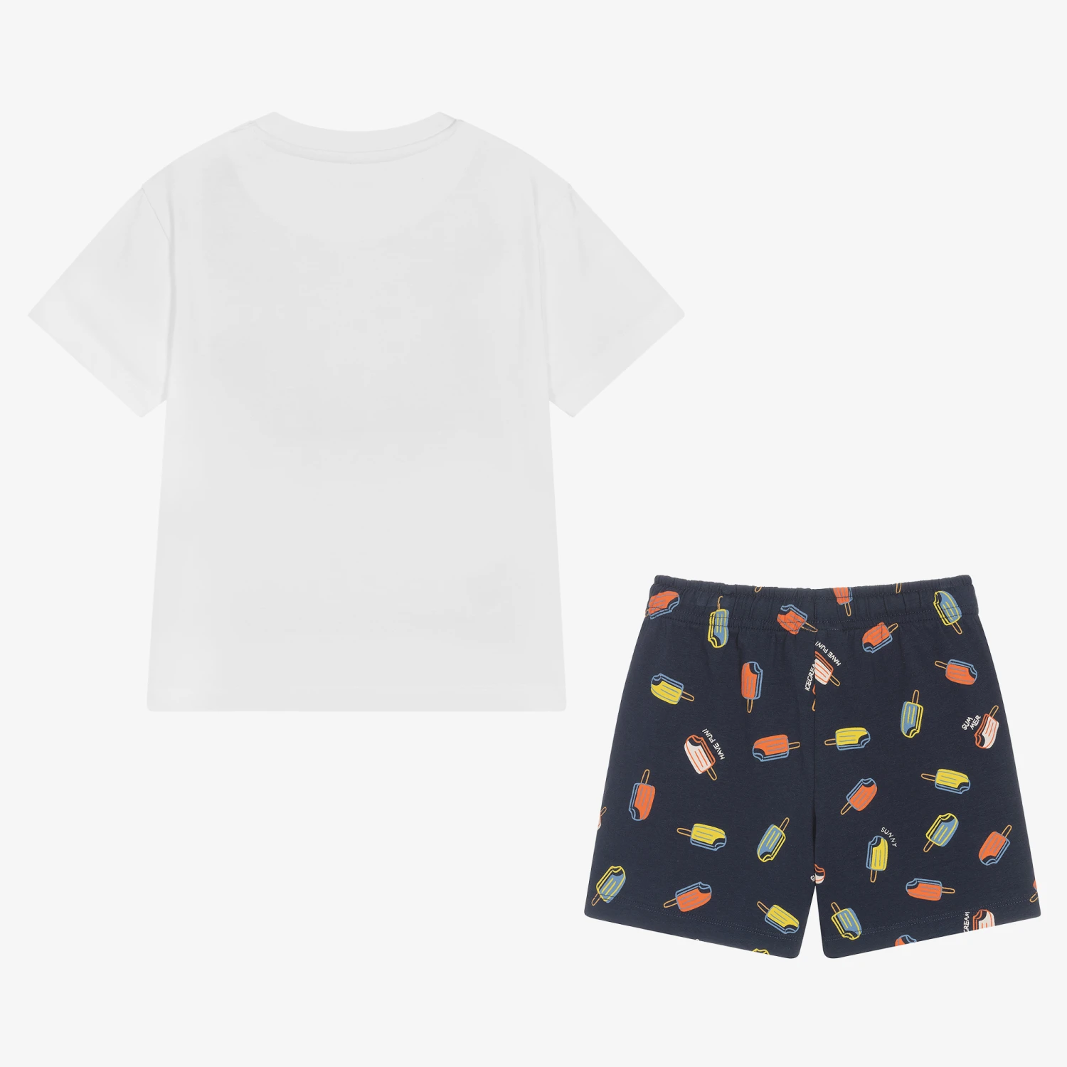 White and navy blue short pyjamas for boys by Spanish brand Mayoral, made in comfortable sustainable cotton jersey. The T-shirt has a chest pocket with the word ‘summer’ and an orange ice lolly print. The shorts have a drawstring waist for a good fit and a coordinating, colourful ice lolly pattern.