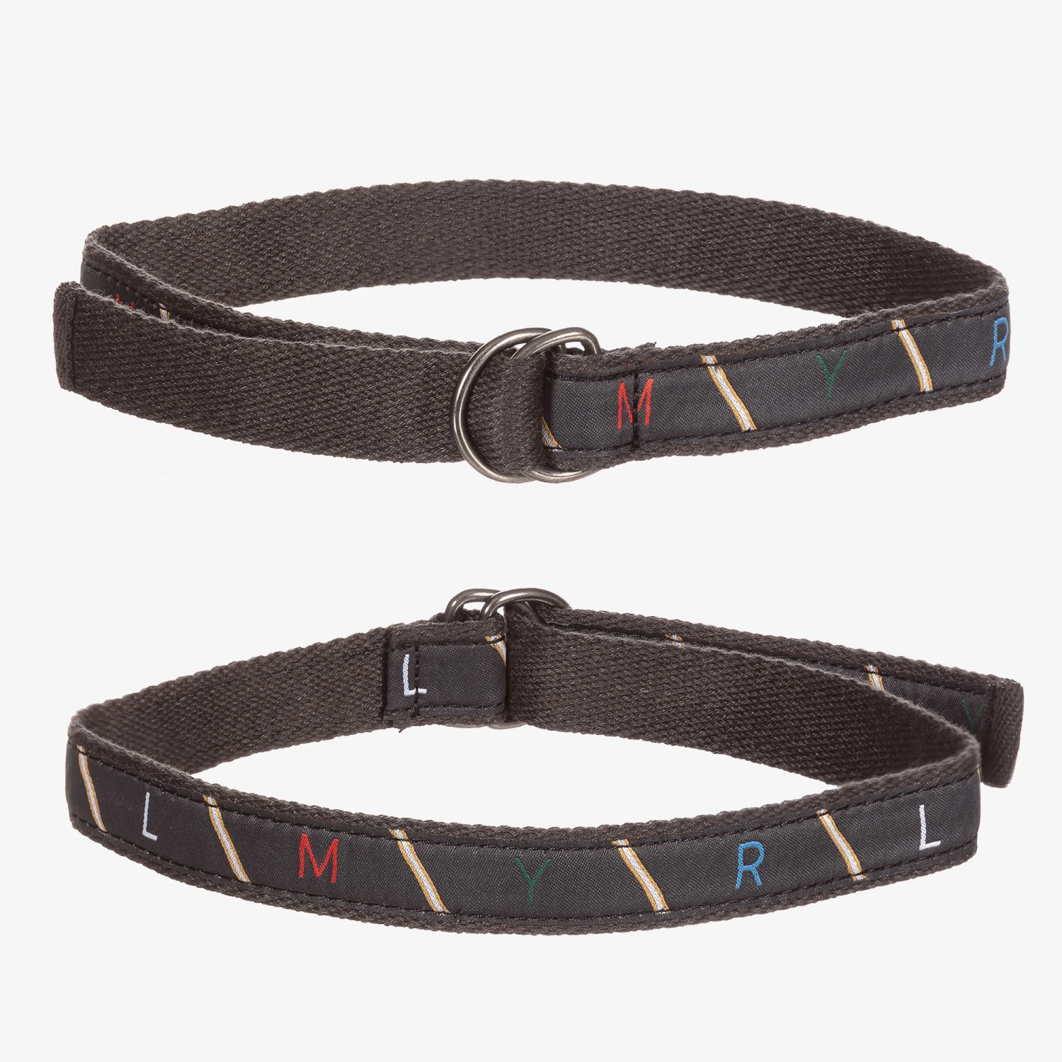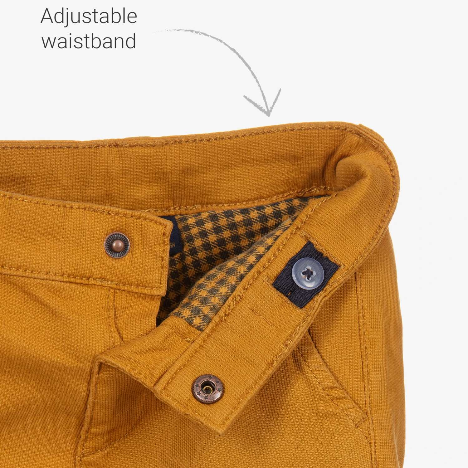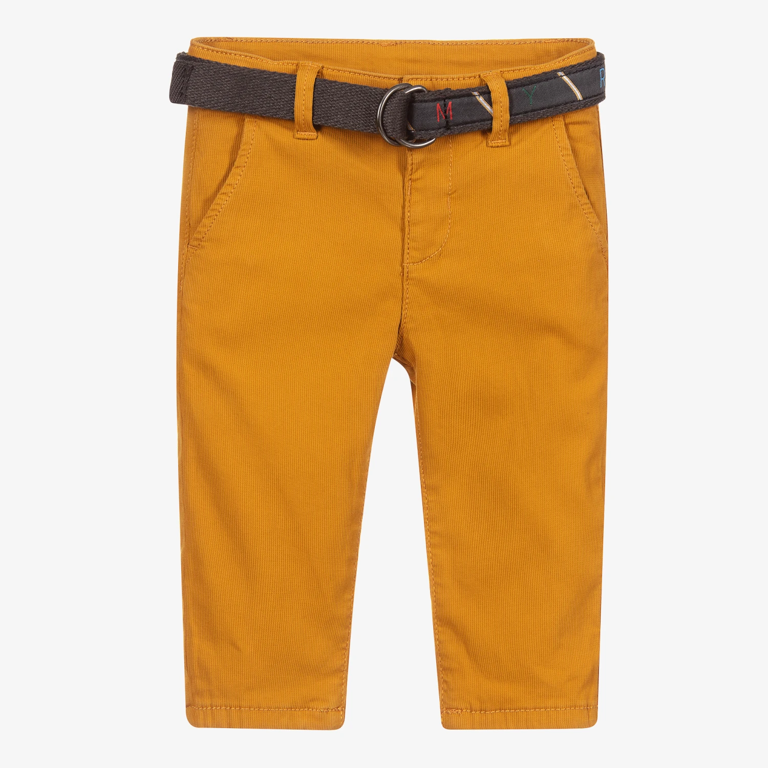 Younger boys dark yellow chino trousers by Mayoral. Made in slightly ridged cotton with a soft jersey lining, they have a regular fit and a useful, adjustable waistband. They come with a dark grey, logo patterned canvas belt.