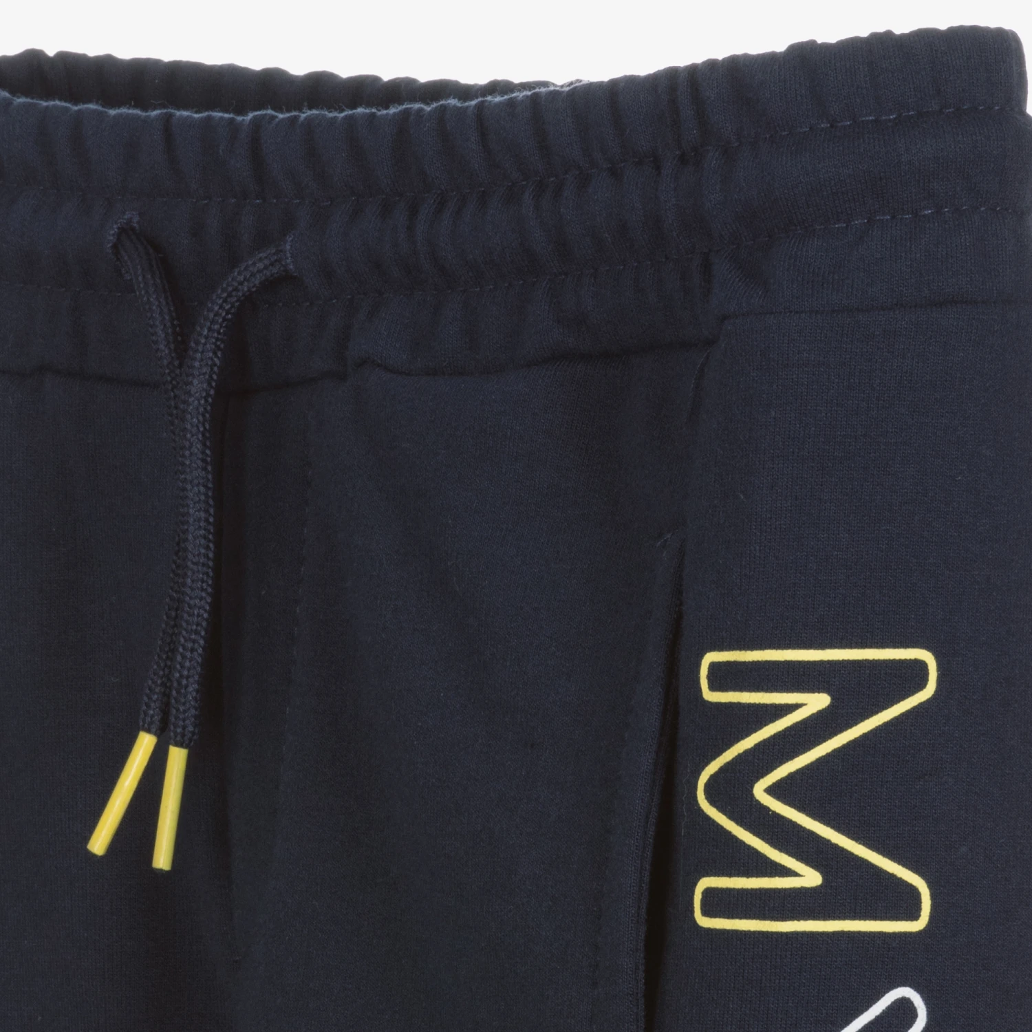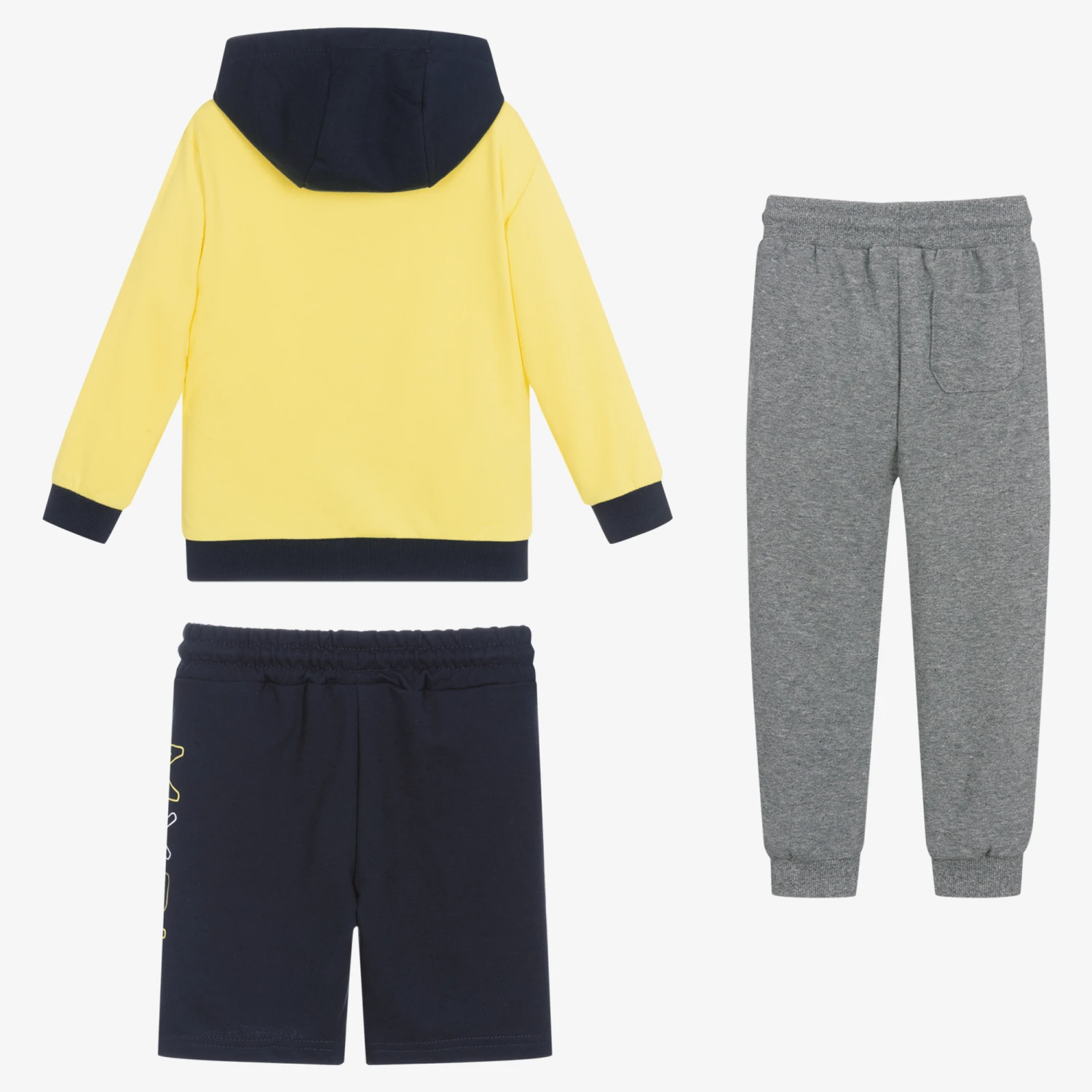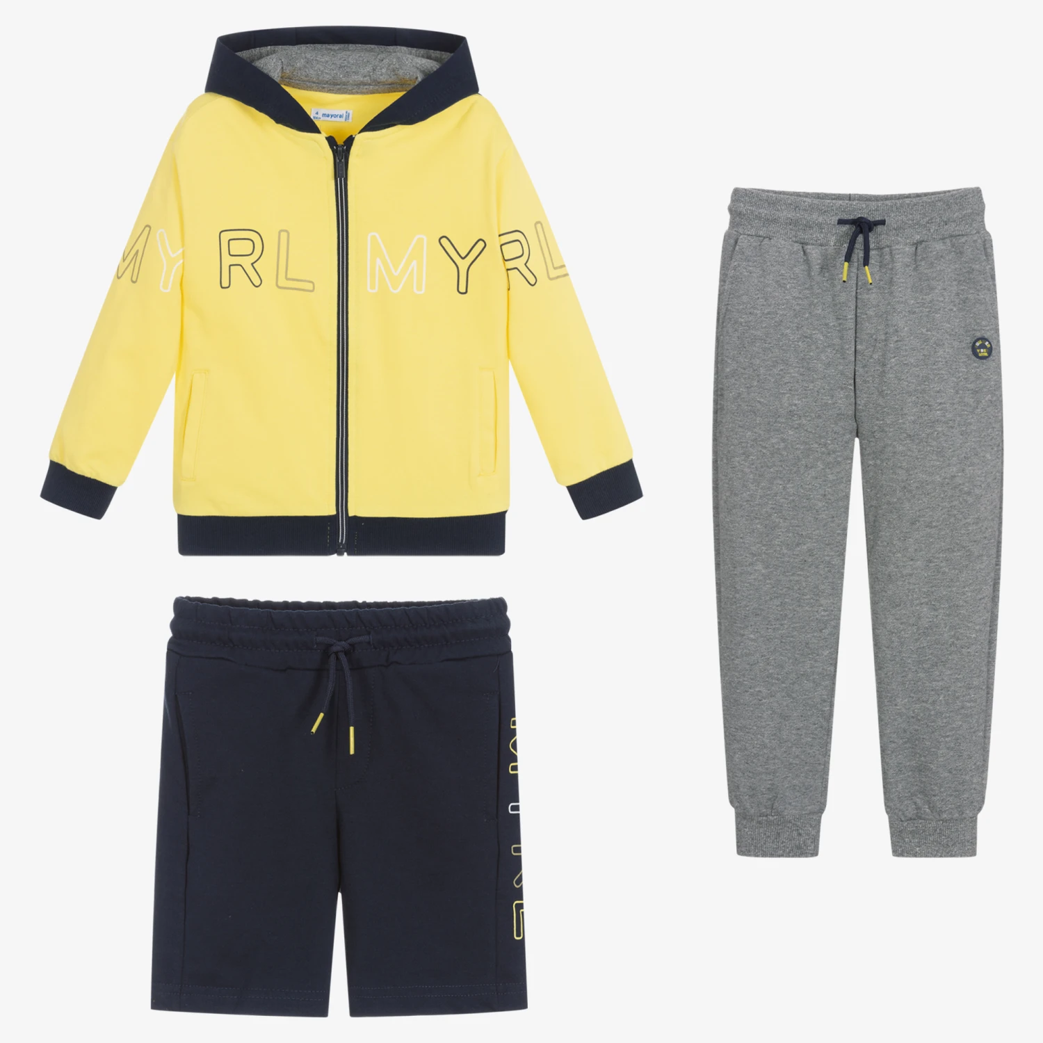 Boys yellow and grey marl three-piece tracksuit set by Mayoral, made in stretchy and medium-weight cotton-mix jersey. The zip-up hoodie has useful front pockets, a grey jersey-lined hood and logo lettering across the front and sleeves in blue, white and grey. The navy blue shorts have side pockets, a matching logo graphic and a drawstring waist for a good fit. Comfortable and practical, the cuffed joggers have a logo patch, front pockets and extra-durable knees.