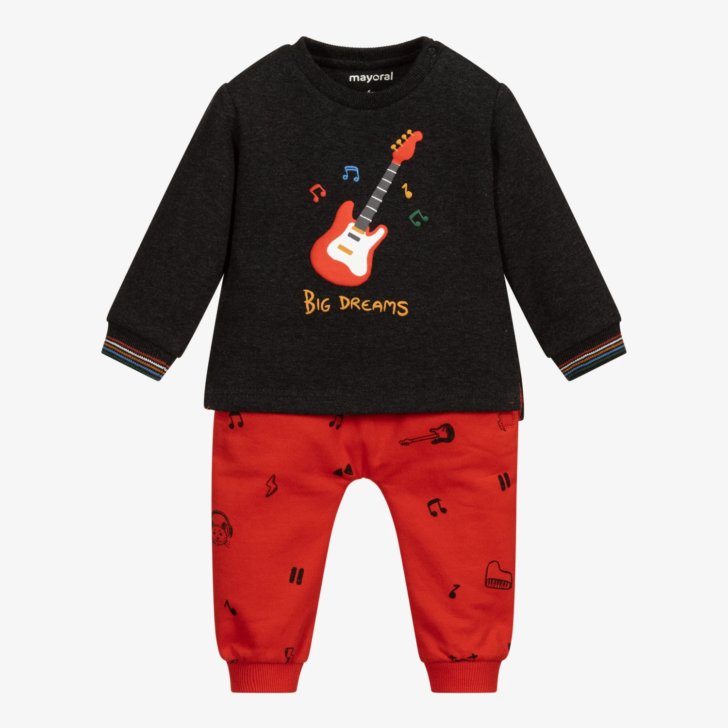 Cute tracksuit for younger boys by Mayoral, made in cotton jersey with a fleecy inside. The dark grey sweatshirt has a rubberised print of an orange guitar on the front and colourful striped cuffs. The orange joggers have a grey music-inspired print, extra durable knees and a useful drawstring waistband.