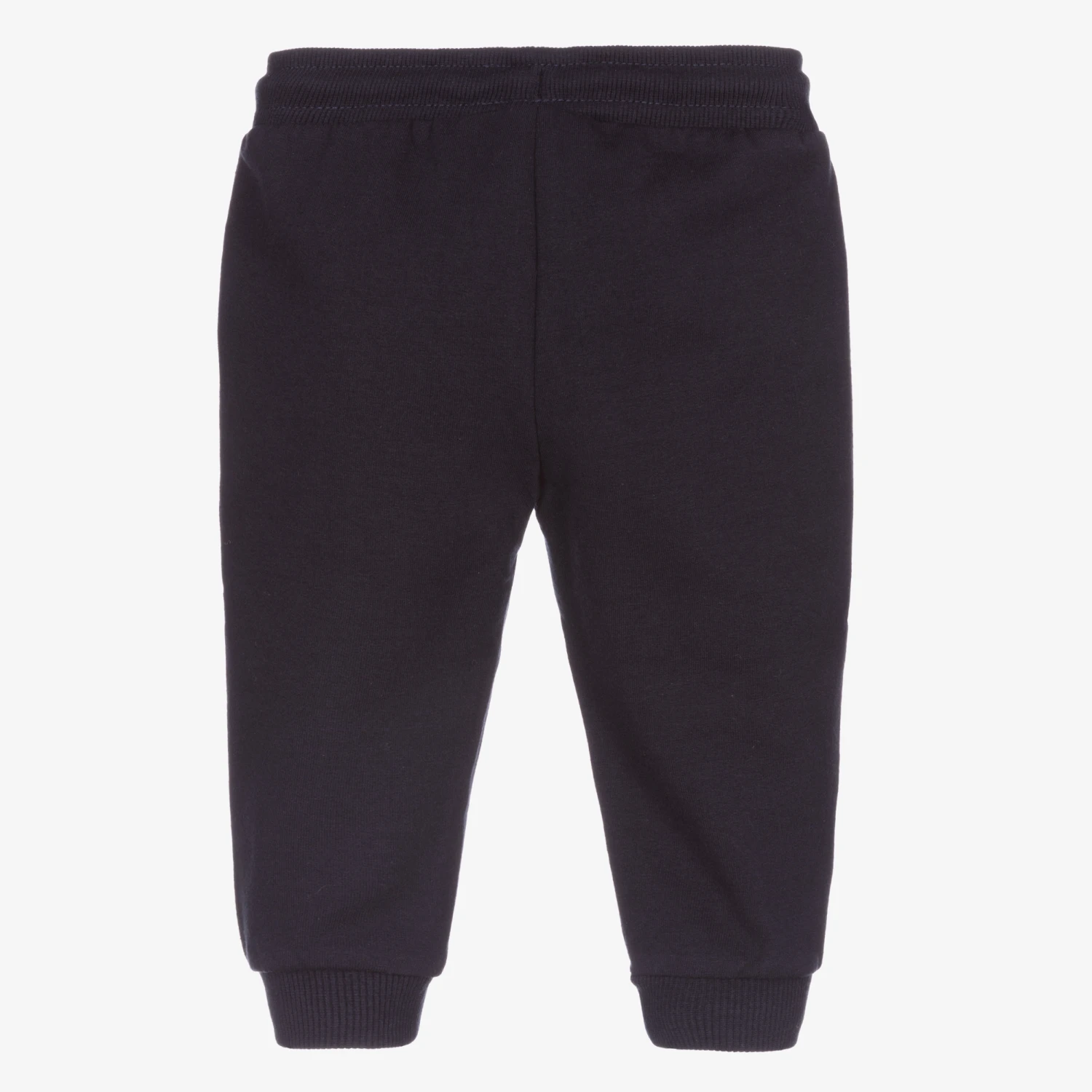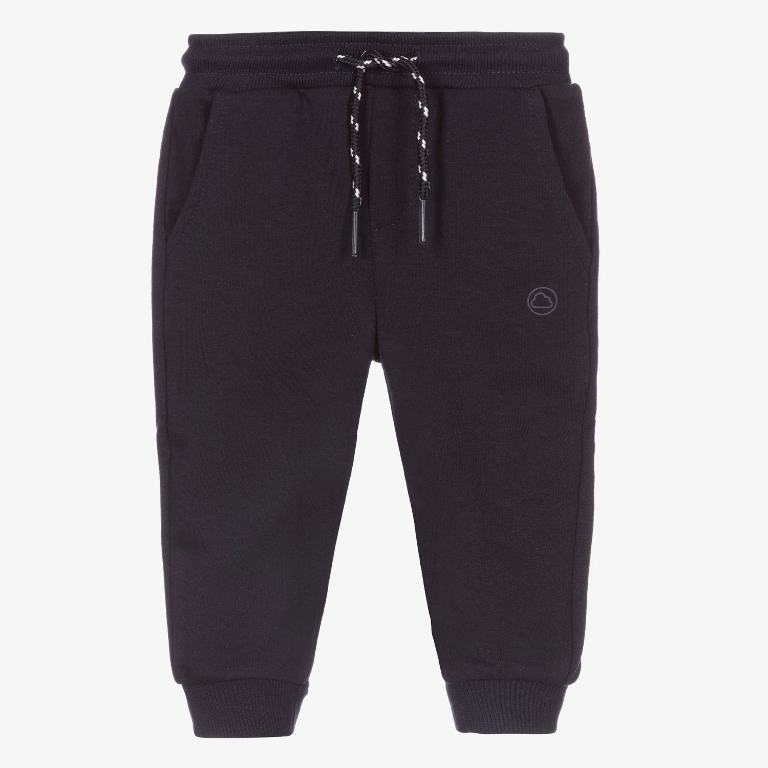 Navy blue joggers for little boys by Mayoral, made in soft polycotton jersey. With a drawstring waist, they have two slanted pockets and a small navy blue logo print on the front.