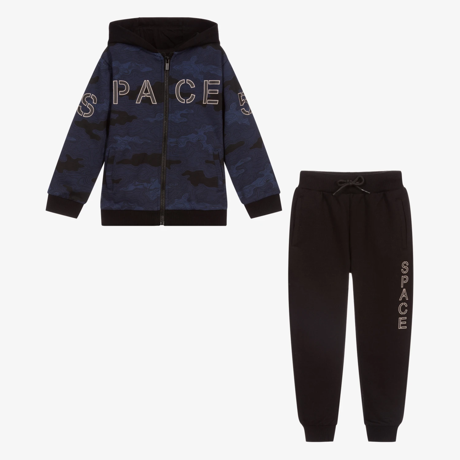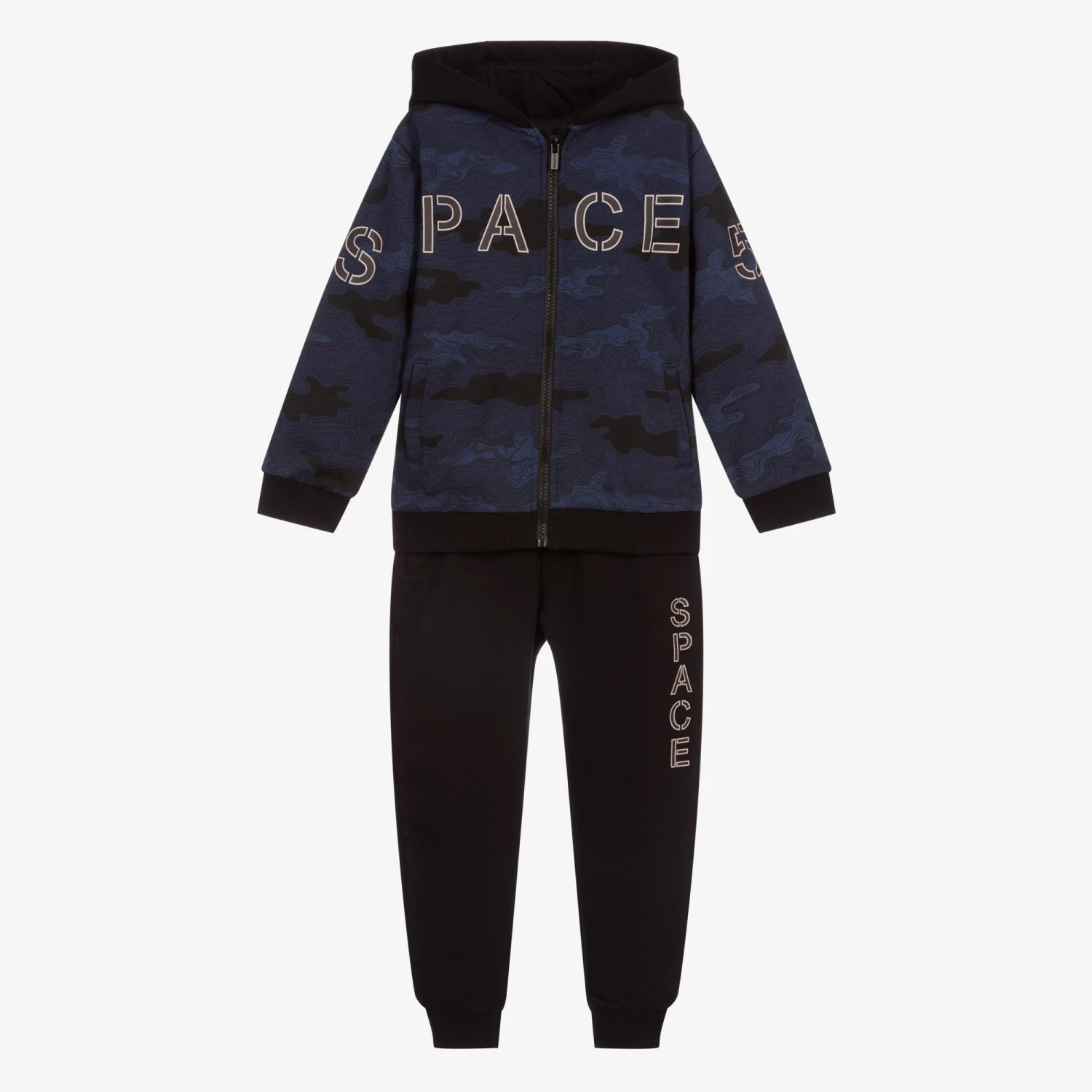 Navy blue and black cotton jersey tracksuit for boys by Mayoral. The navy blue zip-up top has a black hood, with a camo pattern throughout and a space motif across the chest. The black joggers have a matching motif on one leg, a drawstring waist and extra durable knees.