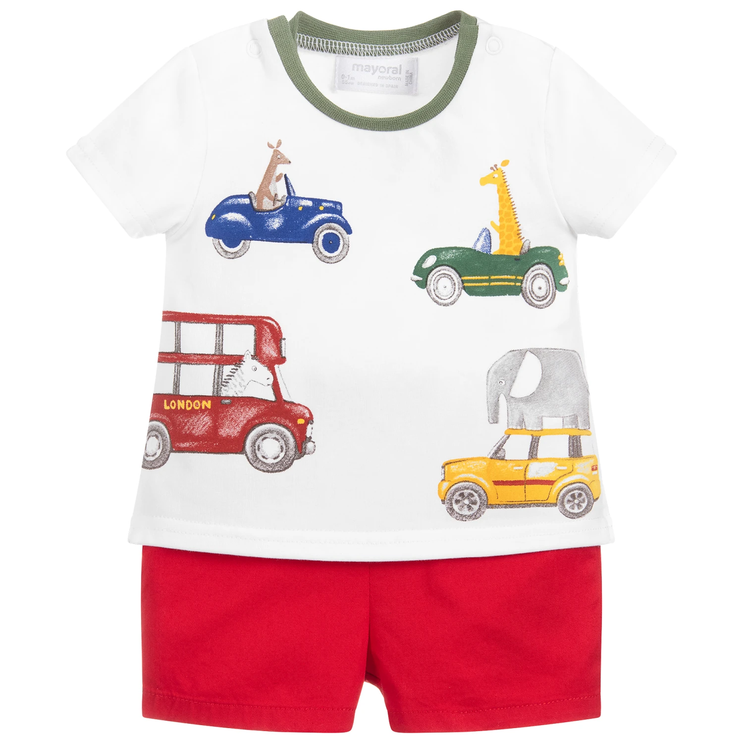 Red and white T-shirt and shorts set for baby boys and girls by Mayoral, with a fun animal and vehicle print. The jersey T-shirt has poppers on the shoulders, and the red shorts have a grey ribbed waistband with a faux drawstring.