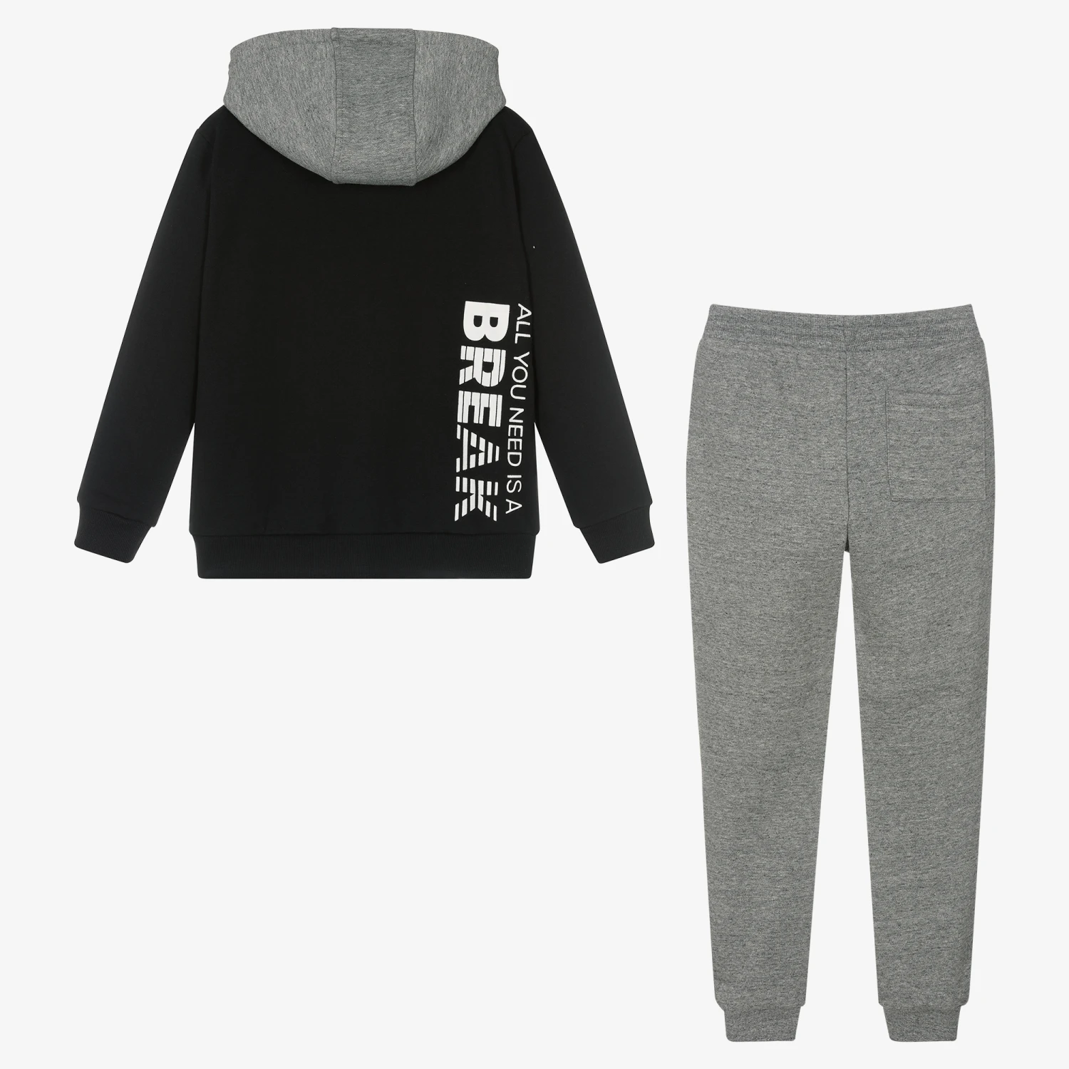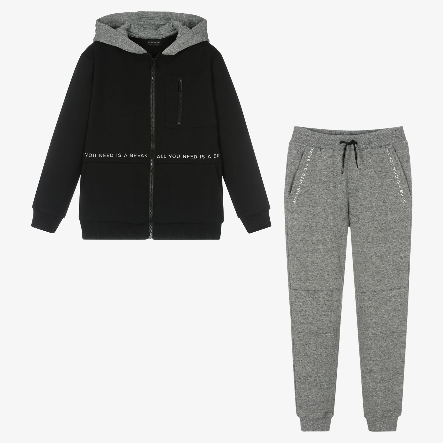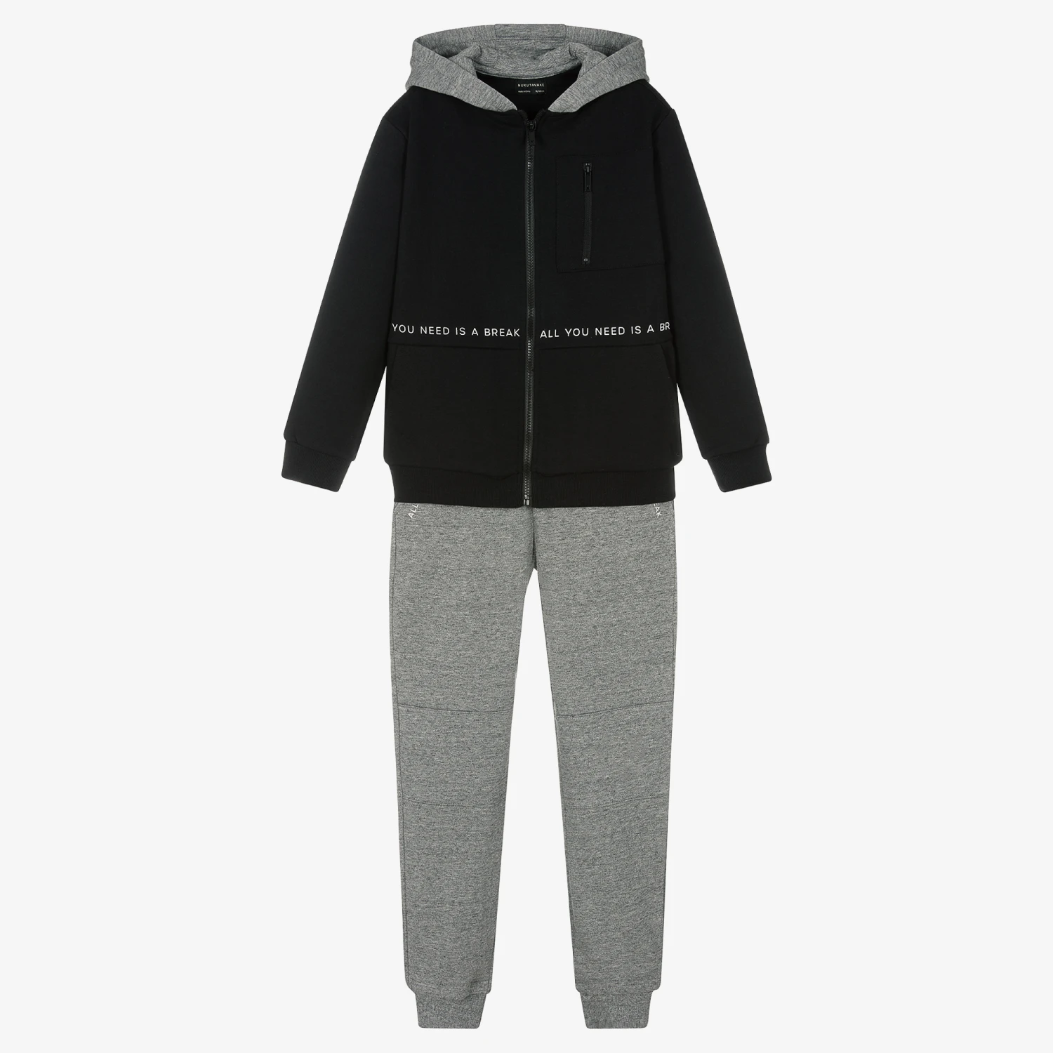 Boys black and grey tracksuit by Mayoral Nukutavake. Made in mid-weight sweatshirt jersey, the hooded top is zip-up and has a zipped chest pocket and hand pockets, with a slogan print in white on the front and back. The matching joggers have an adjustable drawstring waist, and slanted side pockets. There is a matching slogan print and ribbed ankle cuffs.