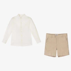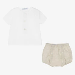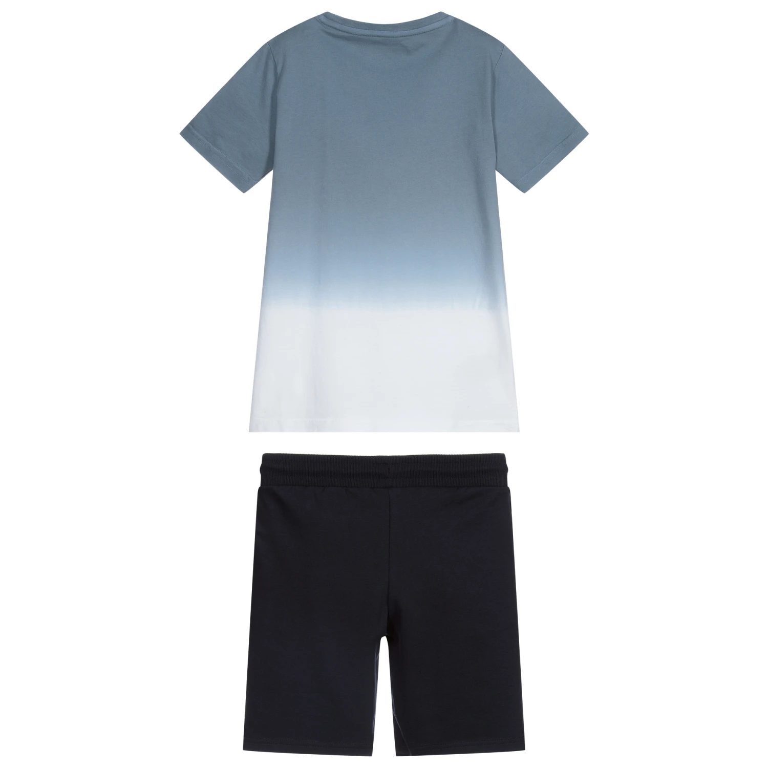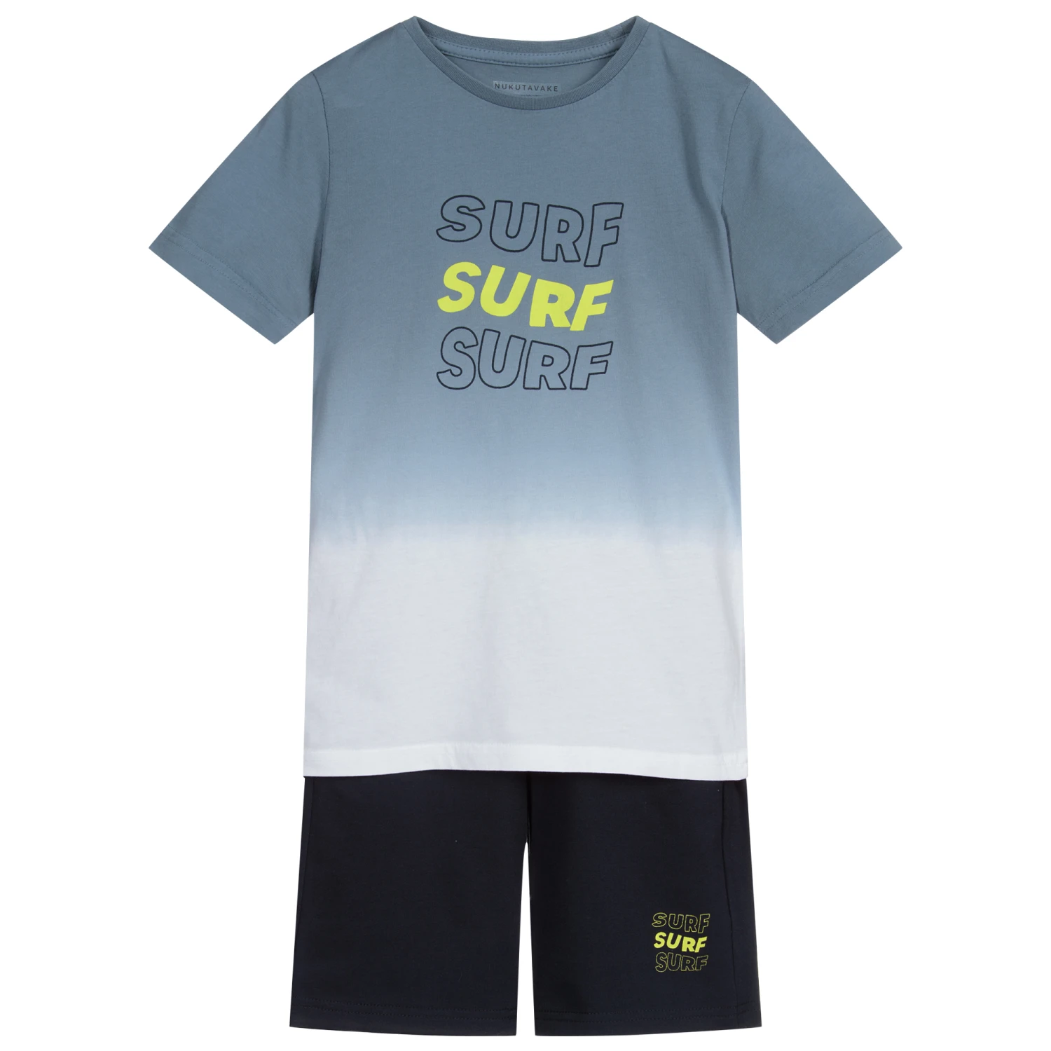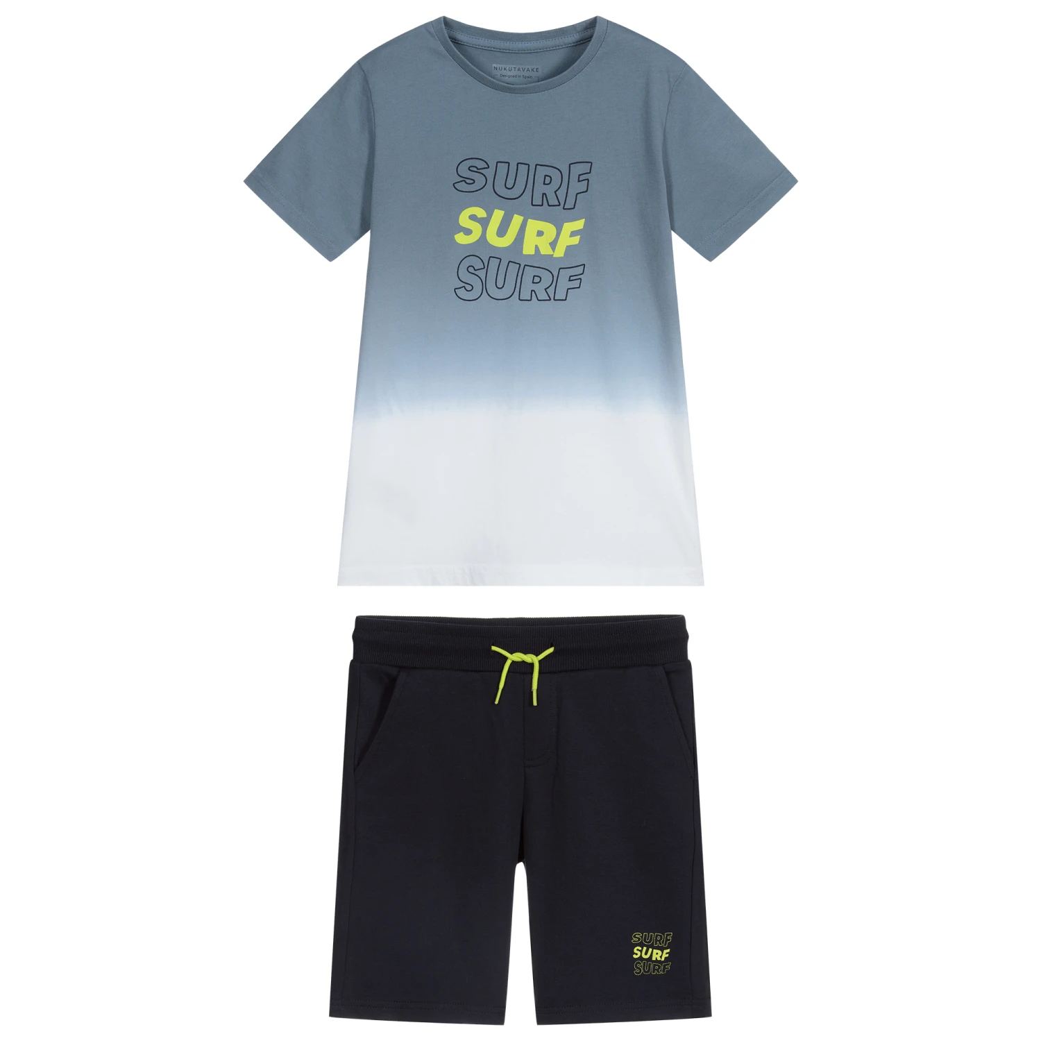 Blue shorts set for boys by Mayoral, made in soft cotton jersey. The ombre T-shirt fades from blue-grey at the top to white at the hem. The navy blue shorts have a ribbed waistband with a neon yellow drawstring tie and useful side pockets. Both pieces have ‘surf’ prints in navy blue and neon yellow.