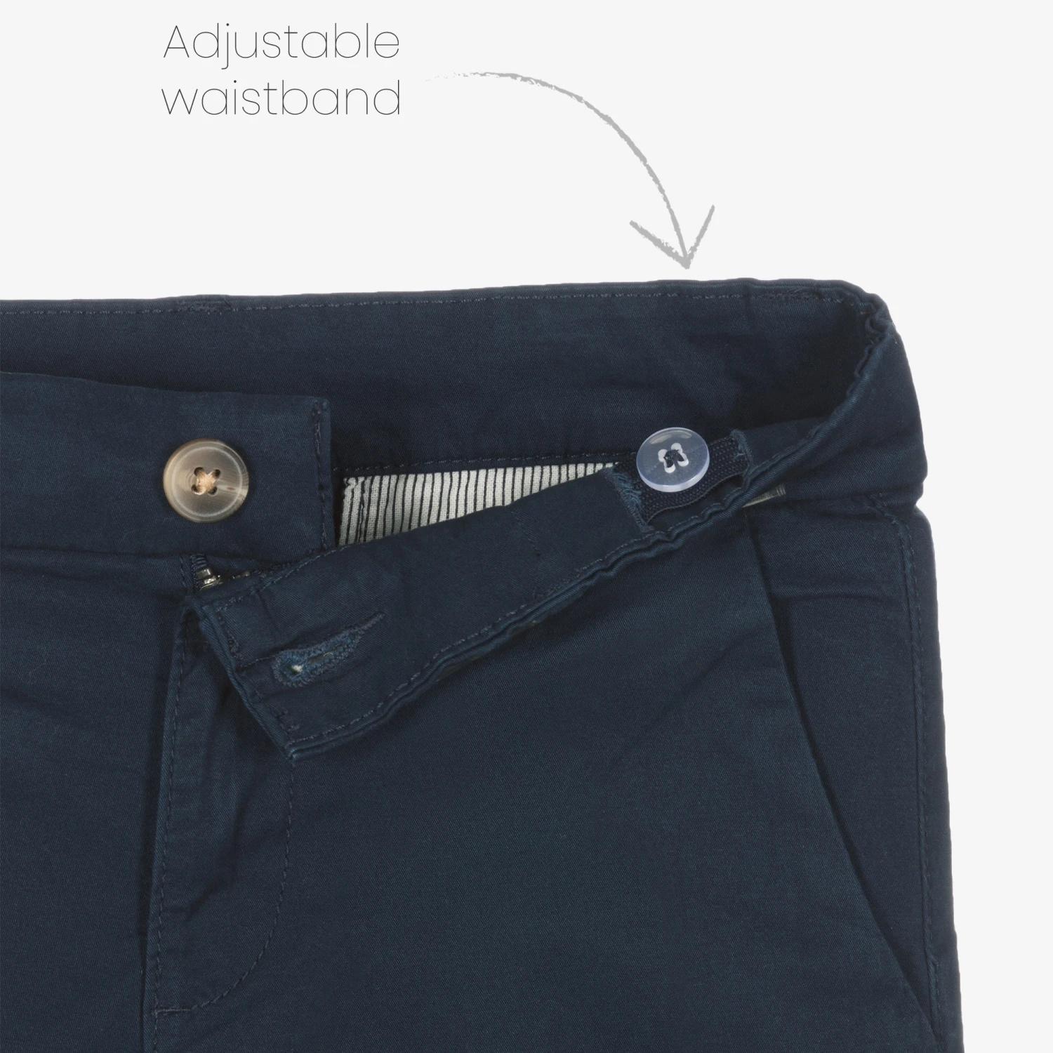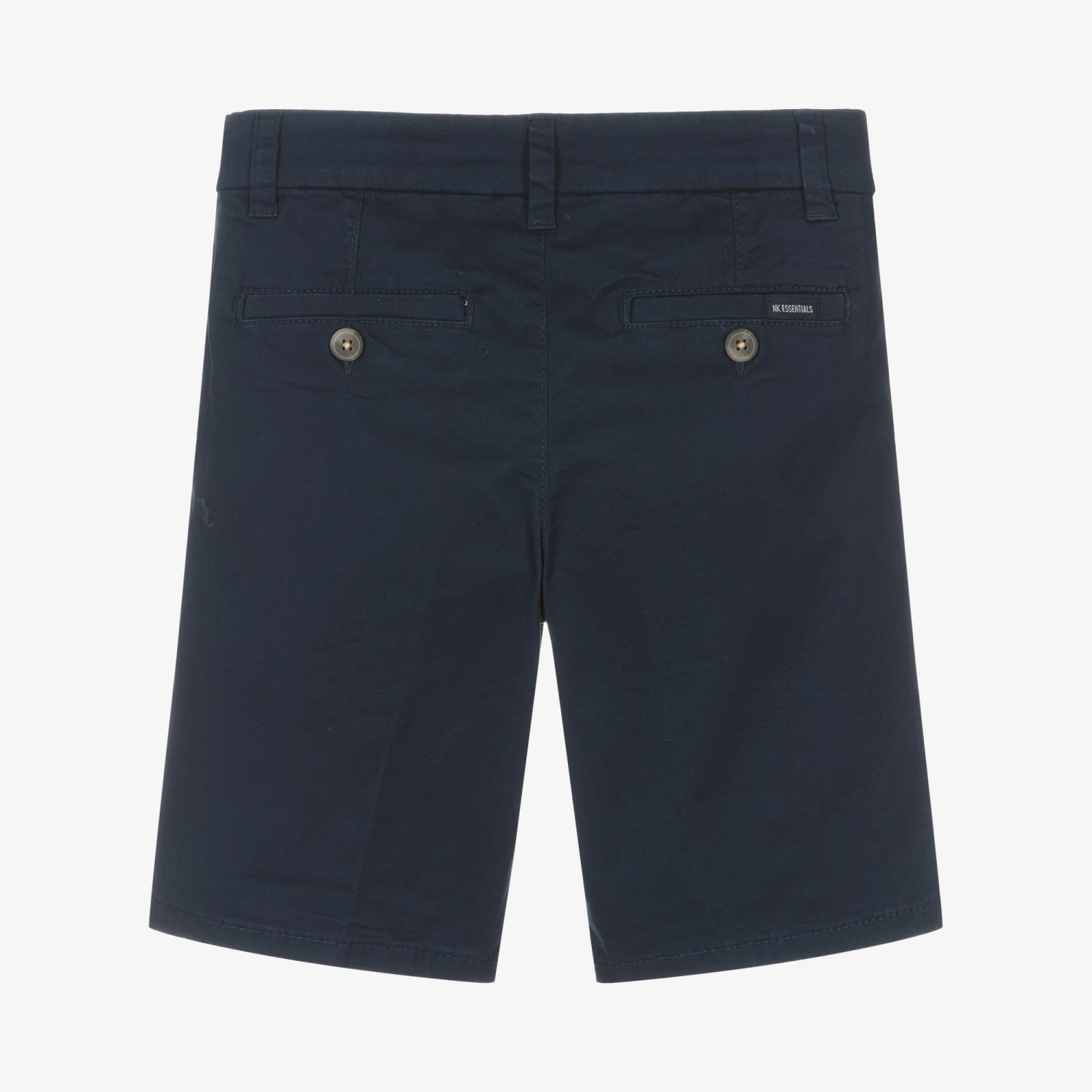 Smart casual navy blue shorts for boys by Mayoral Nukutavake, made from sustainable cotton twill with stretch. In a classic chino styling, they have two slanted front pockets, two buttoned pockets on the back and belt loops. With a button and zip on the front, the waistband is adjustable for a good fit.
