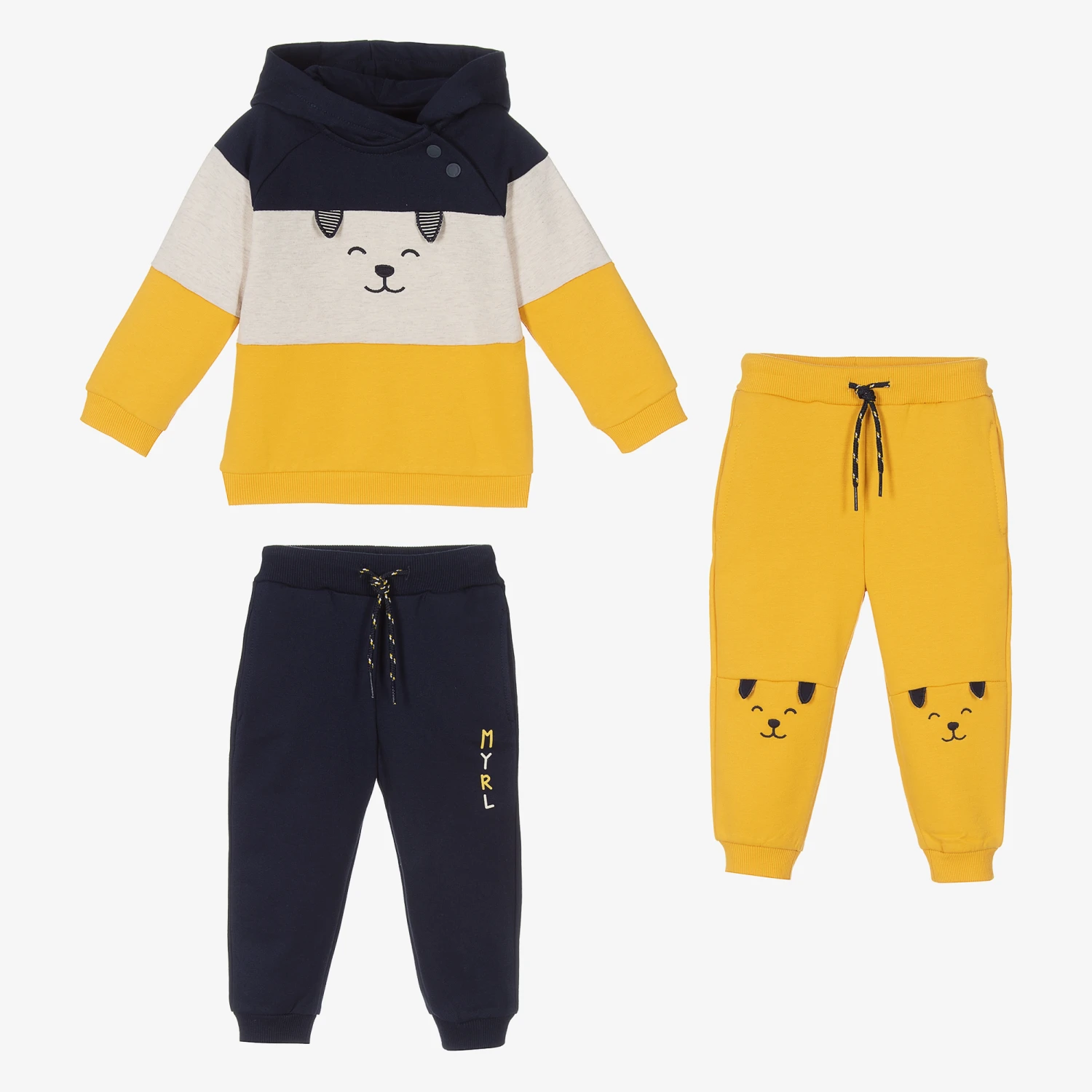 Little boys navy blue and yellow three-piece tracksuit set by Mayoral, made in stretchy cotton-blend sweatshirt jersey. The blue, beige and yellow colour block hoodie and yellow joggers have sweet embroidered little dog faces with 3D ears. The hoodie has popper fastenings on one shoulder for easy dressing. Both joggers have front pockets, extra durable knees and a comfortable elasticated, drawstring waist.